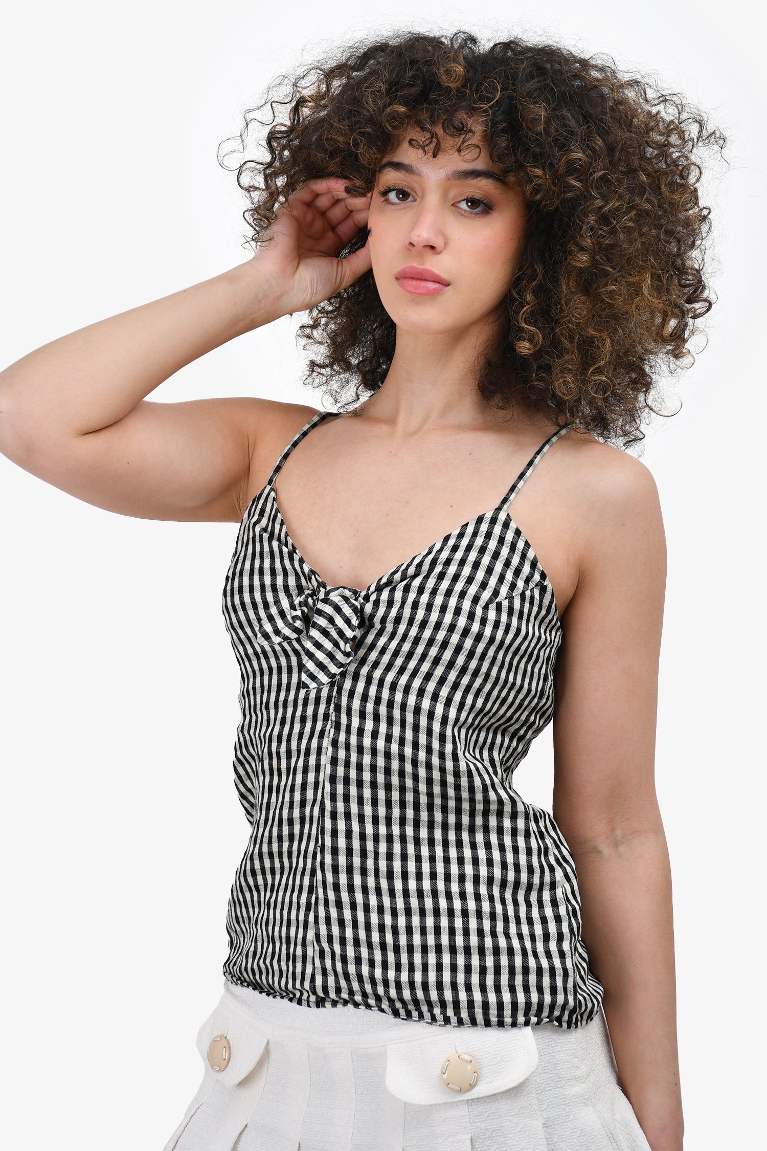 Refresh availabilityReformation Black/White Gingham Linen Sleeveless Top. Spaghetti adjustable straps. Sweetheart neckline with tie detailing. Tonal stitching.