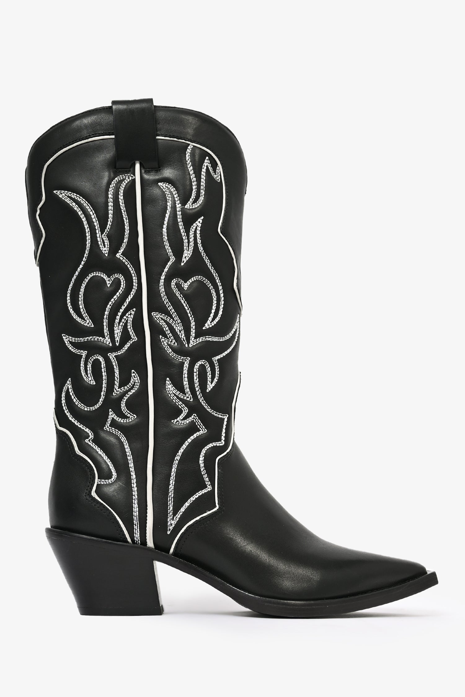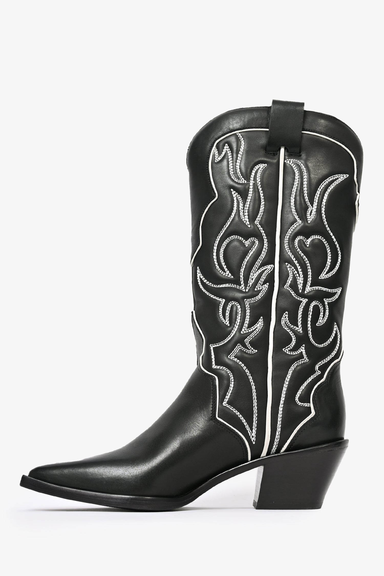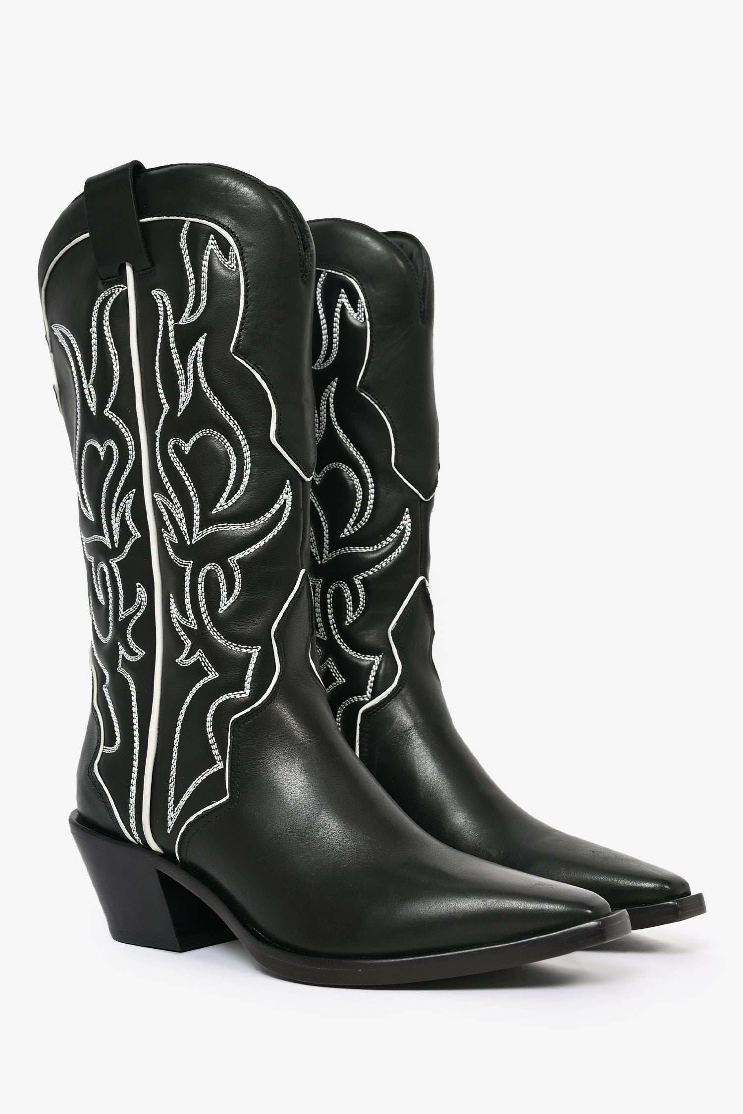 Refresh availabilityReformation Black/White Leather 'Olive Western' Boots. Pull-on. Tapered square toe. Curved heel.
