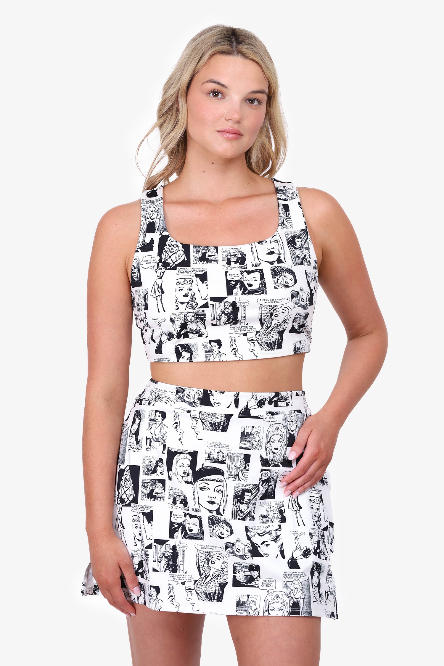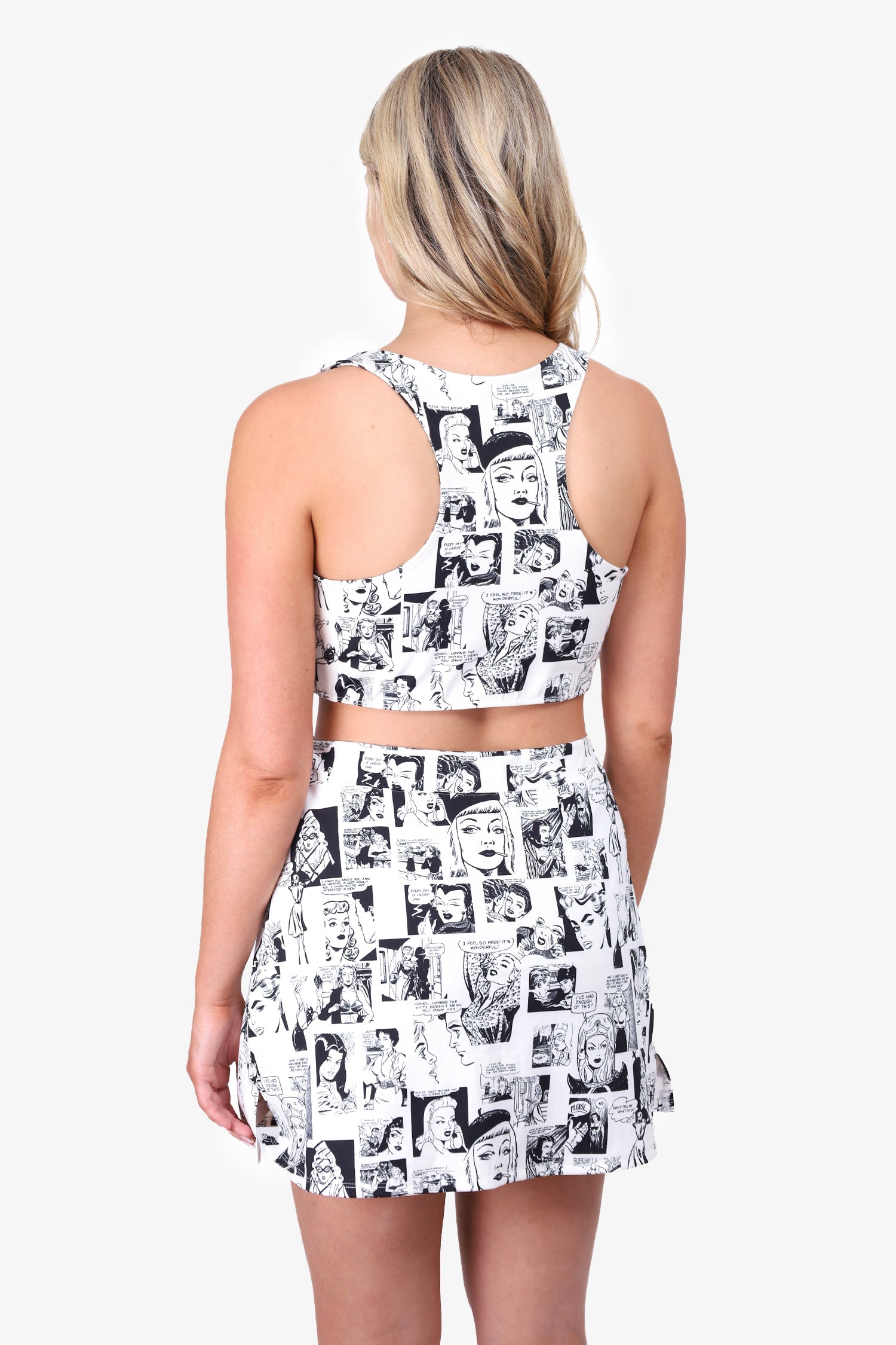 Refresh availabilityReformation Black/White Newsprint Skort Set. Round/square neckline. Elastic hem on top. Racer back. Stretchy waistband on bottoms. Built in shorts. Unlined. Contrast and tonal stitching.