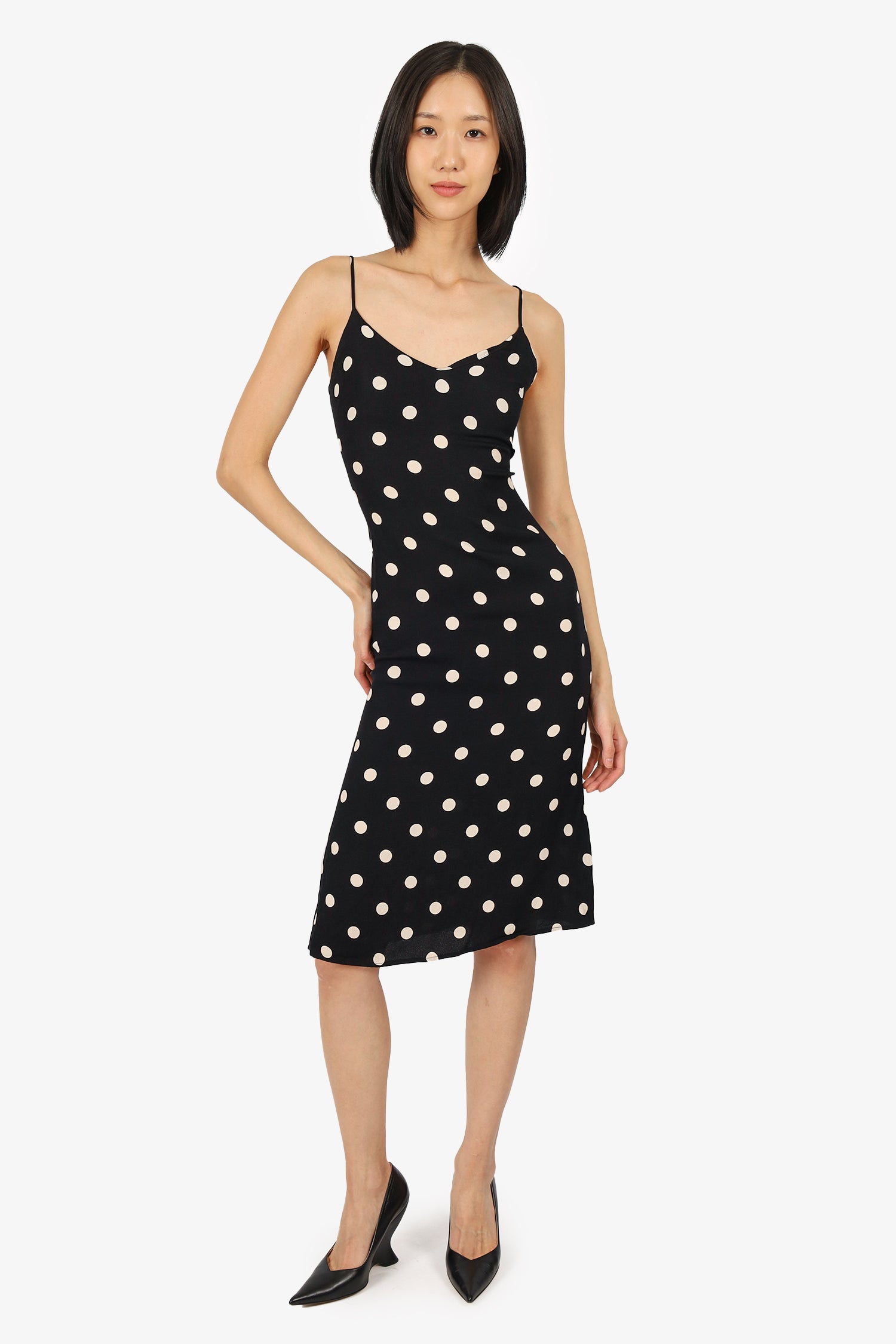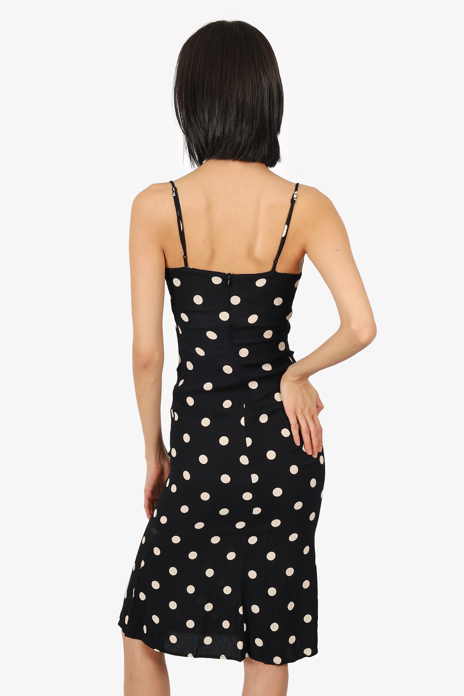 Refresh availabilityReformation Black/White Polka Dot Slip Dress. Slip-on. V-neckline. Rear zip closure. Adjustable shoulder straps with sliding buckle closure. Tonal stitching.