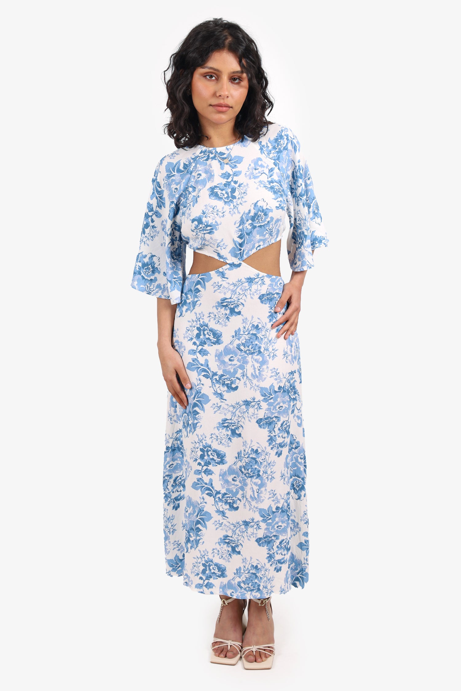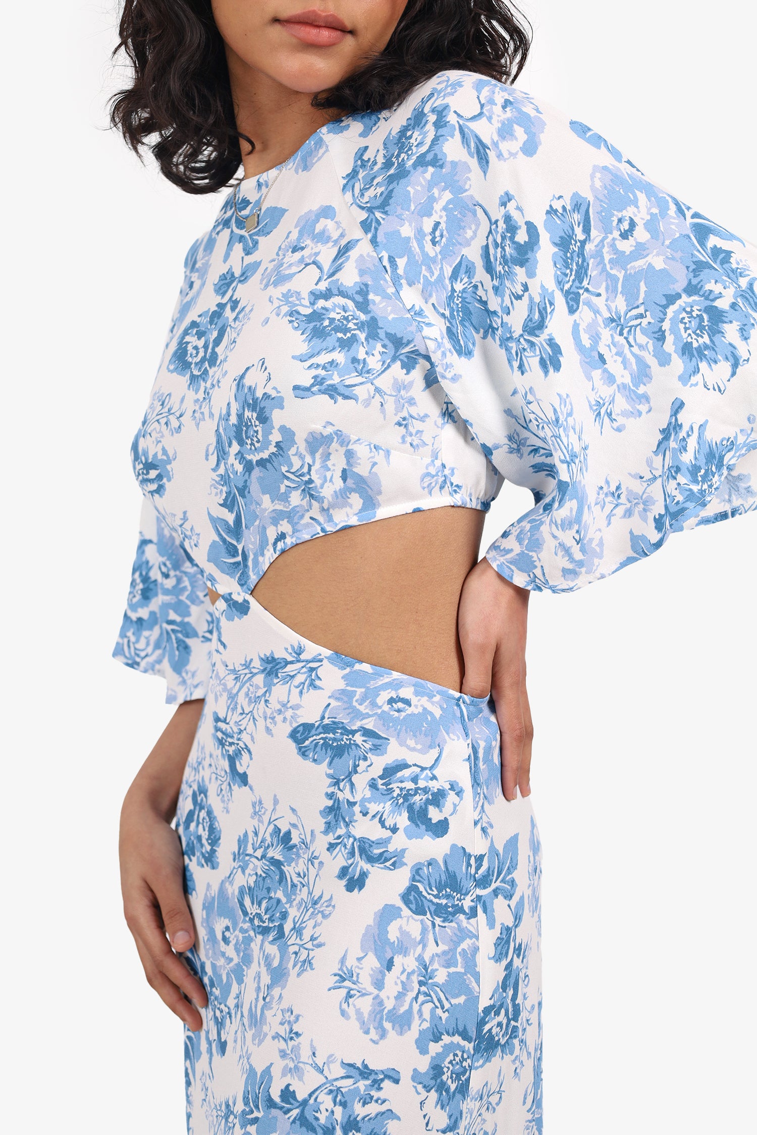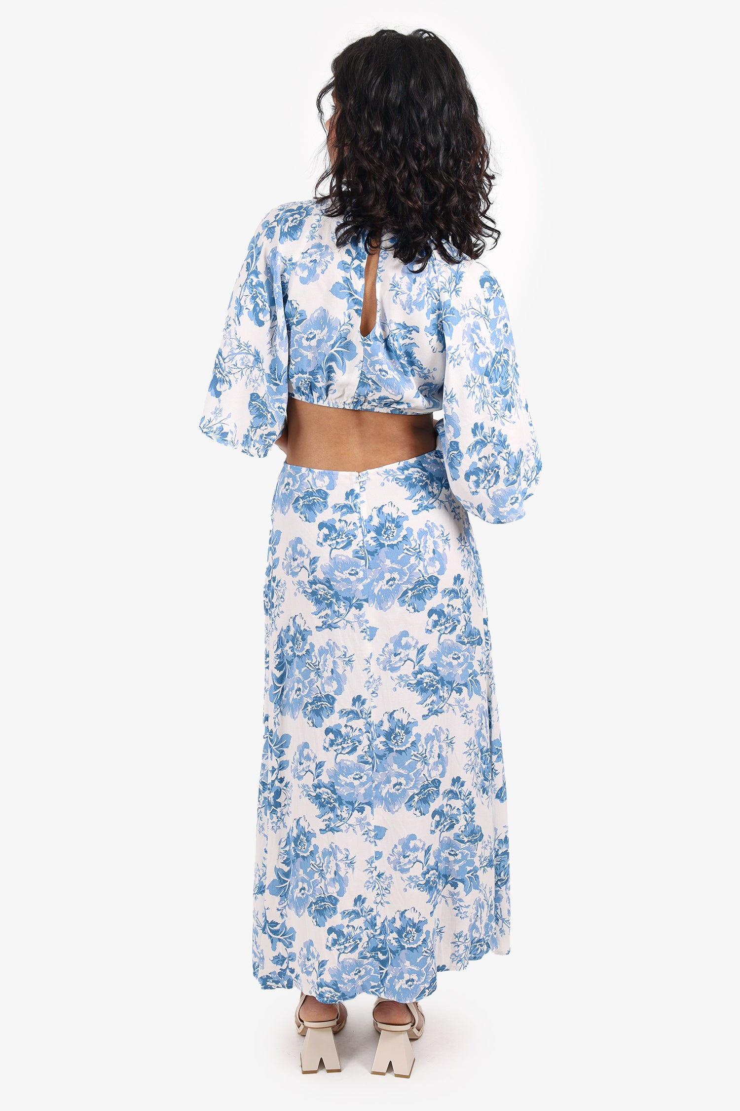 Refresh availabilityReformation Blue/White Floral Cut Out Midi Dress. Slip-on. Round-neckline. Front keyhole with button-up closure. Cut-outs on side and open back with elastication. Rear zip with hook closure. Tonal stitching.