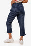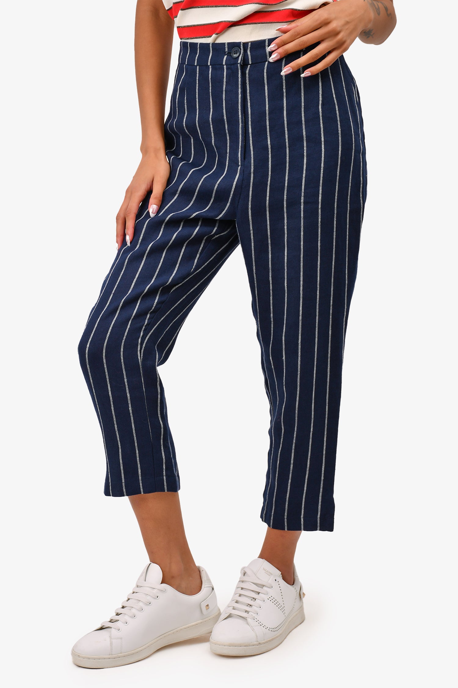 Refresh availabilityReformation Blue/White Linen Stripe Pants. Front zip and button closure. Faux front pockets.