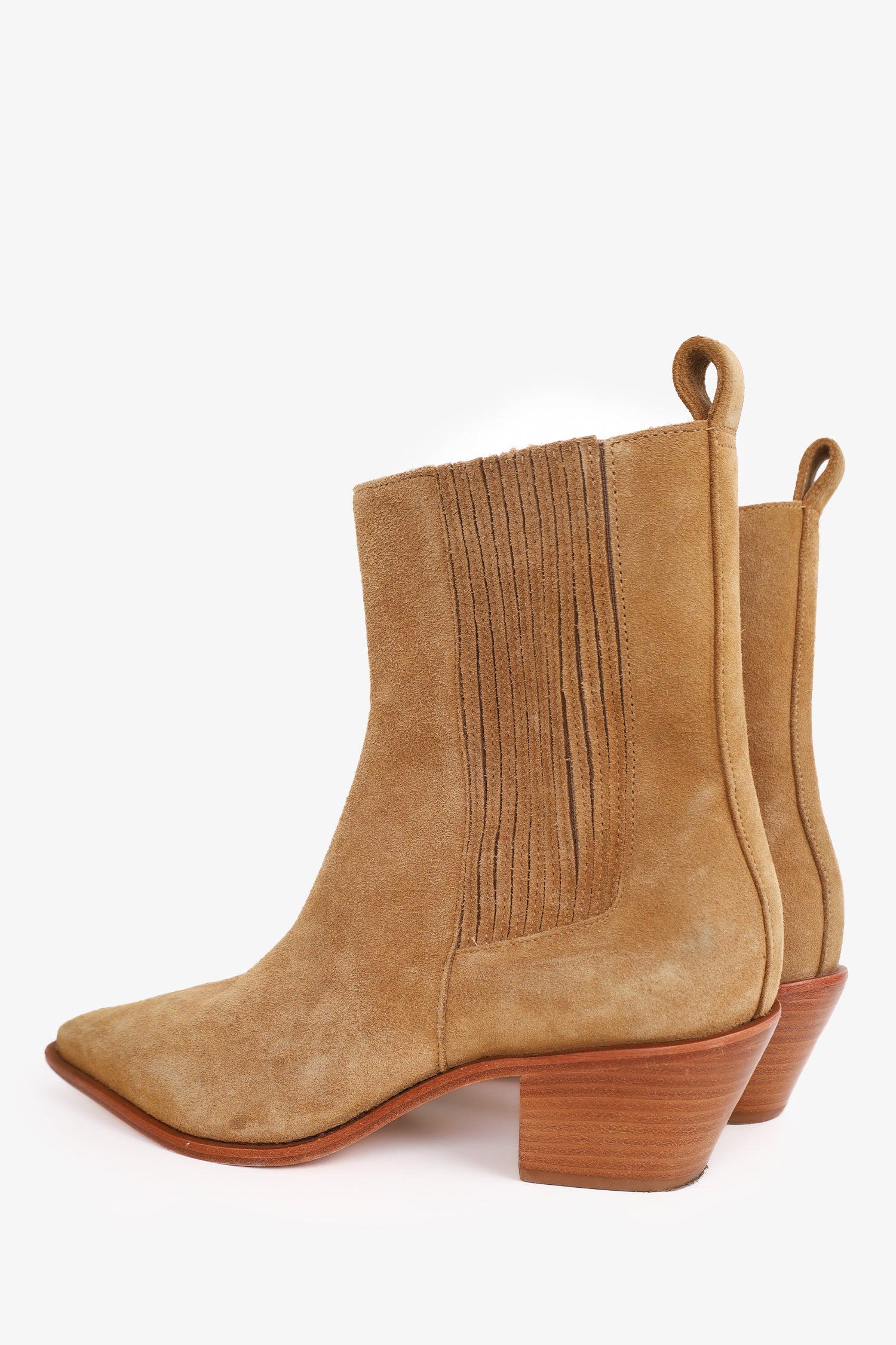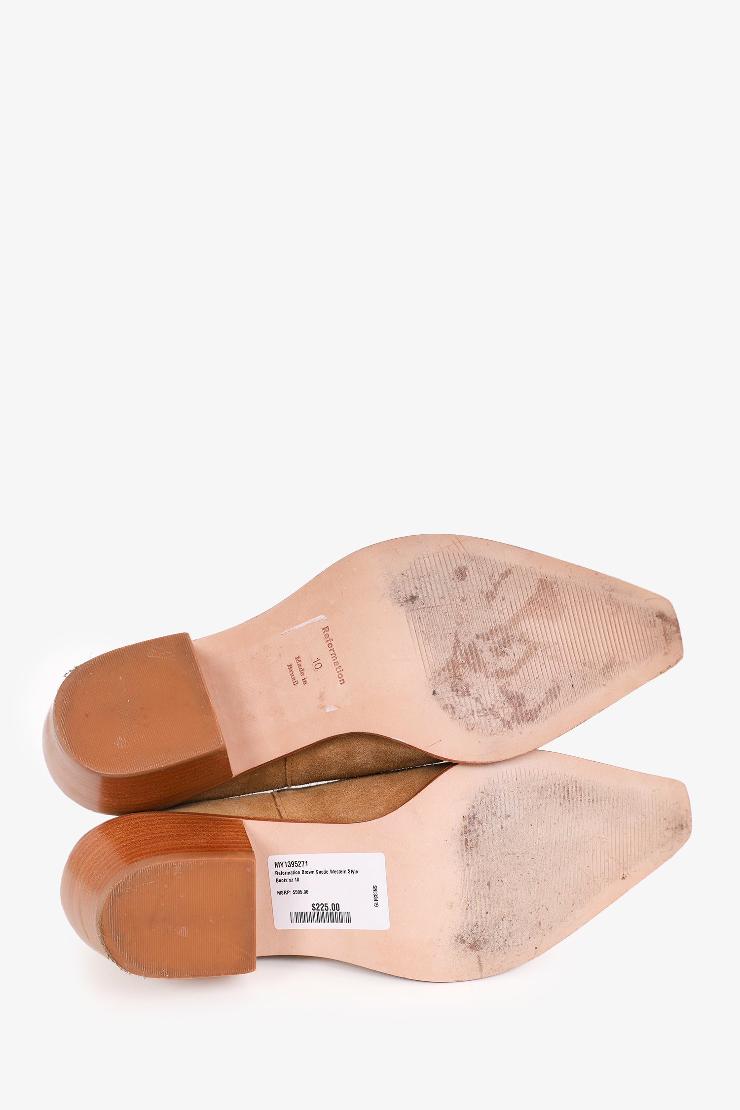 Refresh availabilityReformation Brown Suede Western Style Boots. Pull-on with rear pull tab. Elasticated gussets. Tonal stitching.