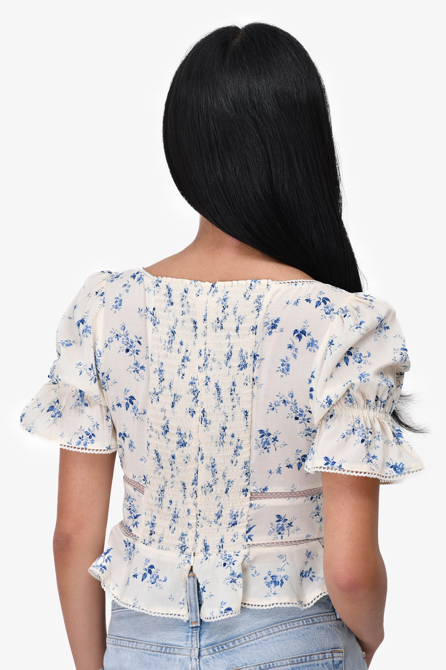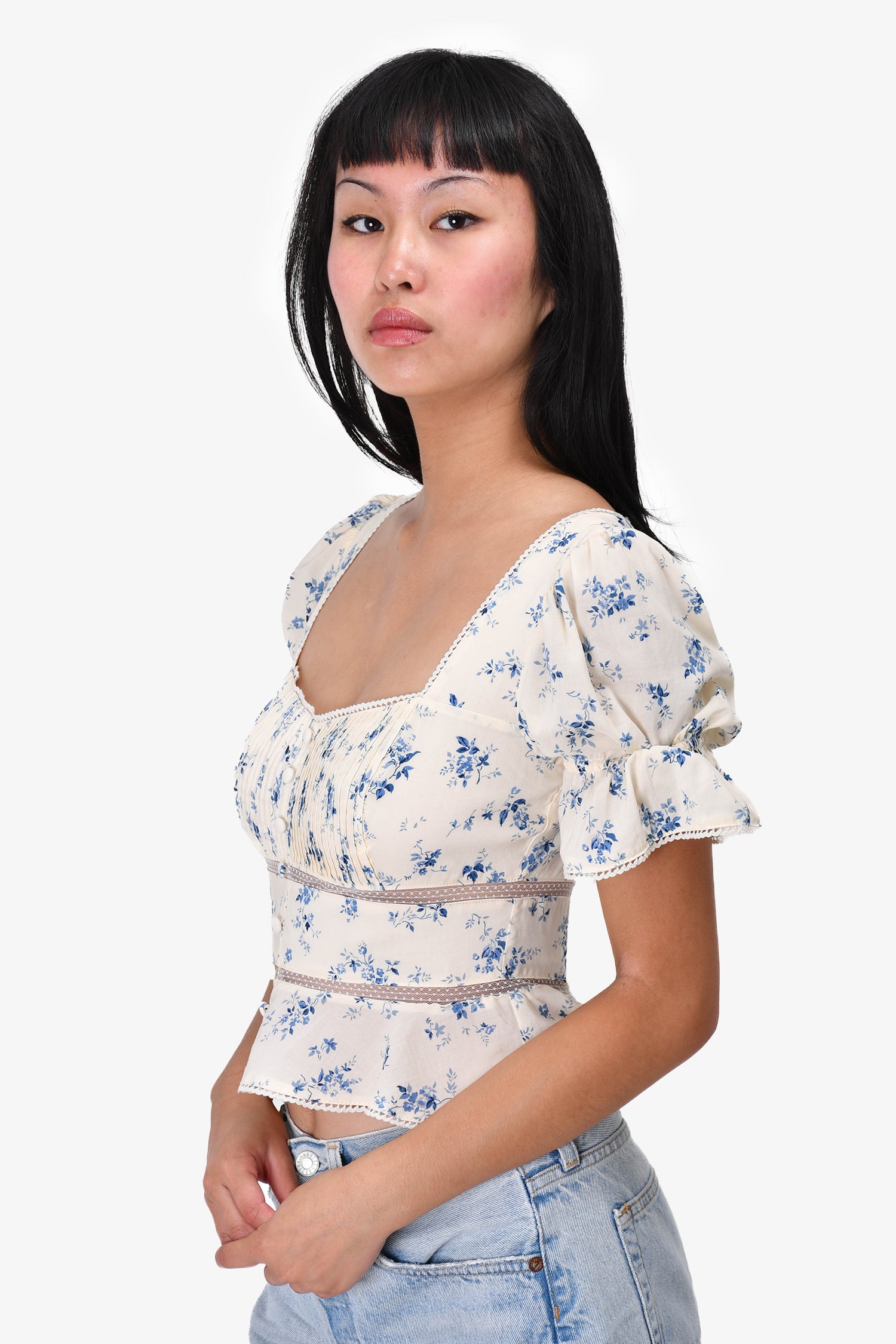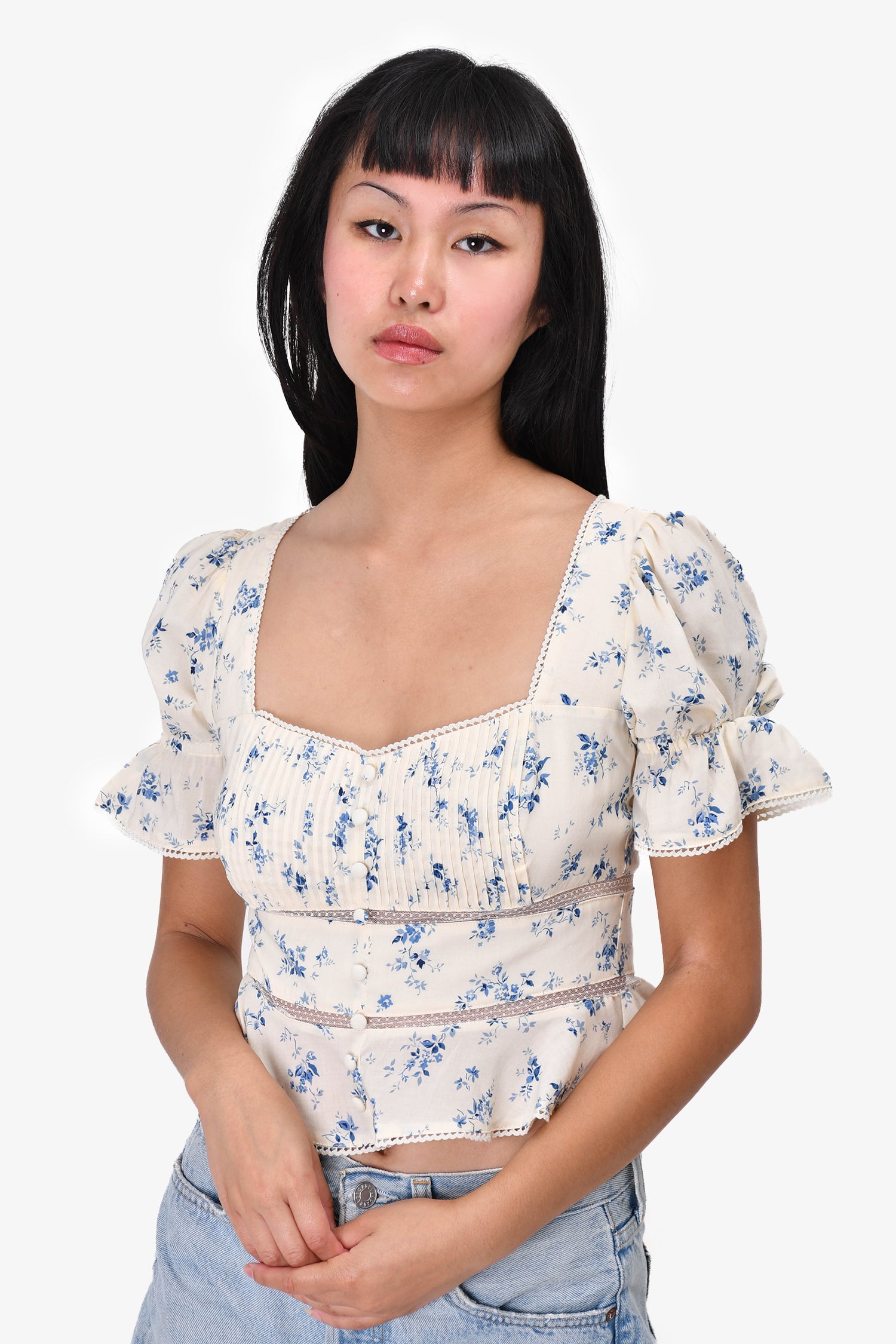 Reformation Cream/Blue Floral Button Detailed Top Size 0