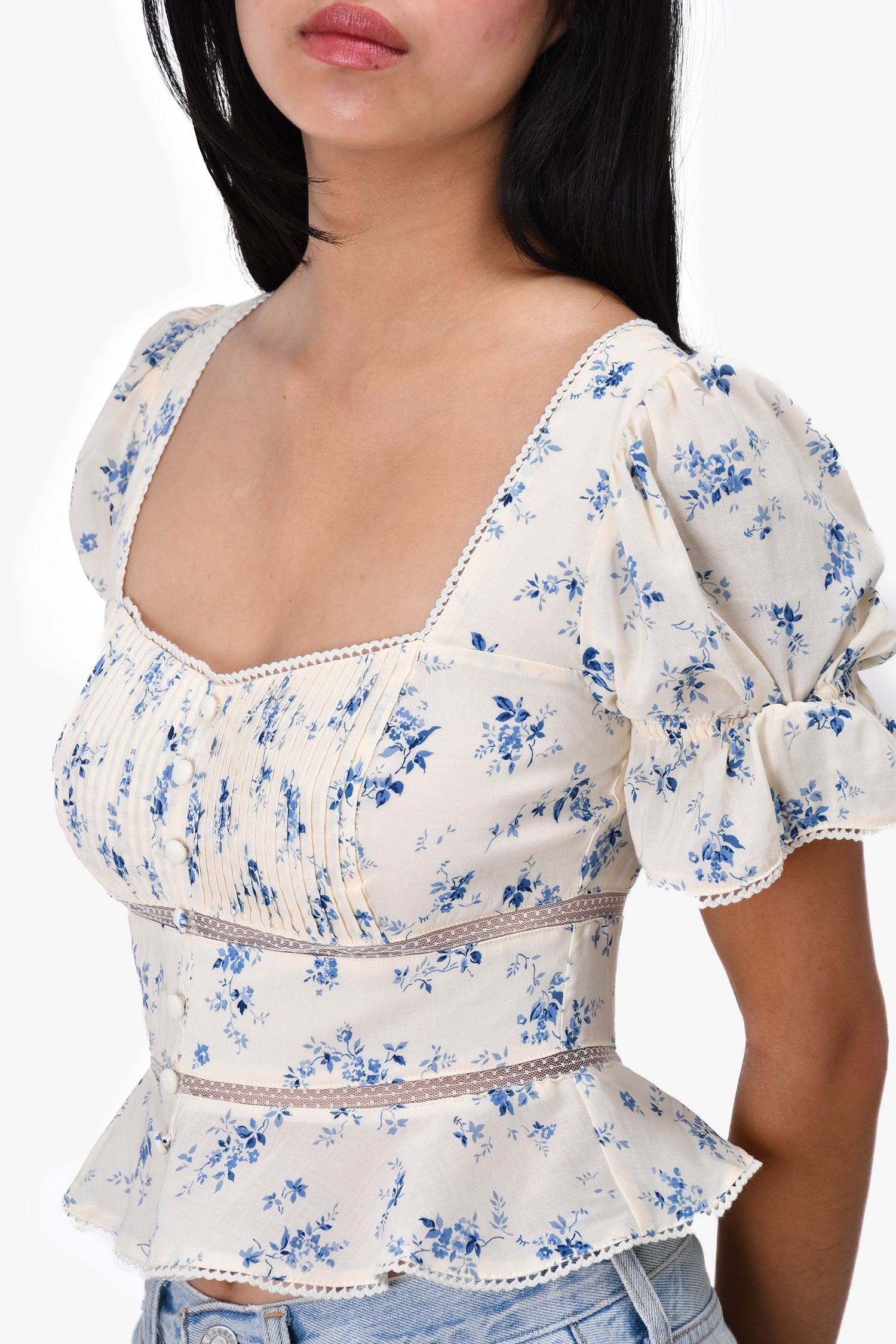Refresh availabilityReformation Cream/Blue Floral Button Detailed Top. Lace trim at the collar, sleeves, hemline and lining. Decorative buttons on front. Elastic ruching on the back with hidden zipper closure.
