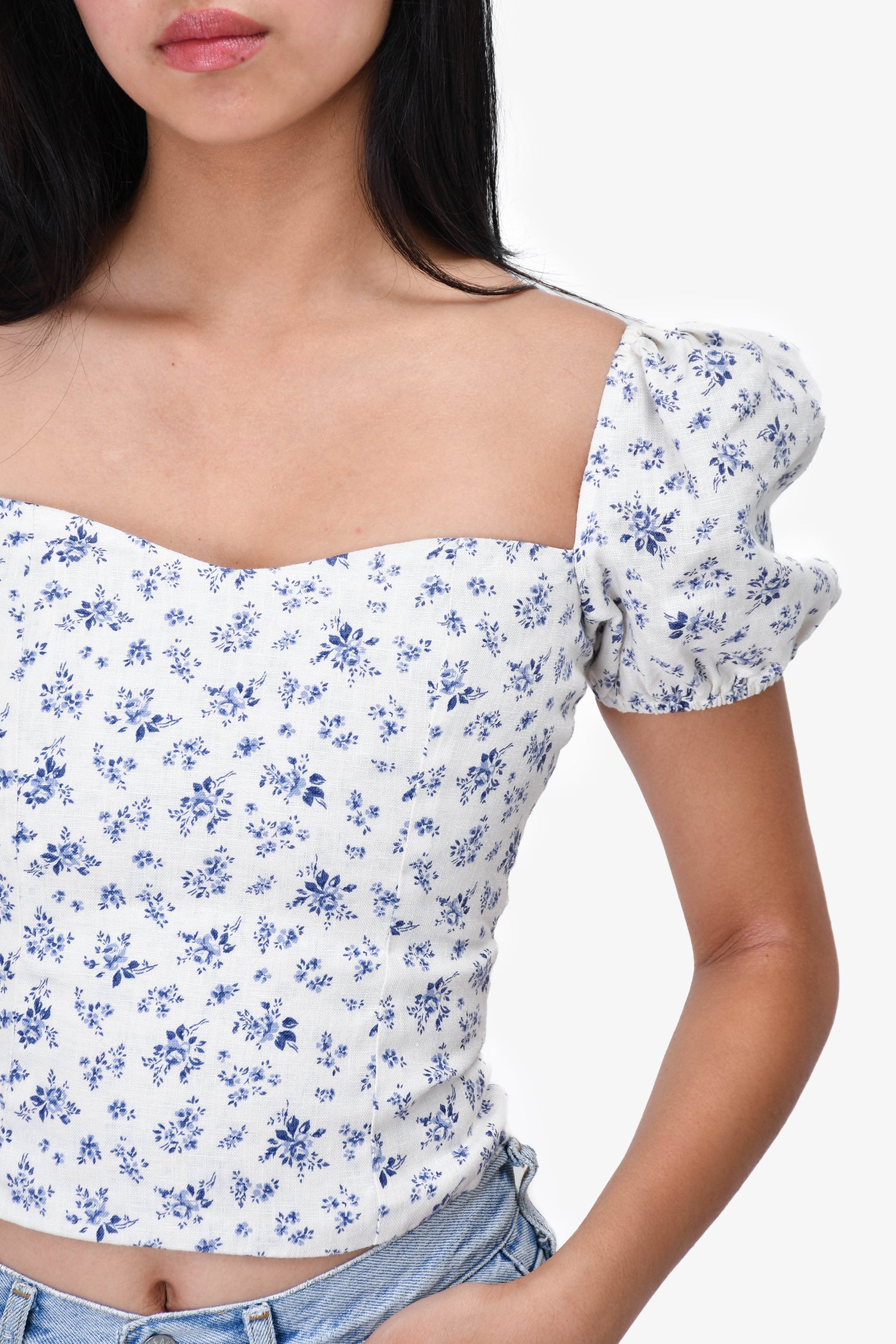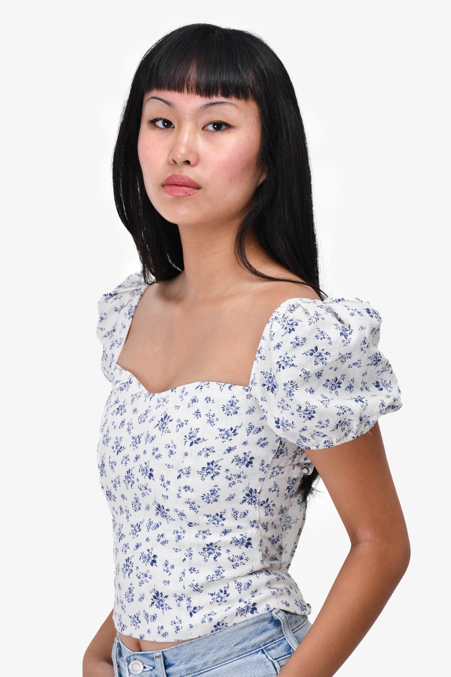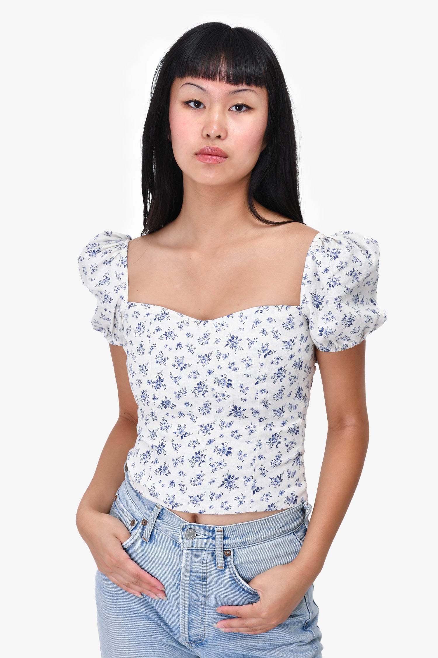 Refresh availabilityReformation Multicolored Floral Sweetheart Top. Bell sleeves with elastic band. Back elastic ruching with silver-tone zipper. Back-tie closure. Tonal stitching.