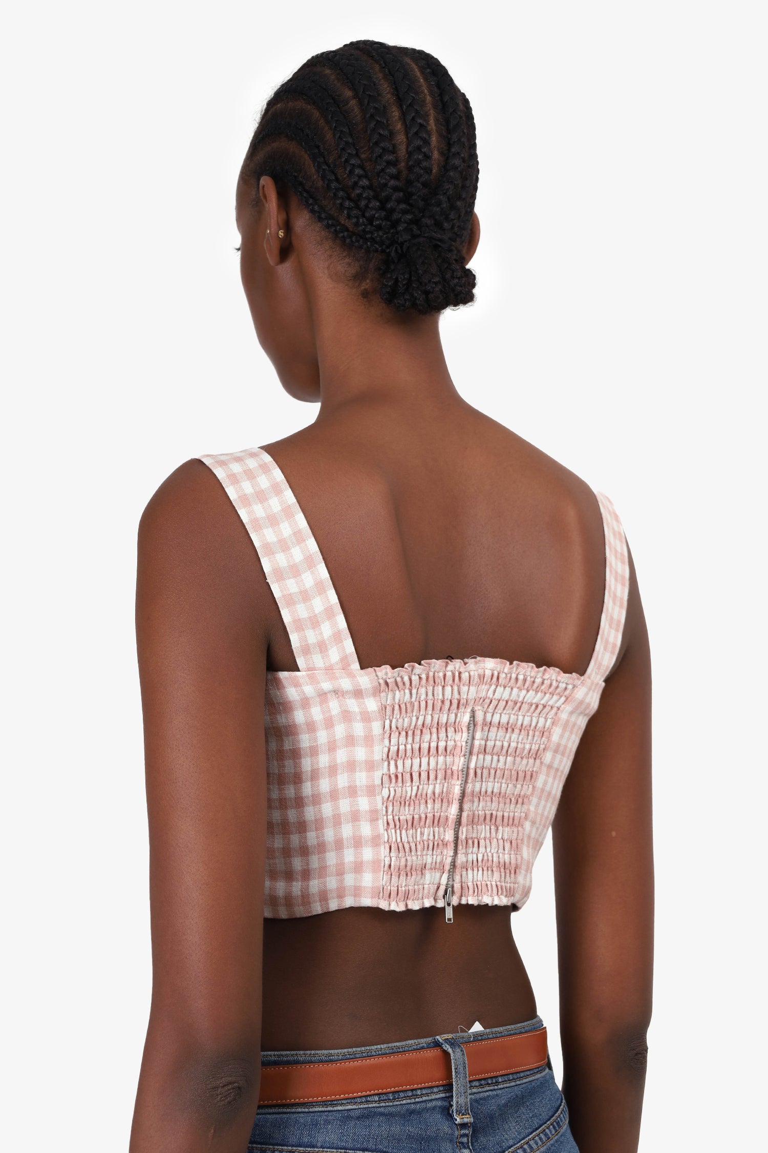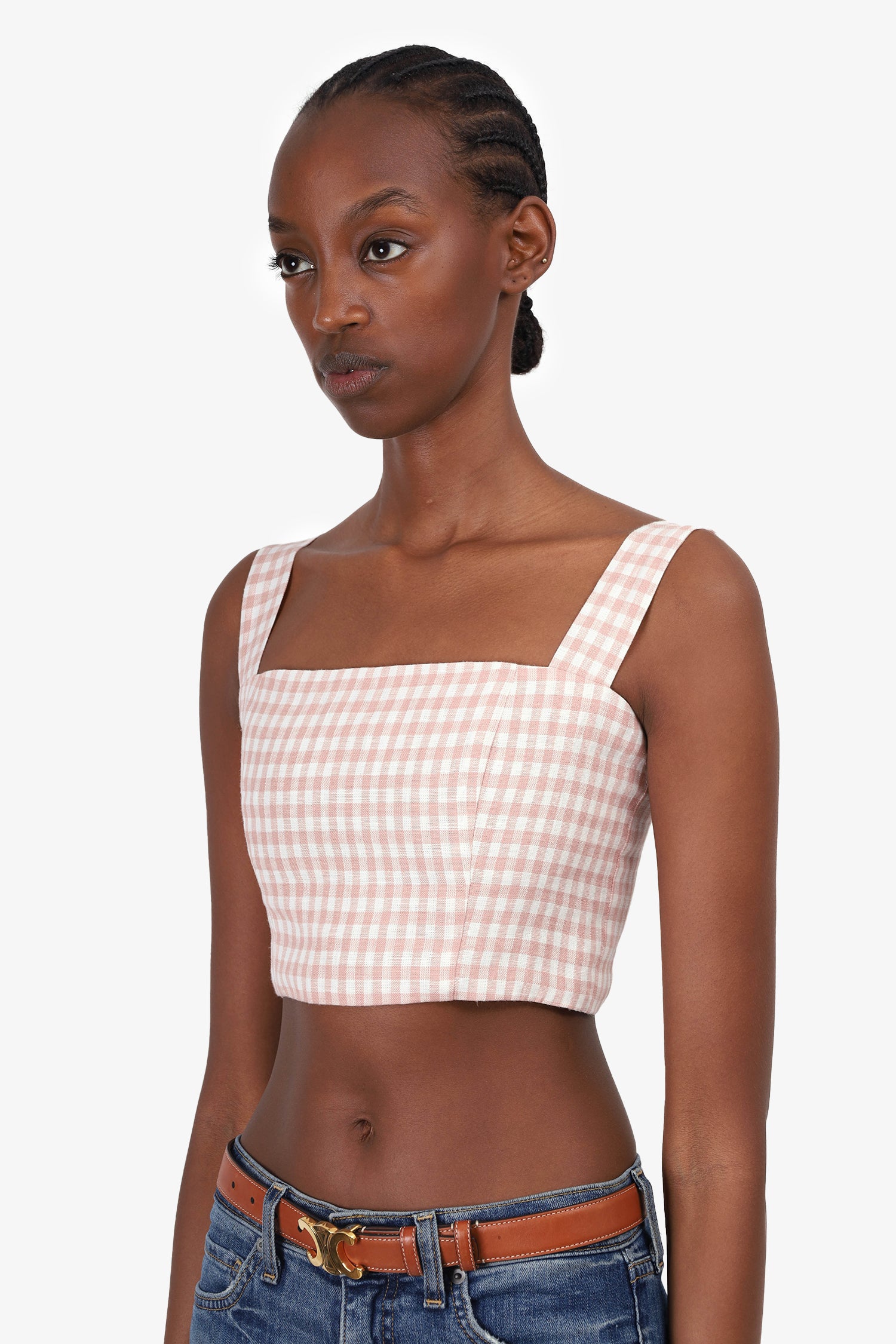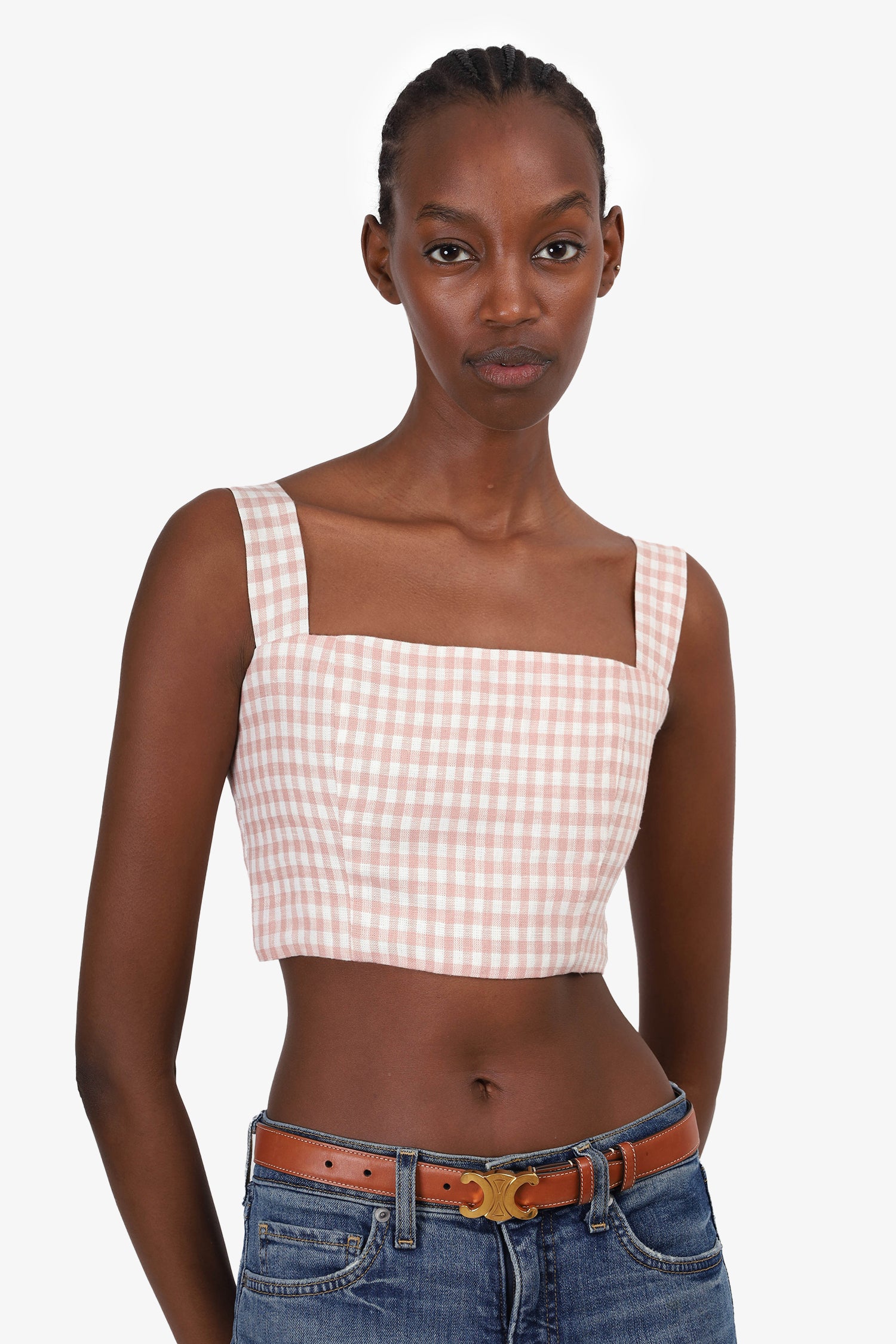 Refresh availabilityReformation Pink/White Plaid Linen Top. Square neckline. Back zip closure. Adjustable straps with button-up closure on back. Tonal stitching. Unlined.