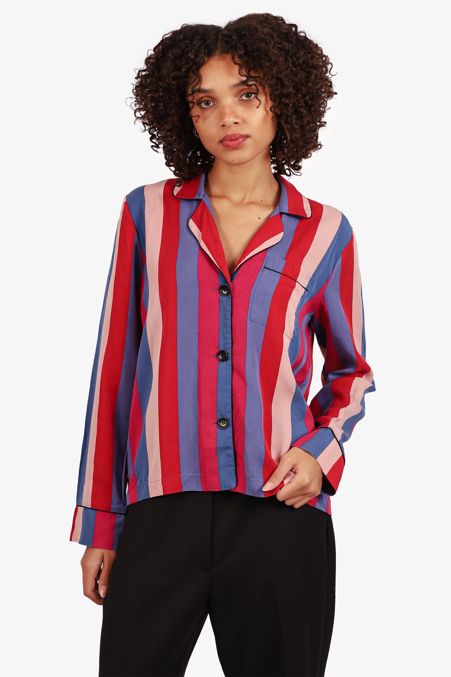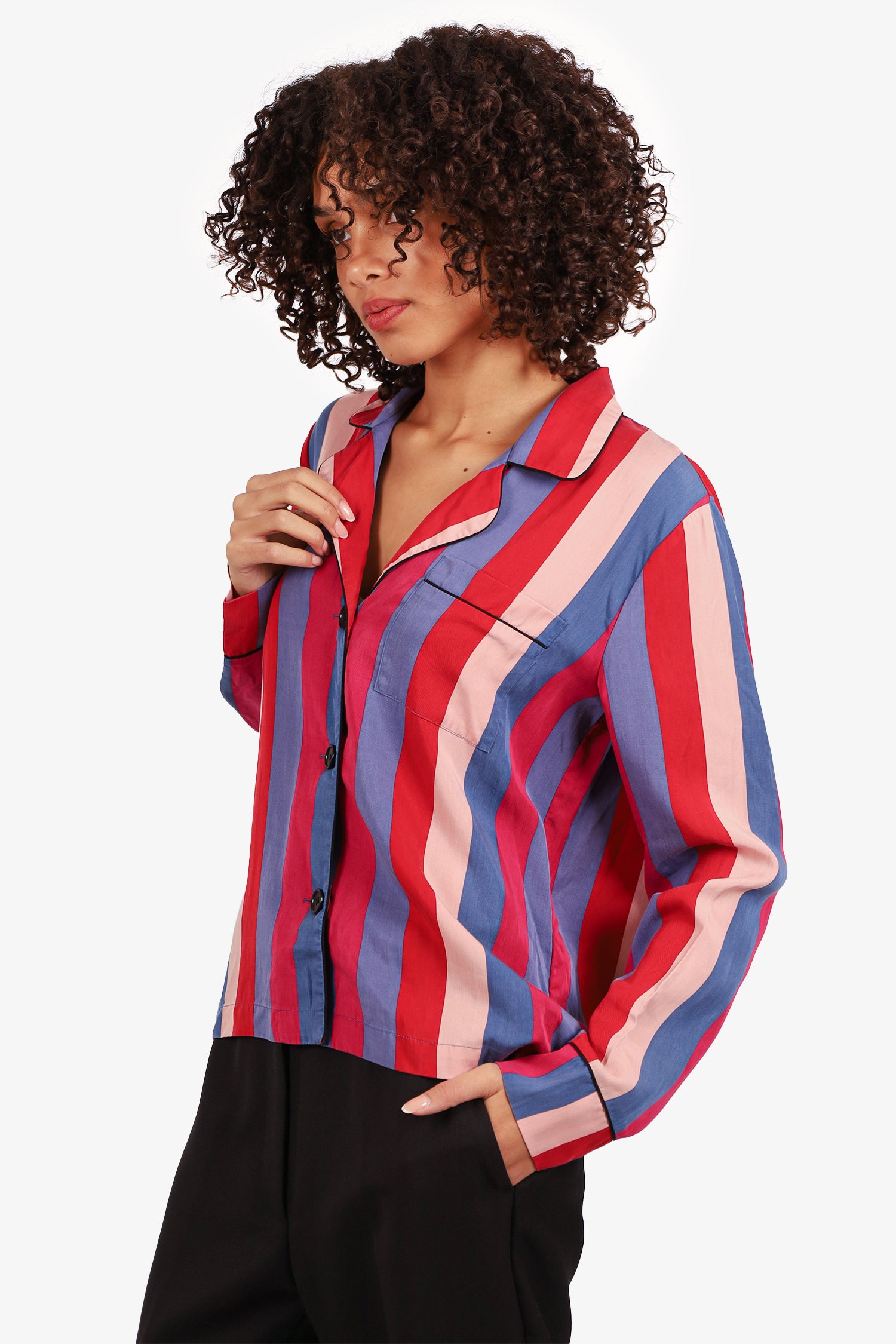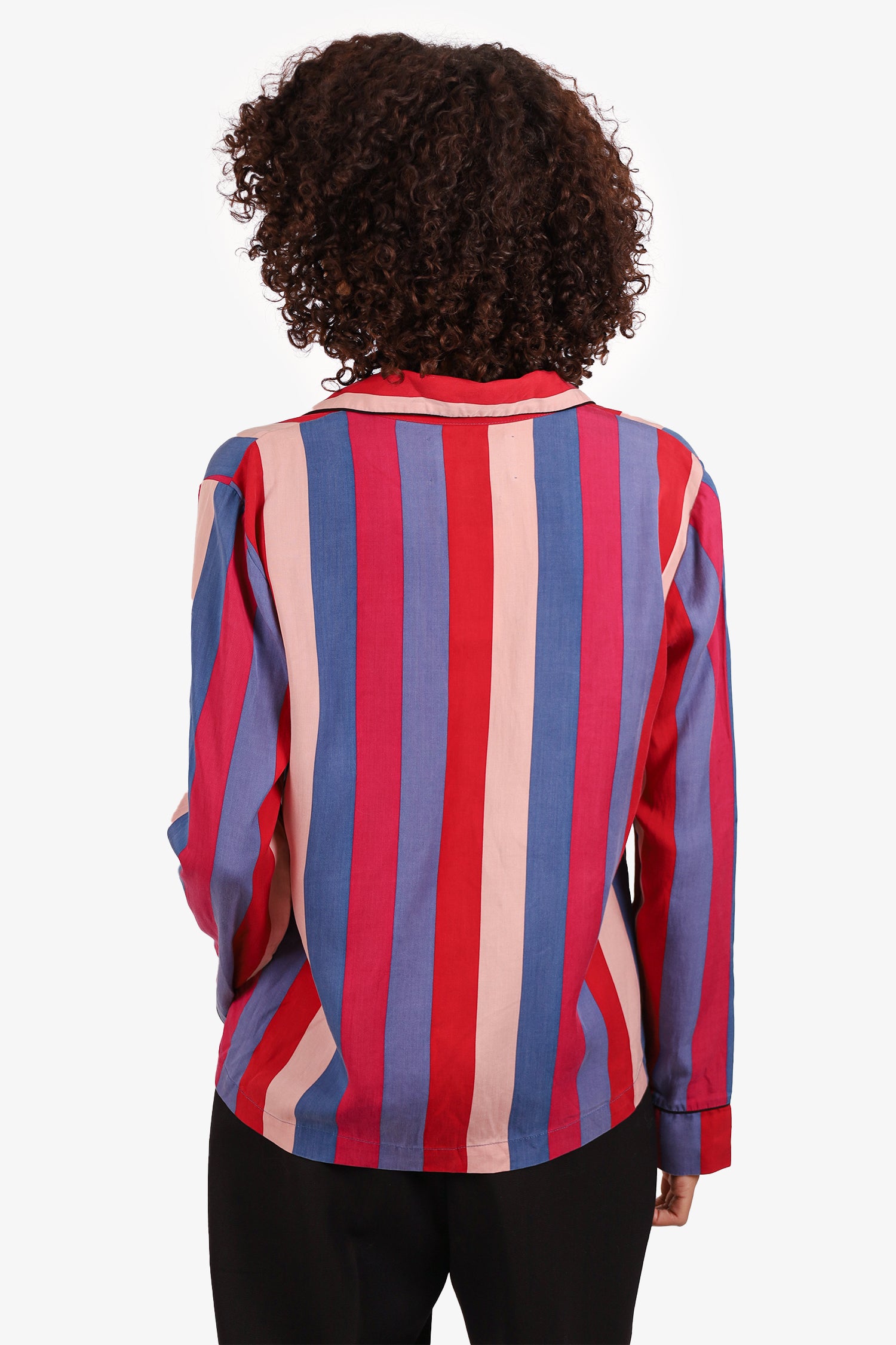 Refresh availabilityReformation Red/Blue Button Down Stripped Blouse. Collared notch lapel neckline. Front button-up closure. Single front slip pocket. Unlined. Tonal stitching.