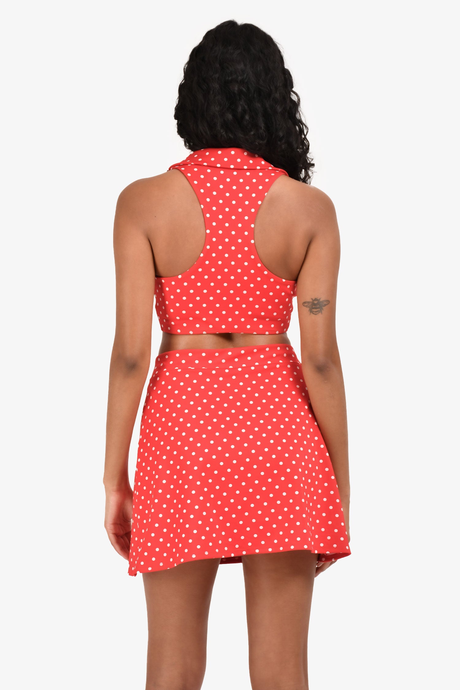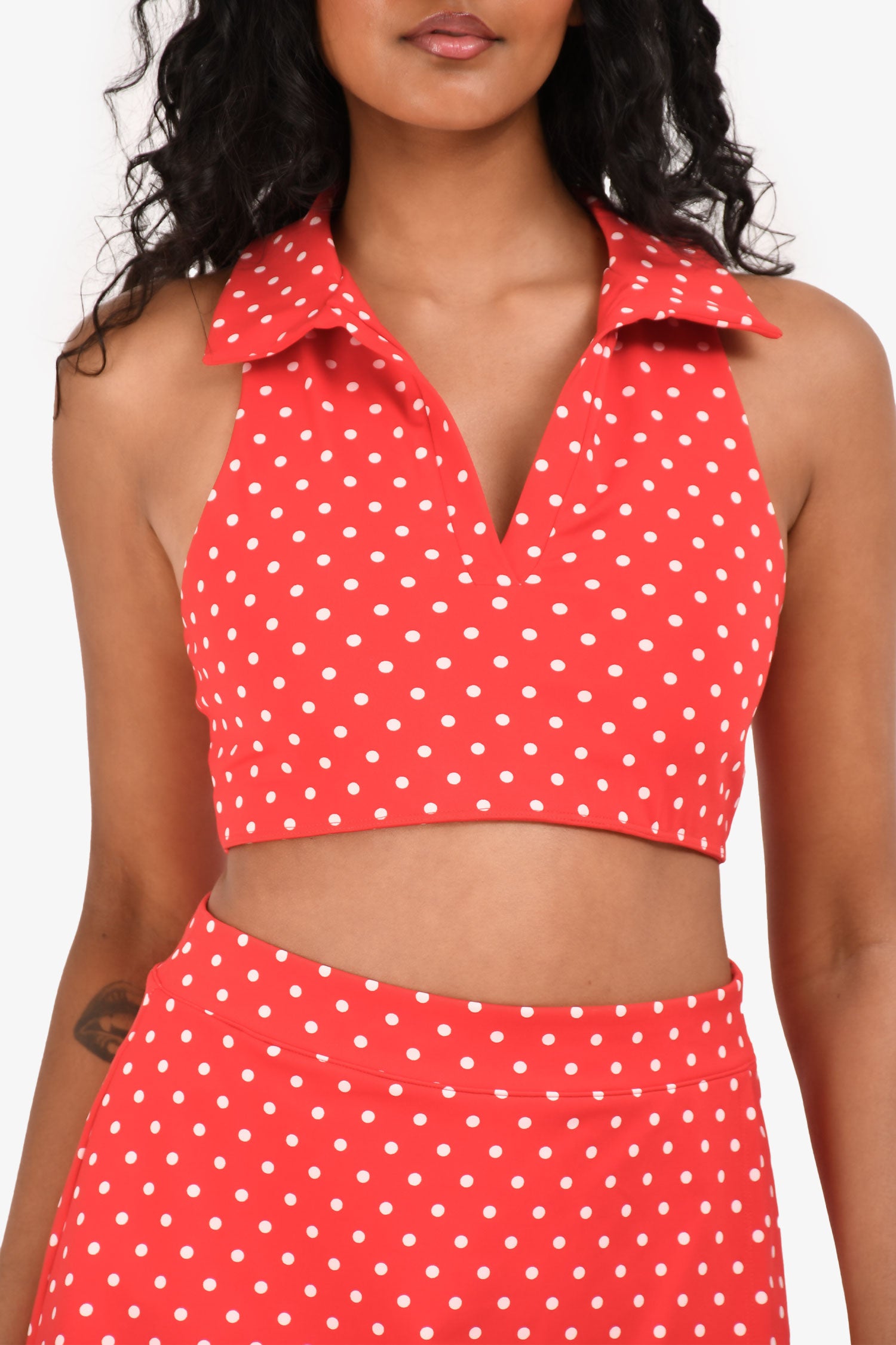 Refresh availabilityReformation Red White Polk-a-Dot Collared Sleeveless Active Wear Crop Top + Skirt set. Both pull-on. Skirt; built-on interior shorts. Tonal stitching.