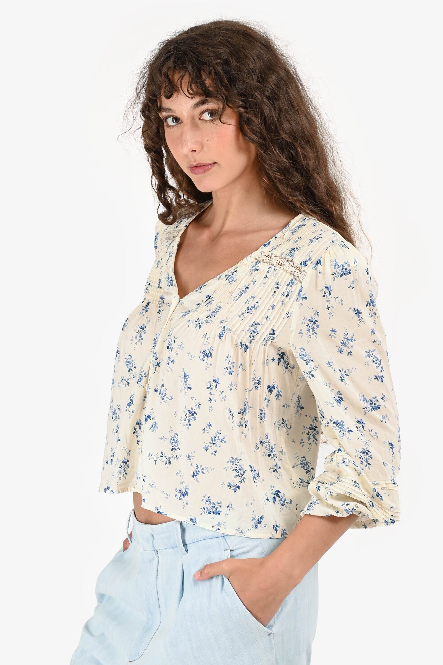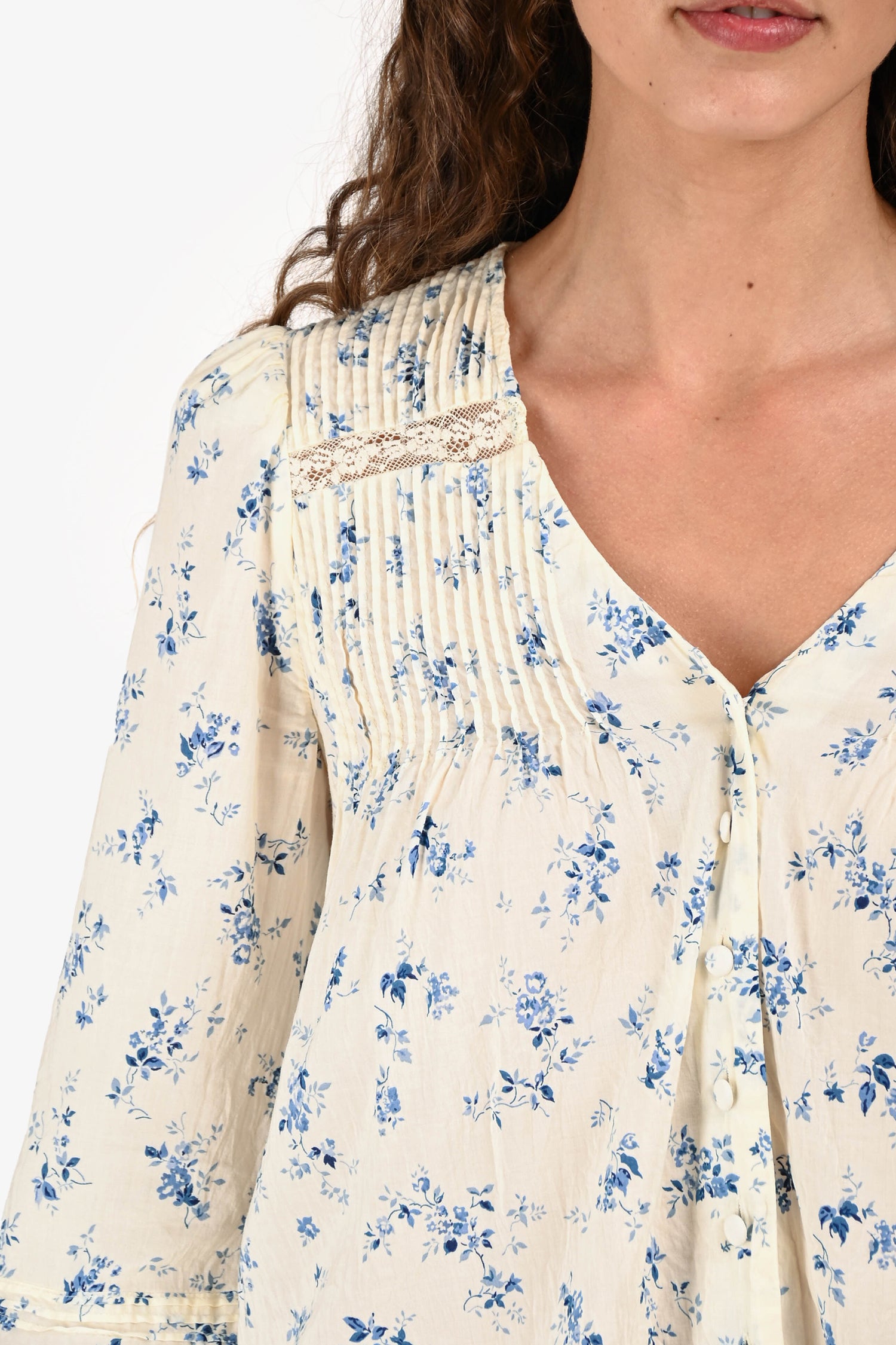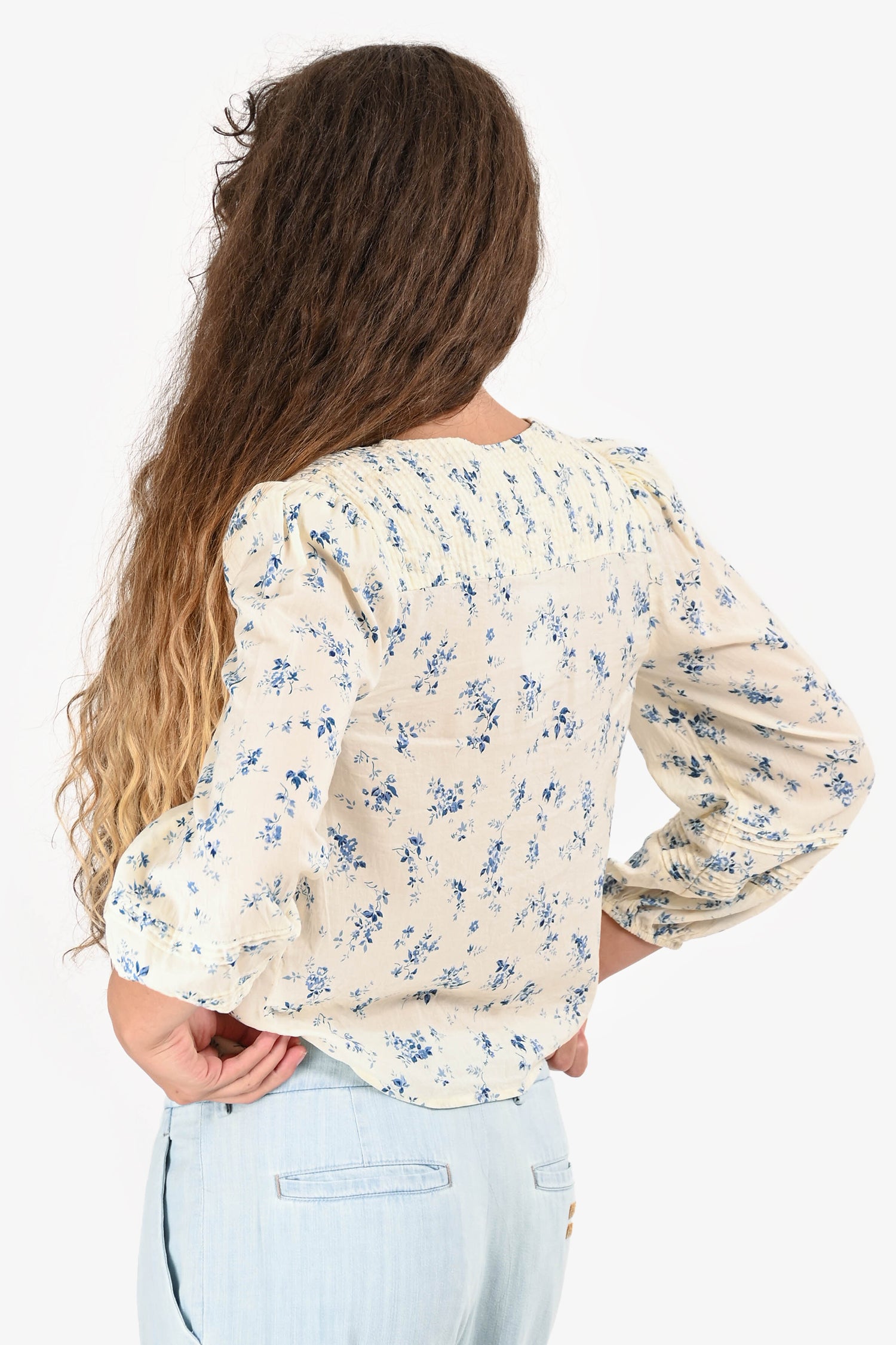 Refresh availabilityReformation White/Blue Floral Long Sleeves Button Down Blouse. V-neckline. Front button closure. All-over blue floral print on white base. Long sleeves with elastic cuffs. Lightweight woven fabric. Tonal stitching.