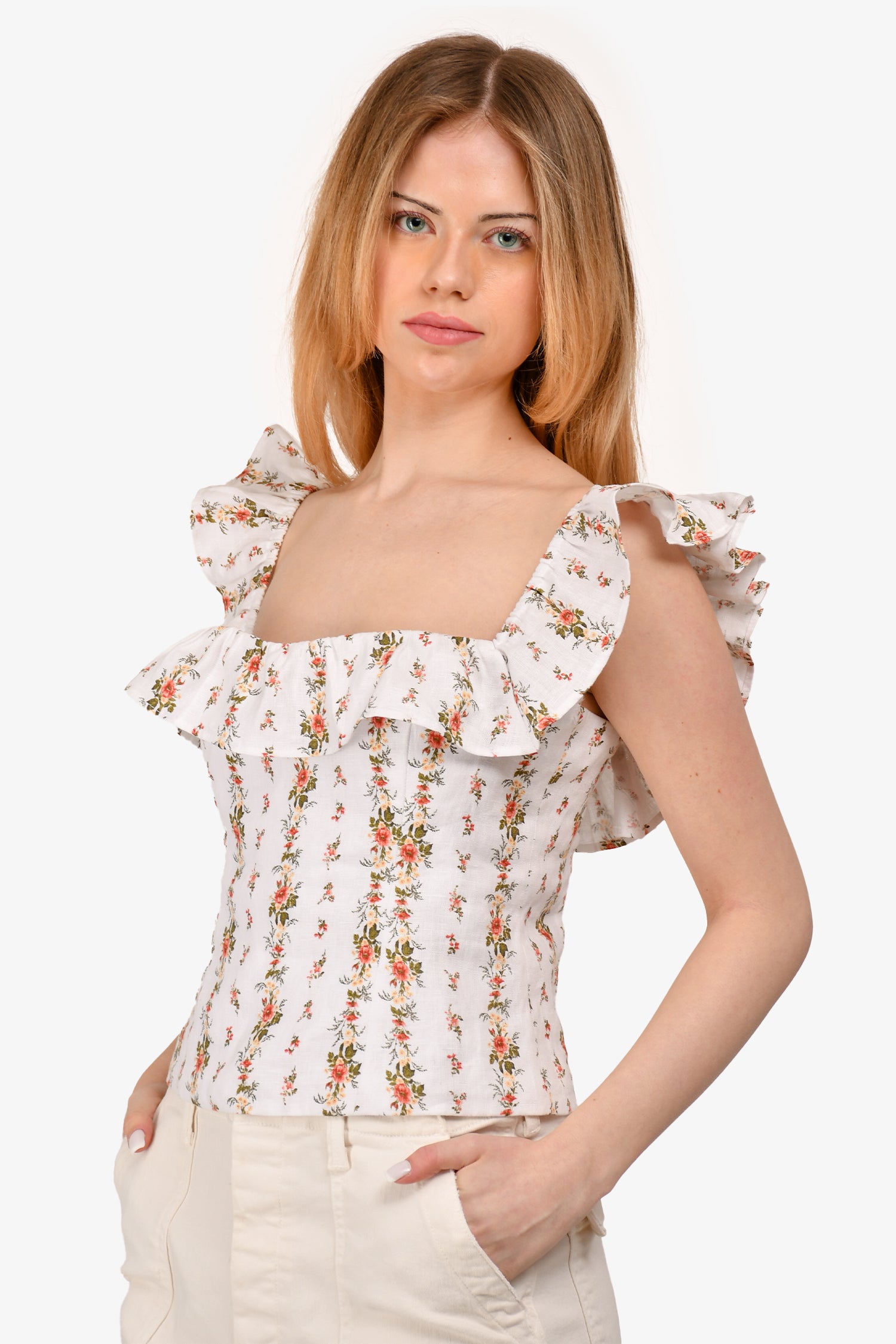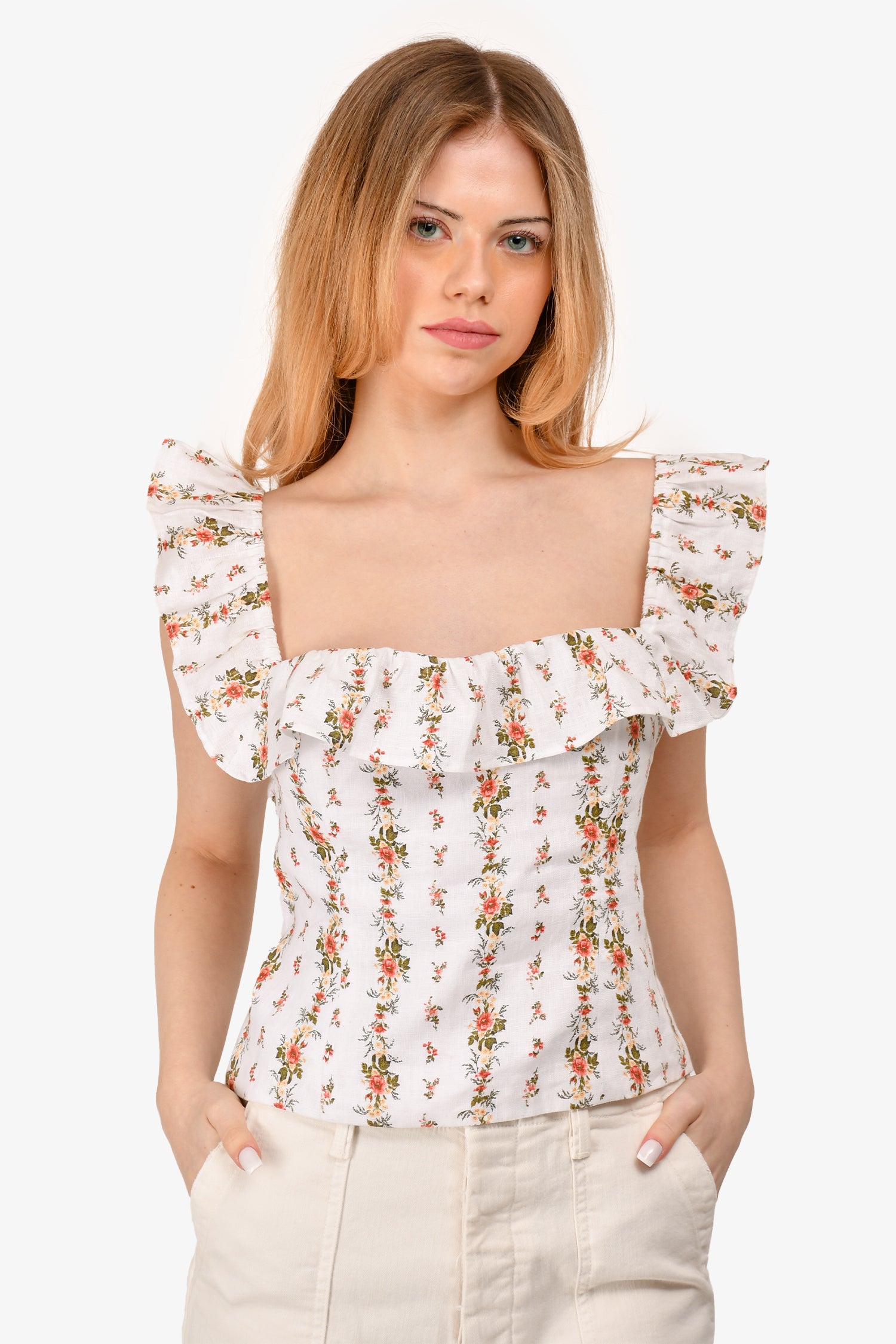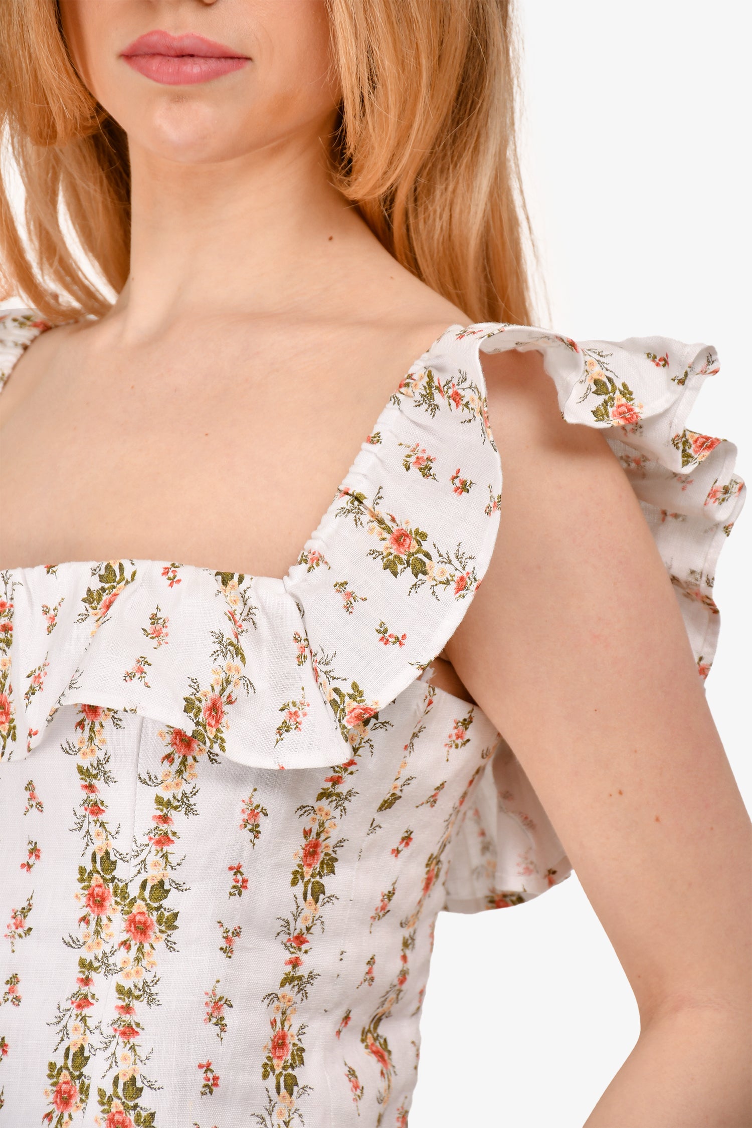Refresh availabilityReformation White Floral Linen Top. Square neckline. Back concealed zipper closure. Ruffled around the collar and sleeves. Ruched on the back. Tonal stitching.