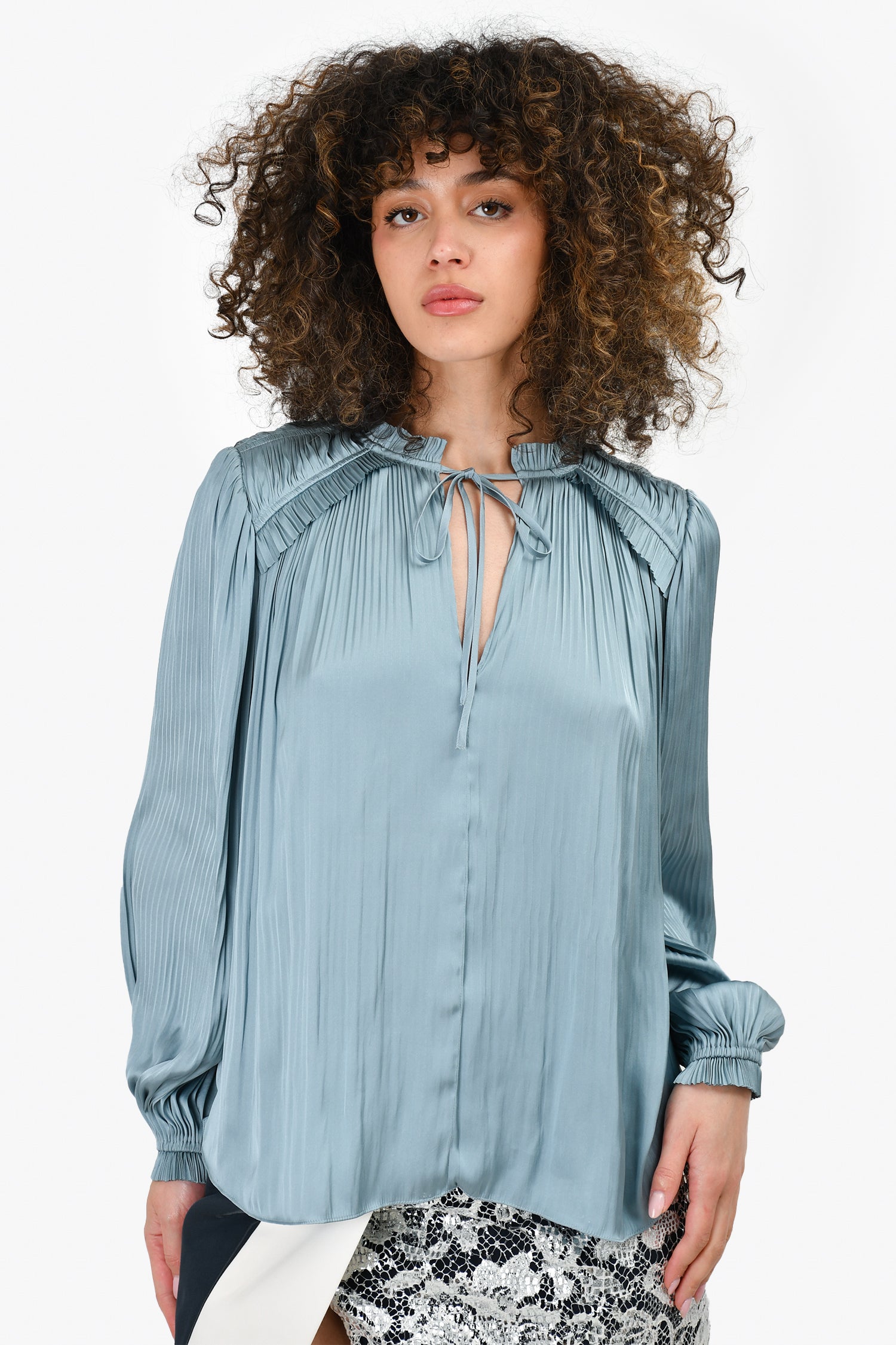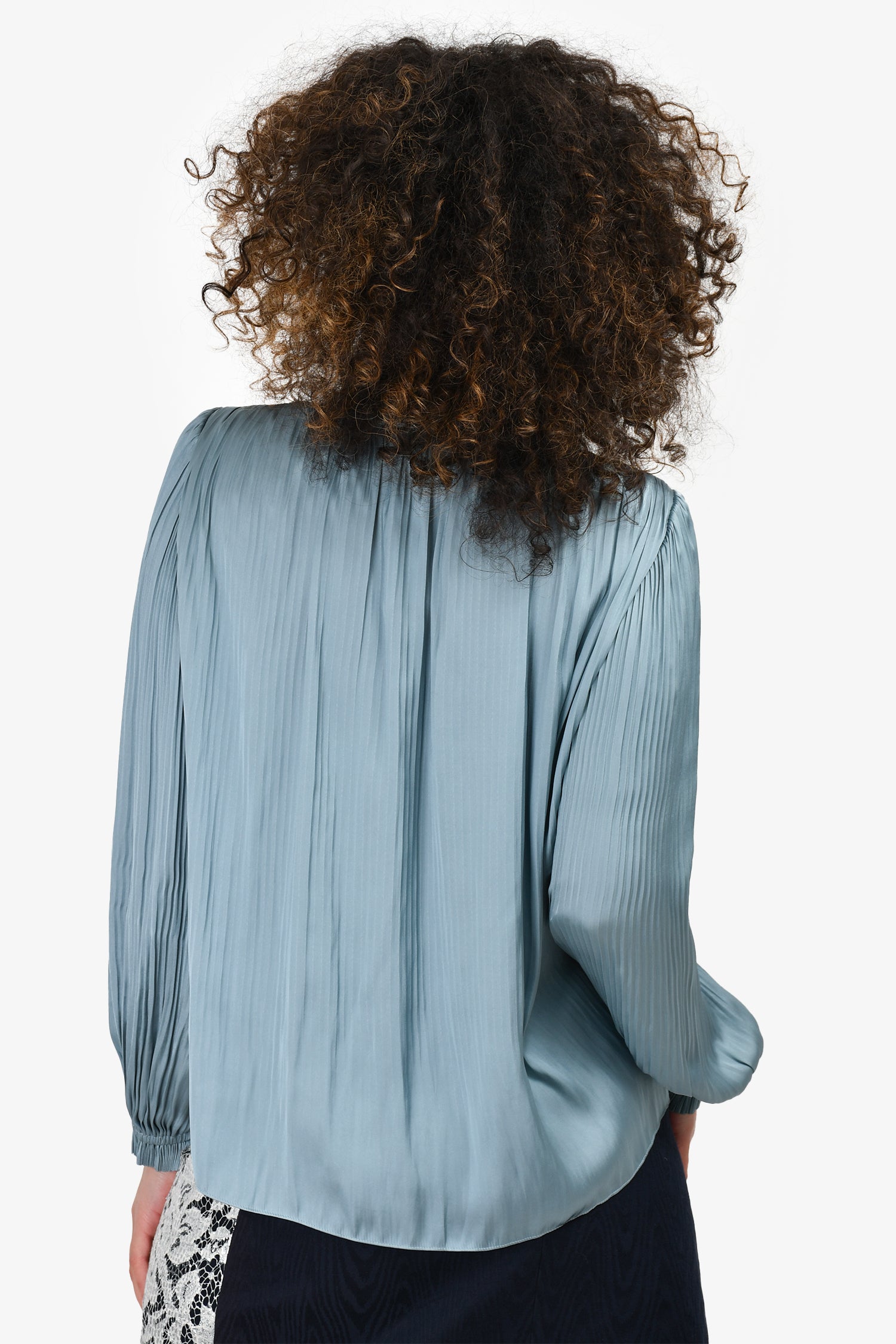 Refresh availabilityReiss Sky Blue Pleated Blouse. V-neck. Elasticized cuffs. Pull-on. Tie-up detail on the neckline.