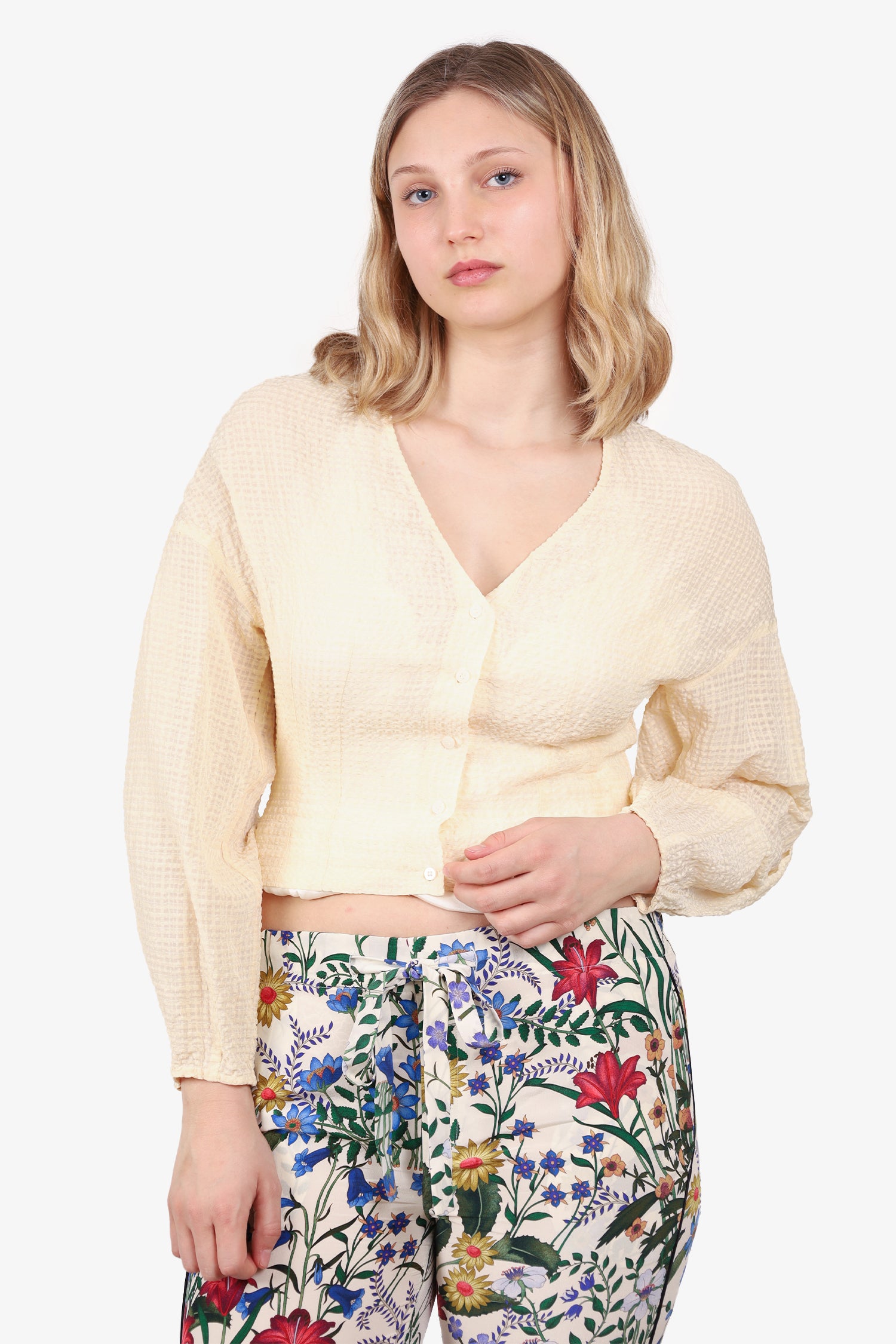 Refresh availabilityRemain Birger Christensen Cream Line/Silk Sheer Crop Top. Front button closure. V-neck. Dropped shoulder sleeves. Unlined. Tonal stitching.