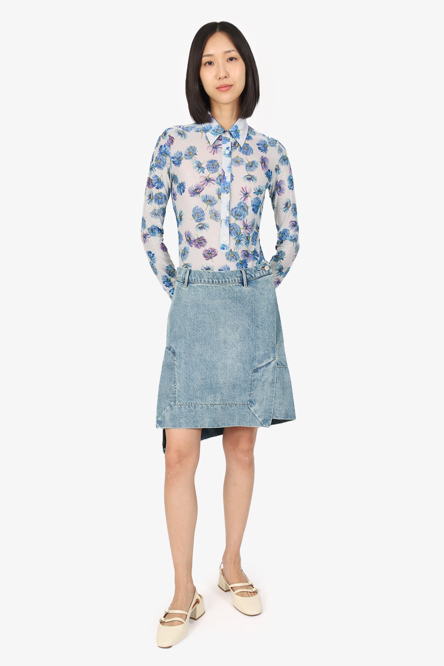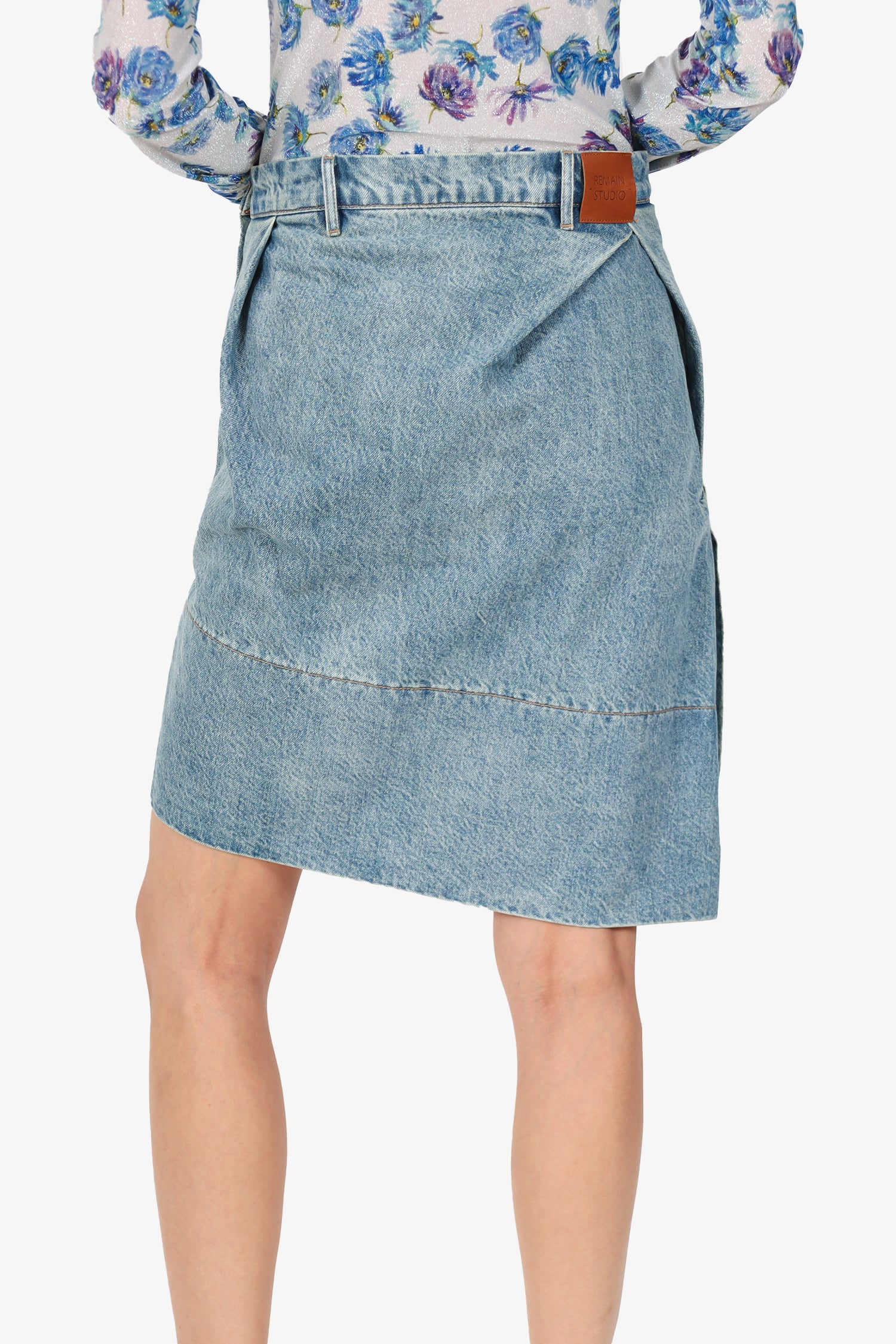 Refresh availabilityRemain Denim Asymmetric Knee Length Skirt. Slip-on. Side zip and button-up closure. Waistband belt loops. Silver-tone hardware. Contrast stitching.