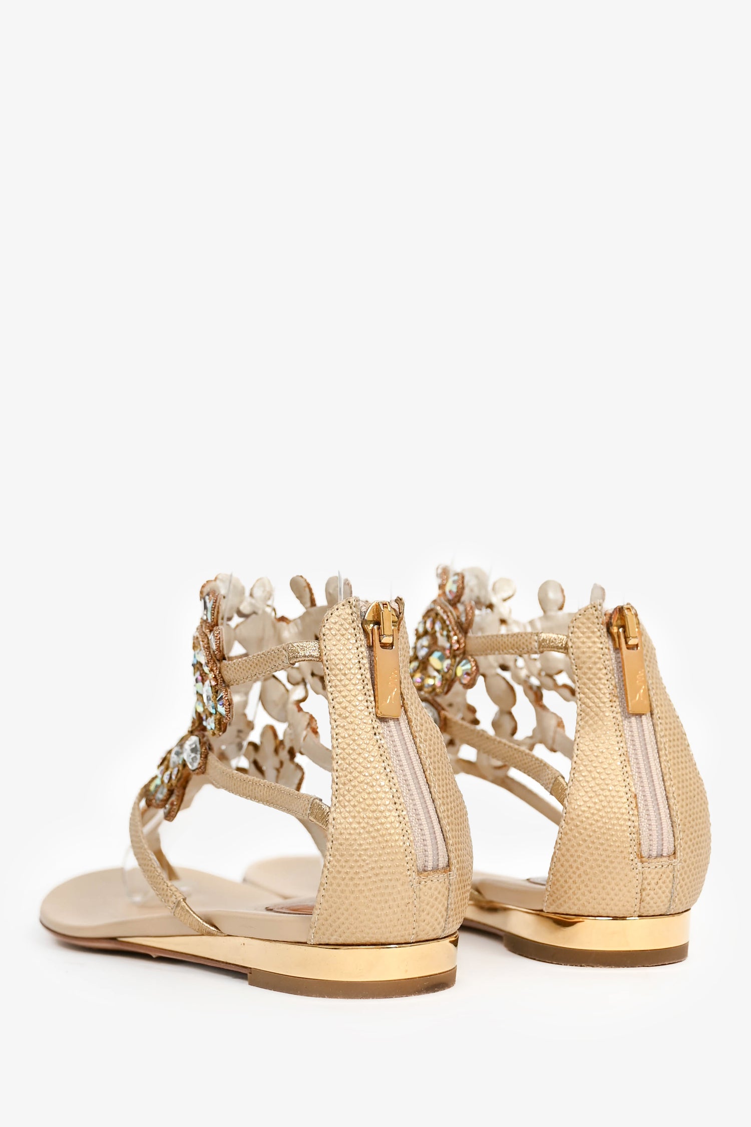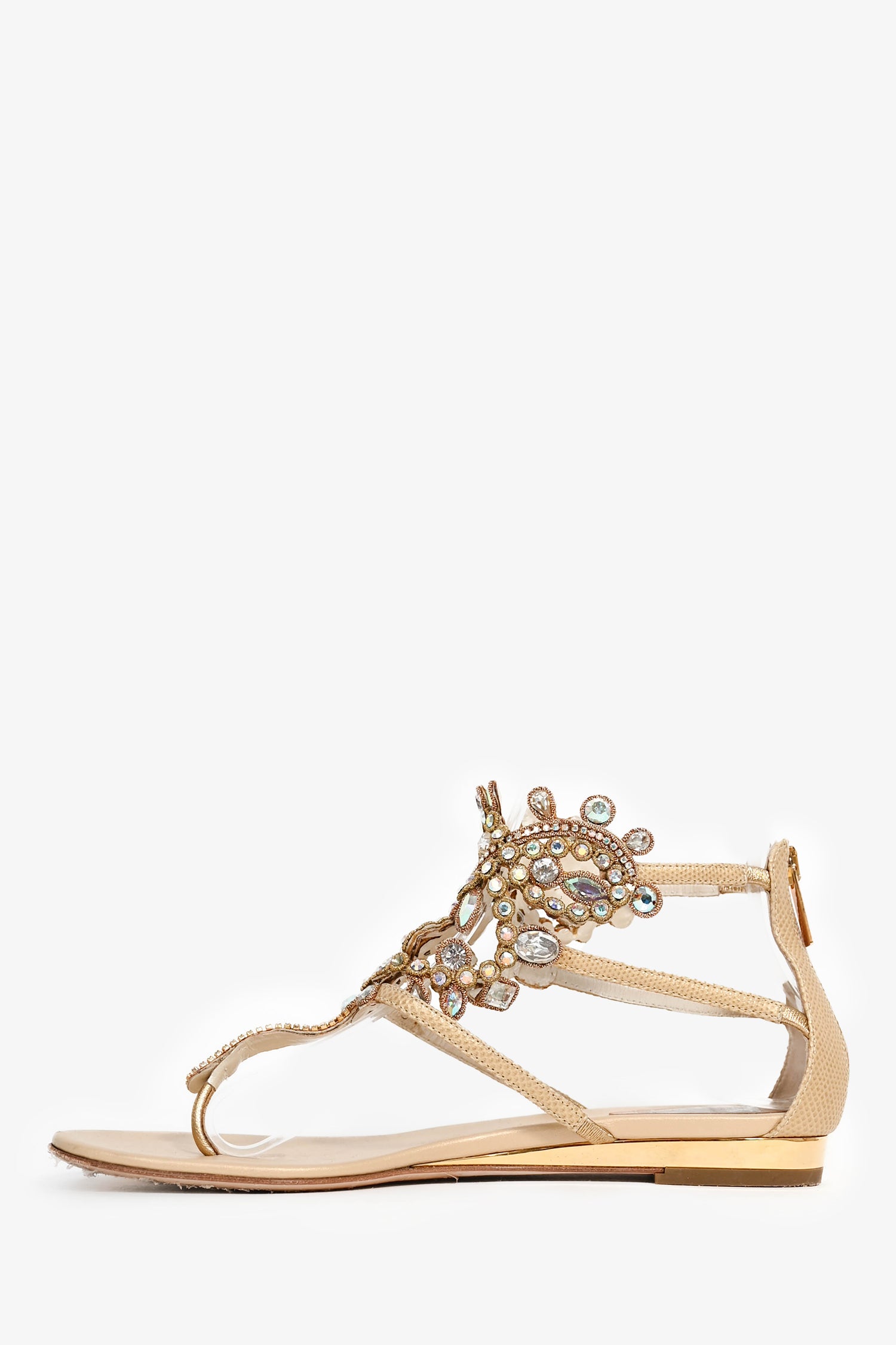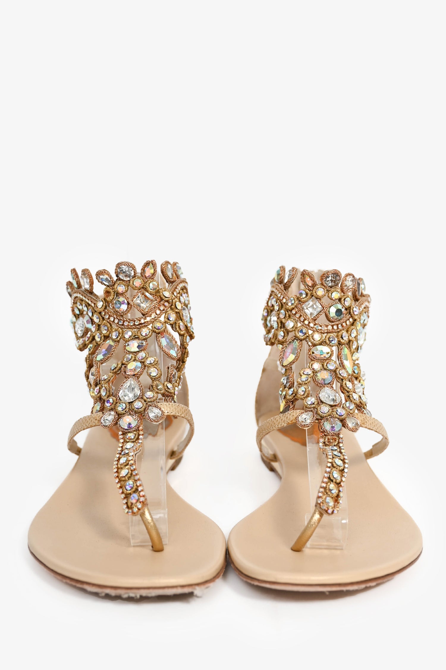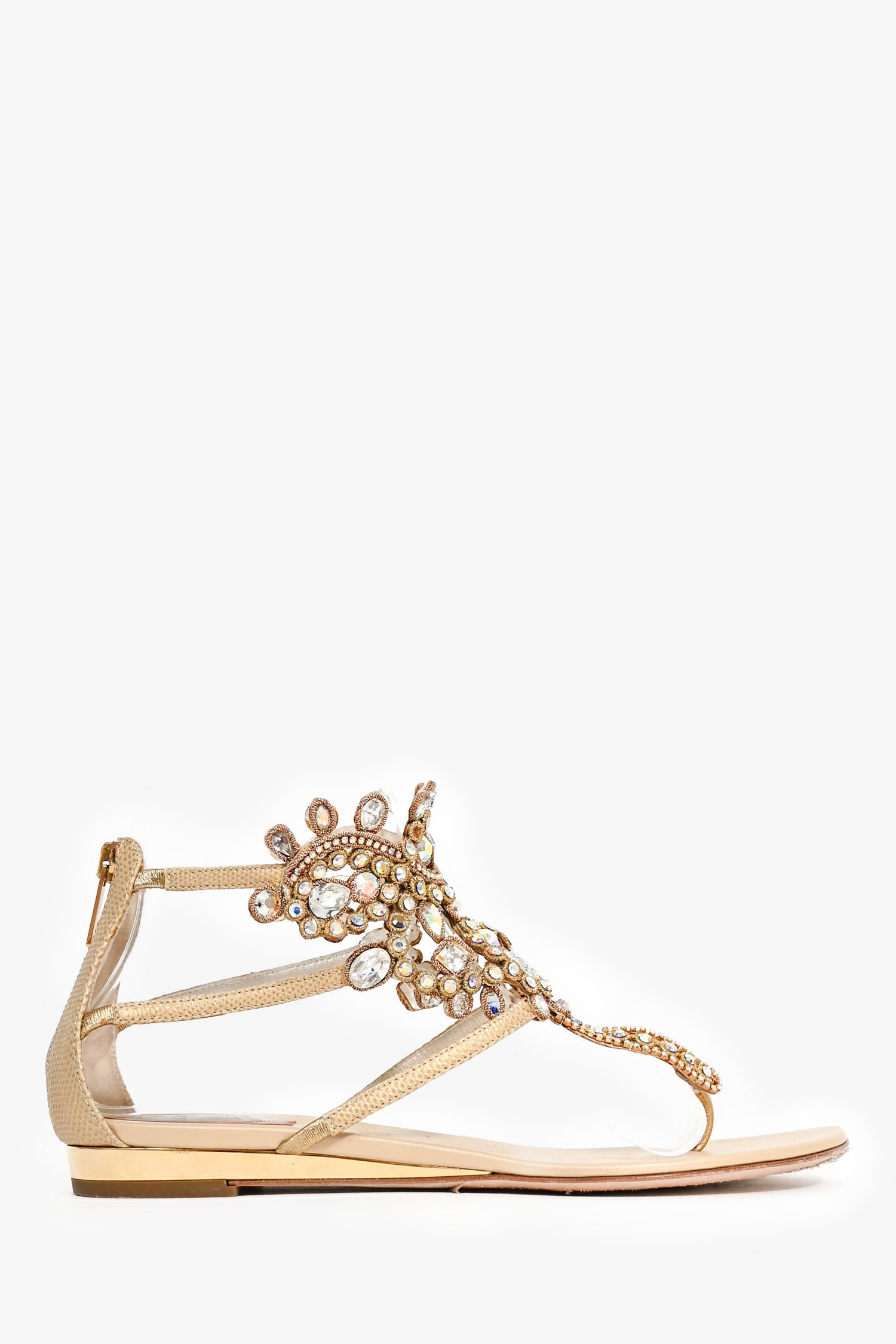 Refresh availabilityRene Caovilla Beige Crystal Ankle Strap Sandals. Back rear zipper. Gold-tone hardware. Tonal stitching.