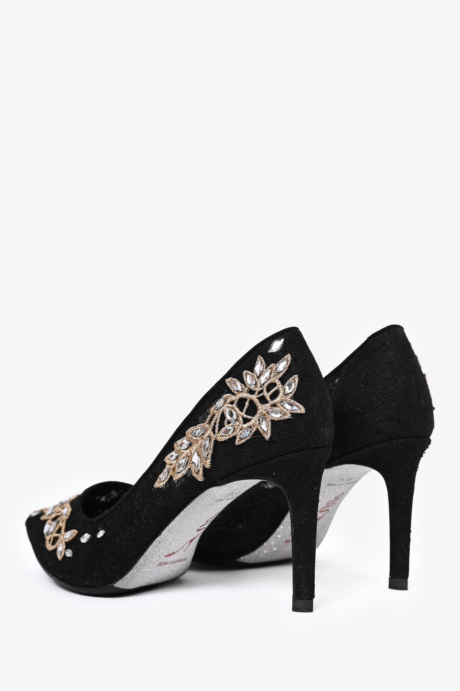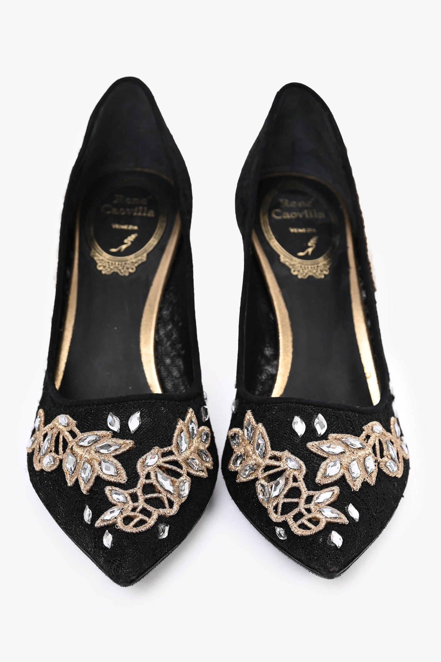 Refresh availabilityRene Caovilla Black Gold/Crystal Embellished Heels. Signature glitter bottoms. Slip-on. Pointed toe. Topy soles.