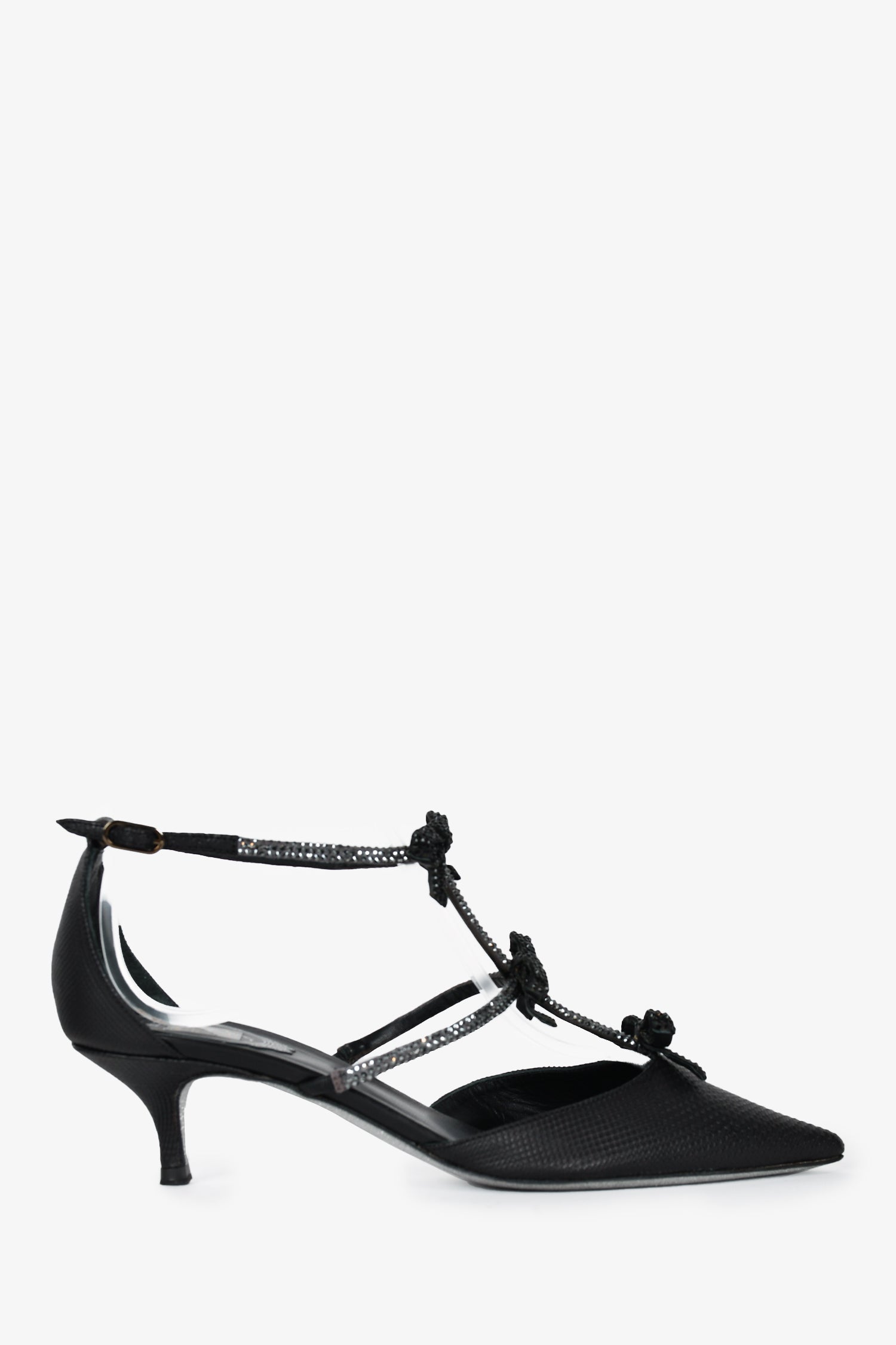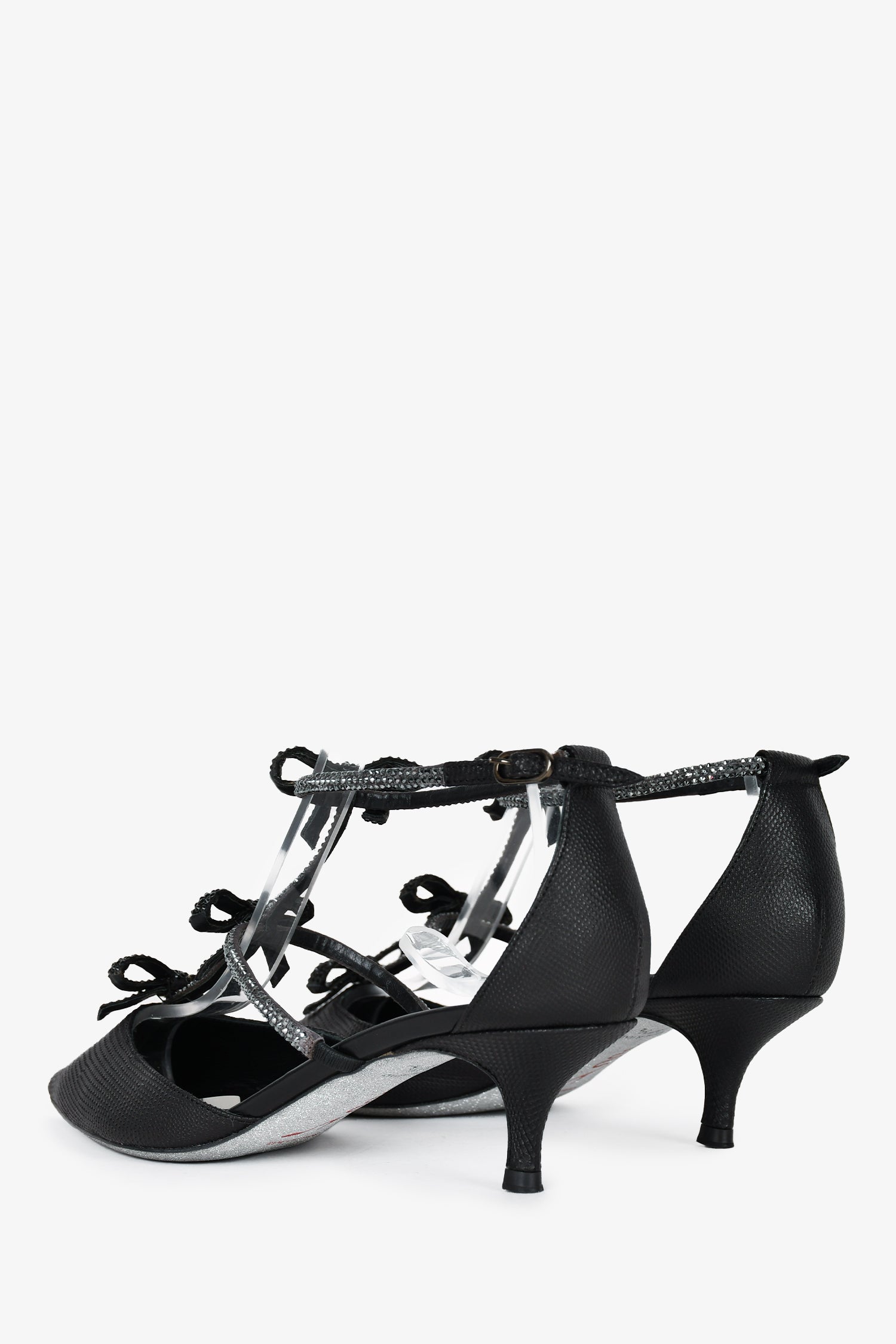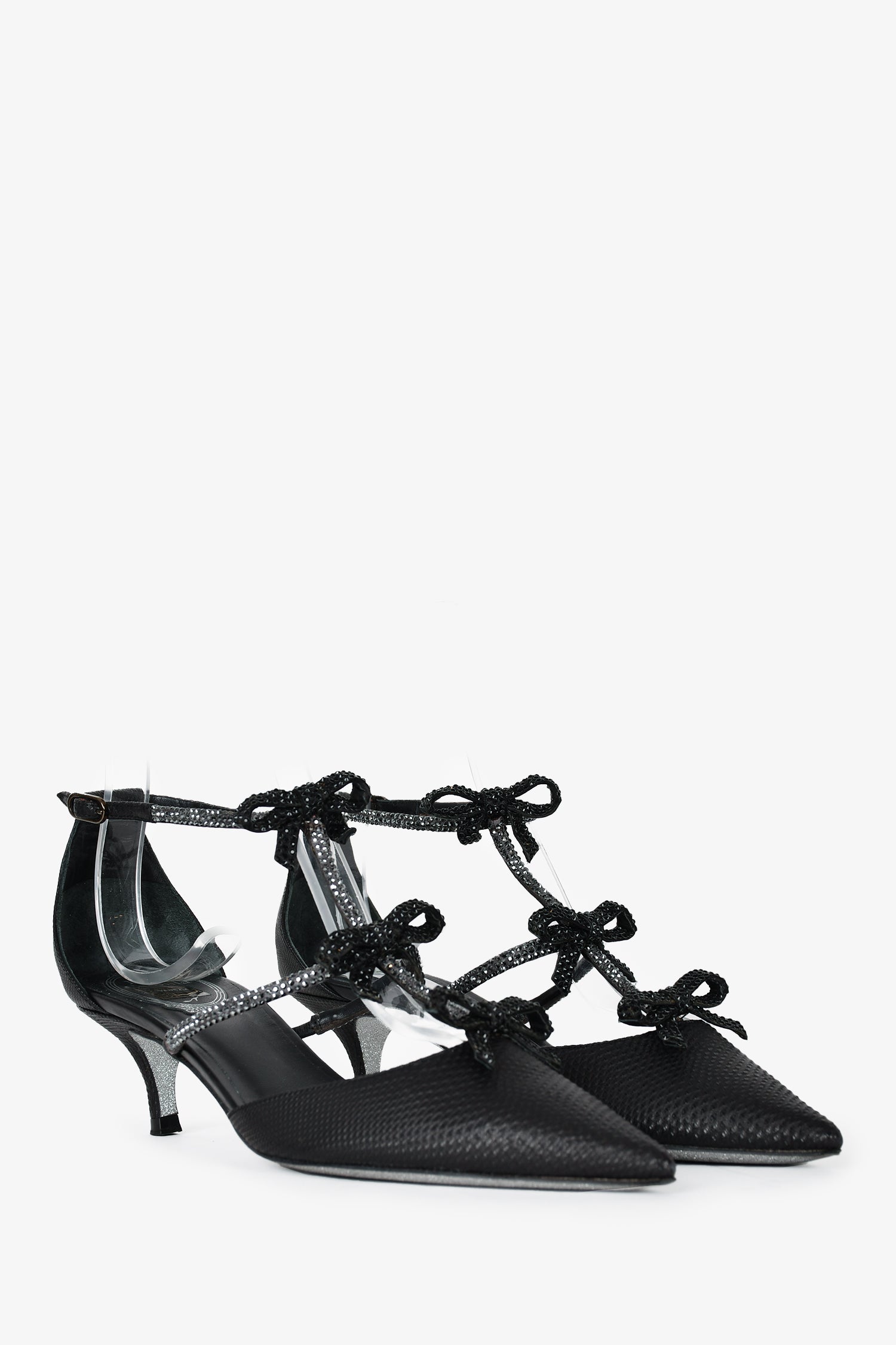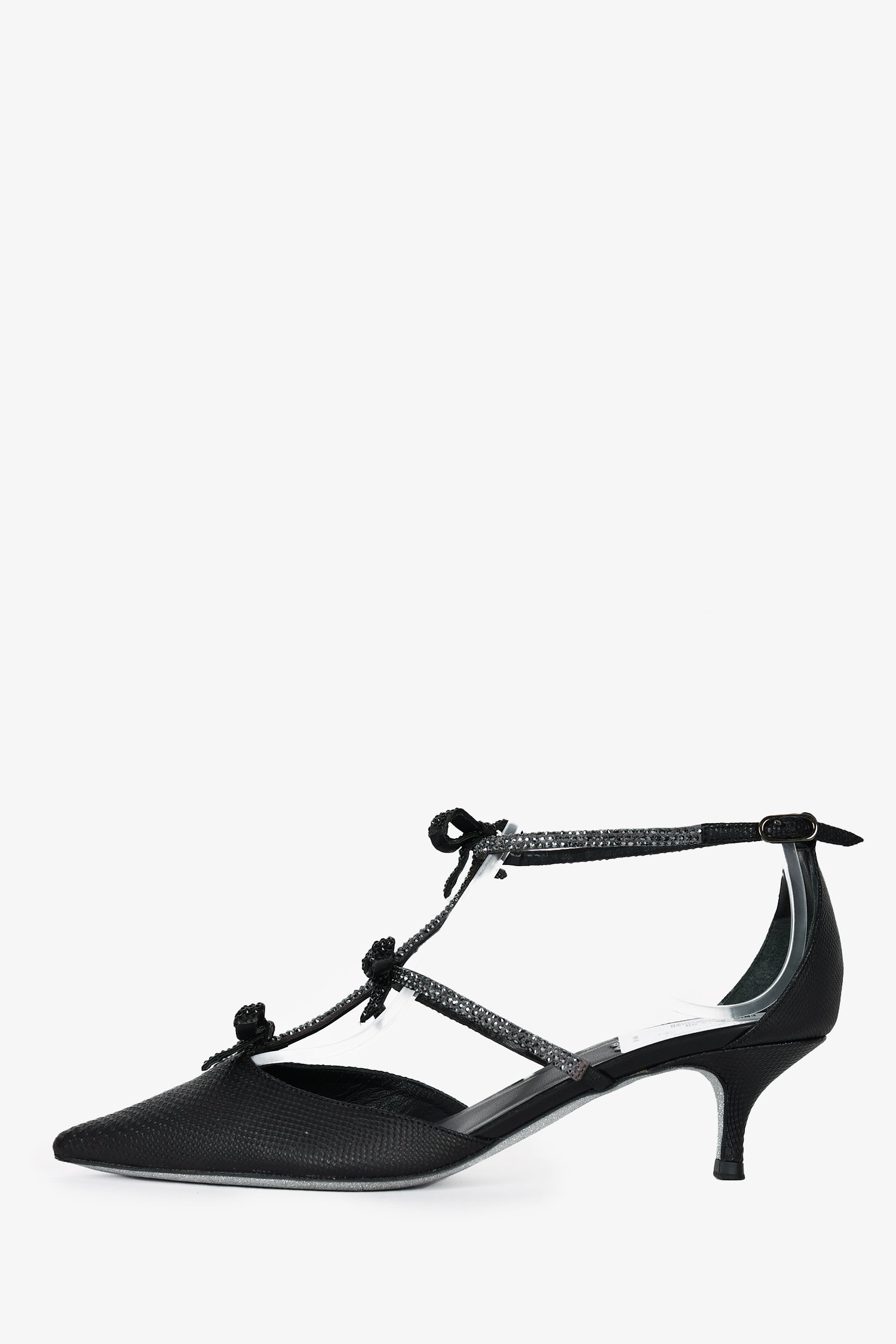 Refresh availabilityRene Caovilla Black Leather Crystal Bow Embellished Karung Heels. Signature sparkly bottoms. Slip-on. Pointed toe. Ankle strap with buckle closure. Tonal stitching.