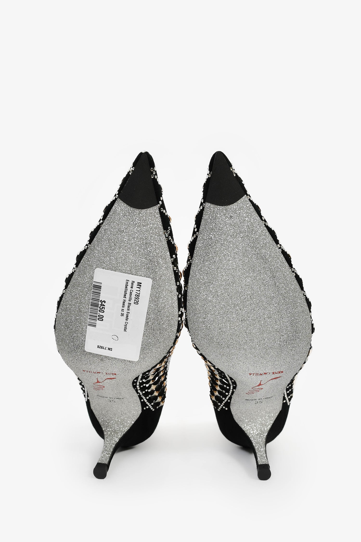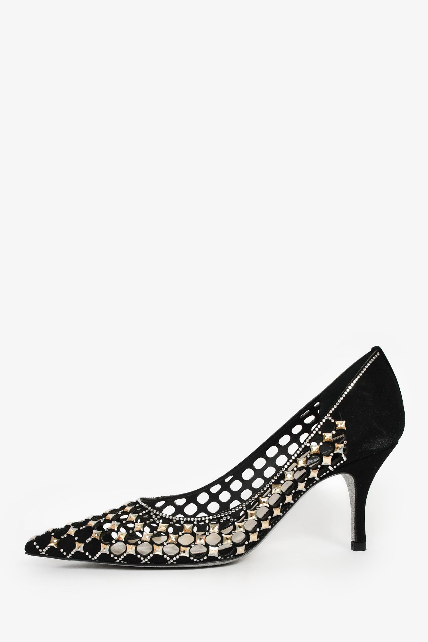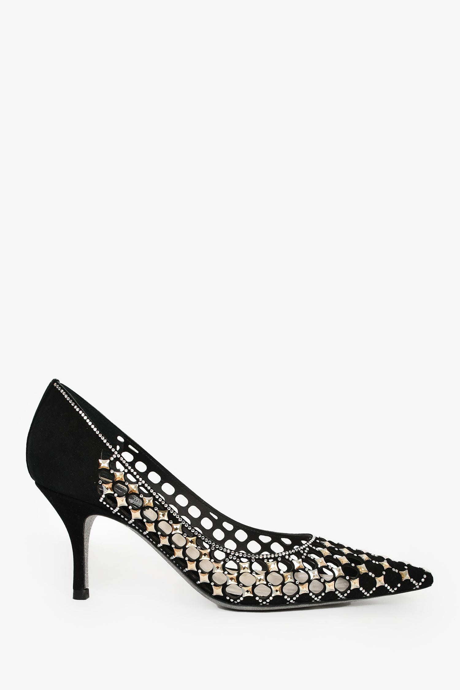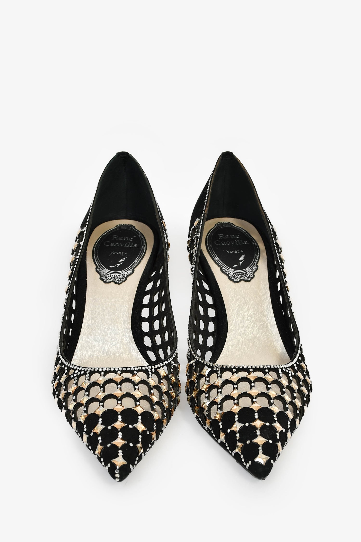 Refresh availabilityRene Caovilla Black Suede Crystal Embellished Heels. Slip-on. Pointed toe. Tonal stitching.