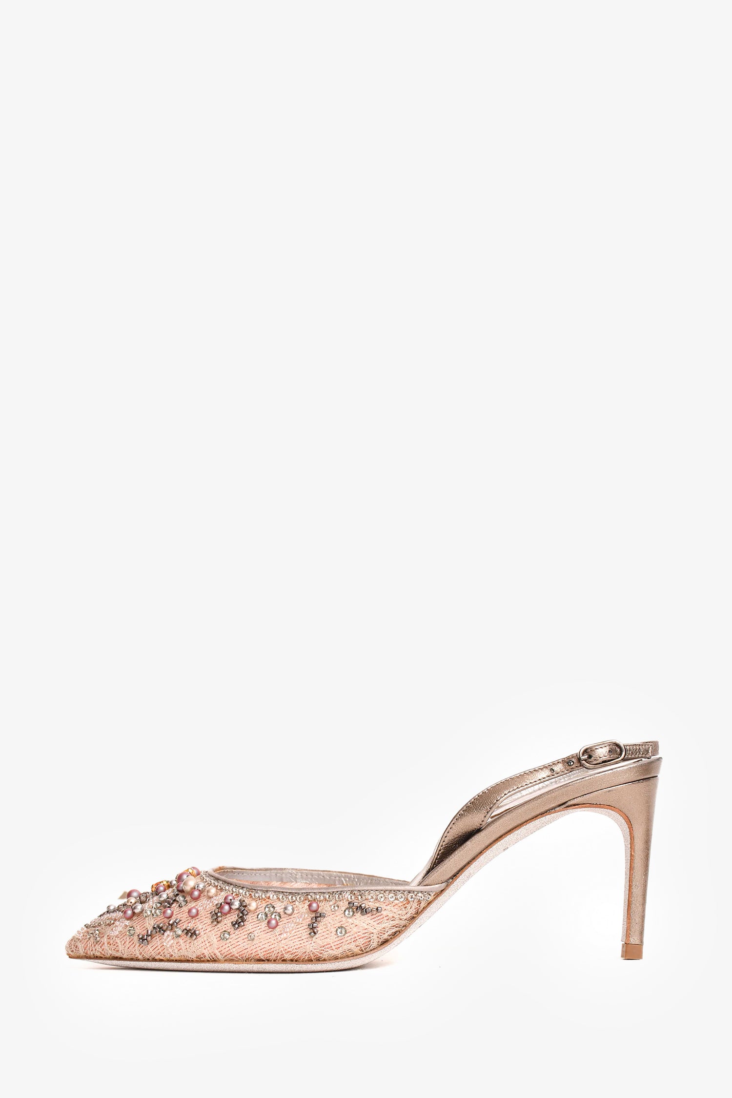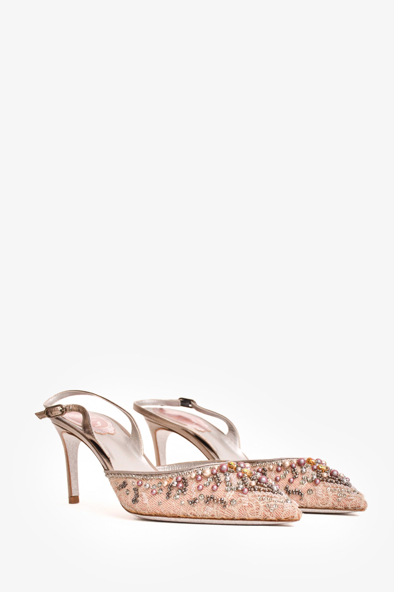Refresh availabilityRene Caovilla Pink/White Embellished Slingback Heels. Pointed toe front. Ankle strap with a pin buckle. Tonal stitching.