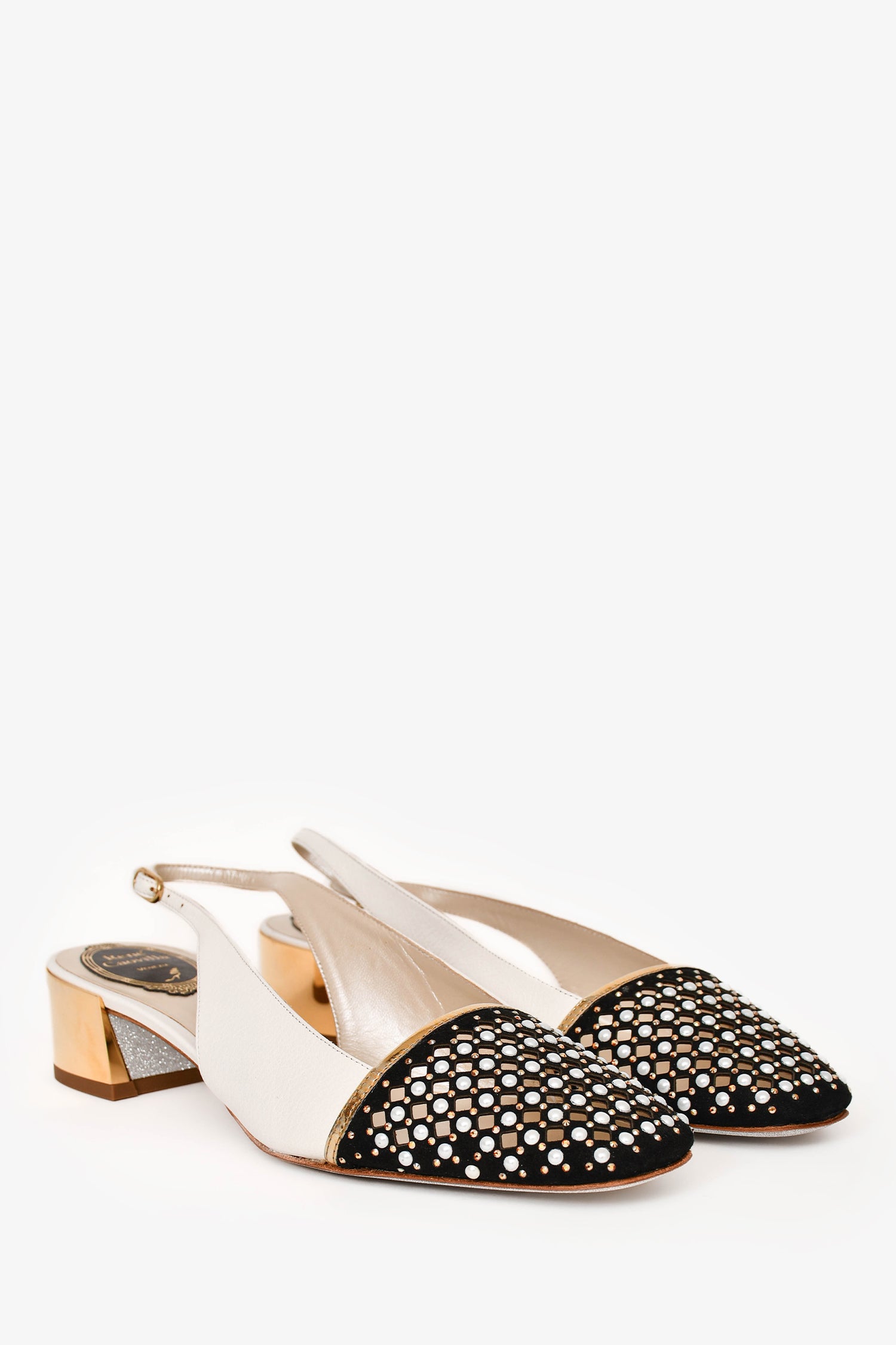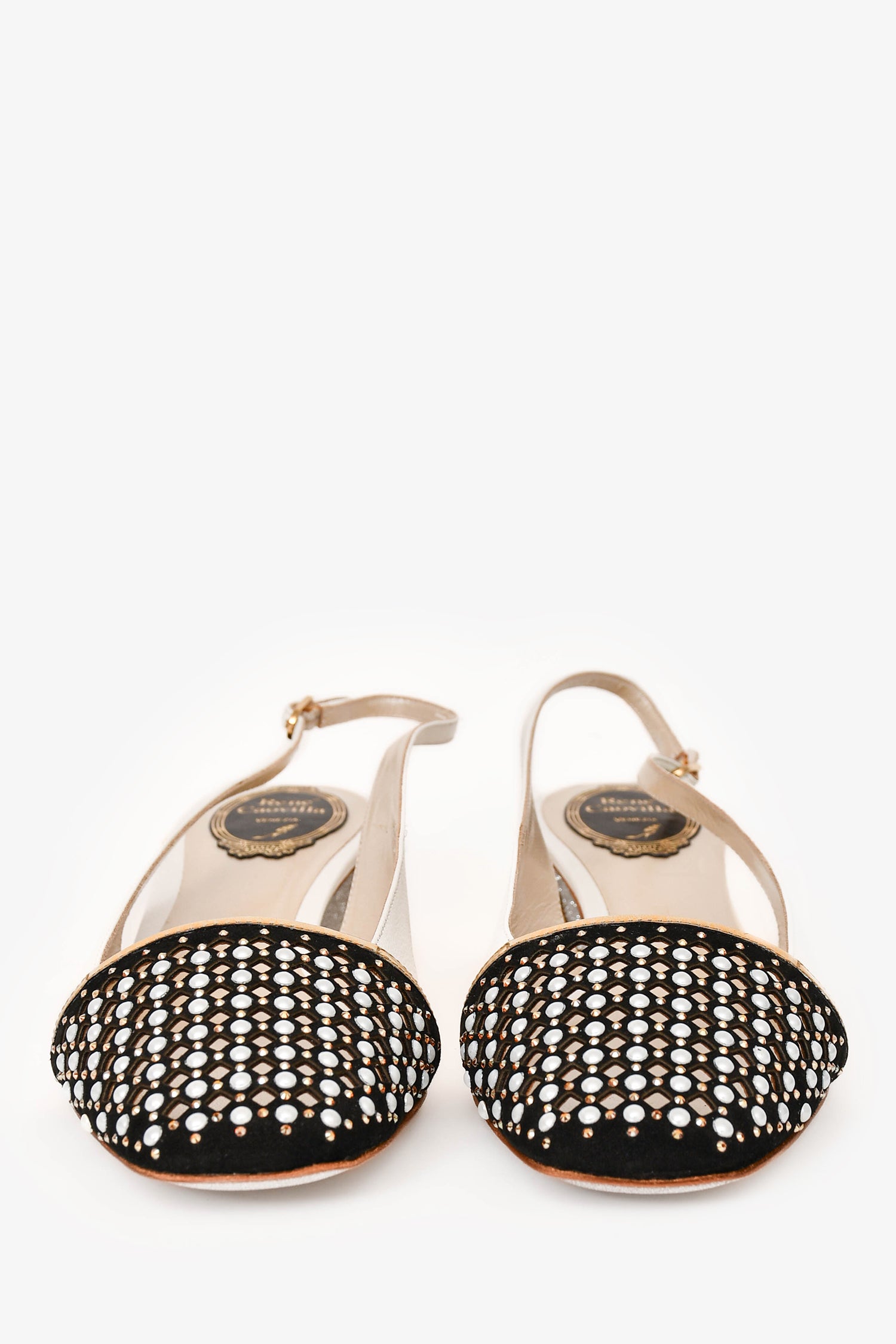 Rene Caovilla White/Black Suede/Leather Crystal Embellished Slingbacks Size 38