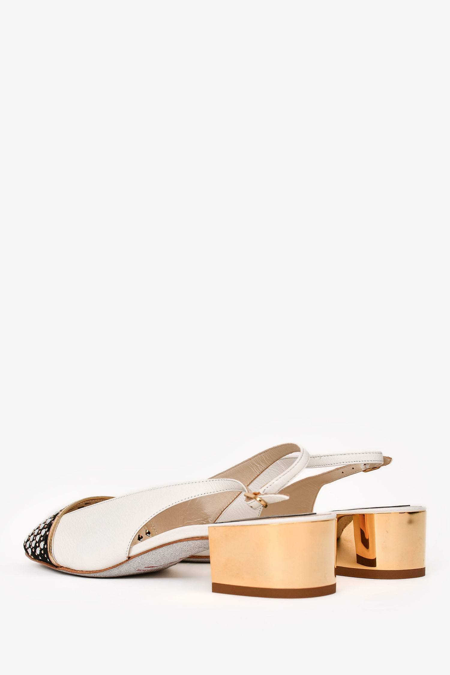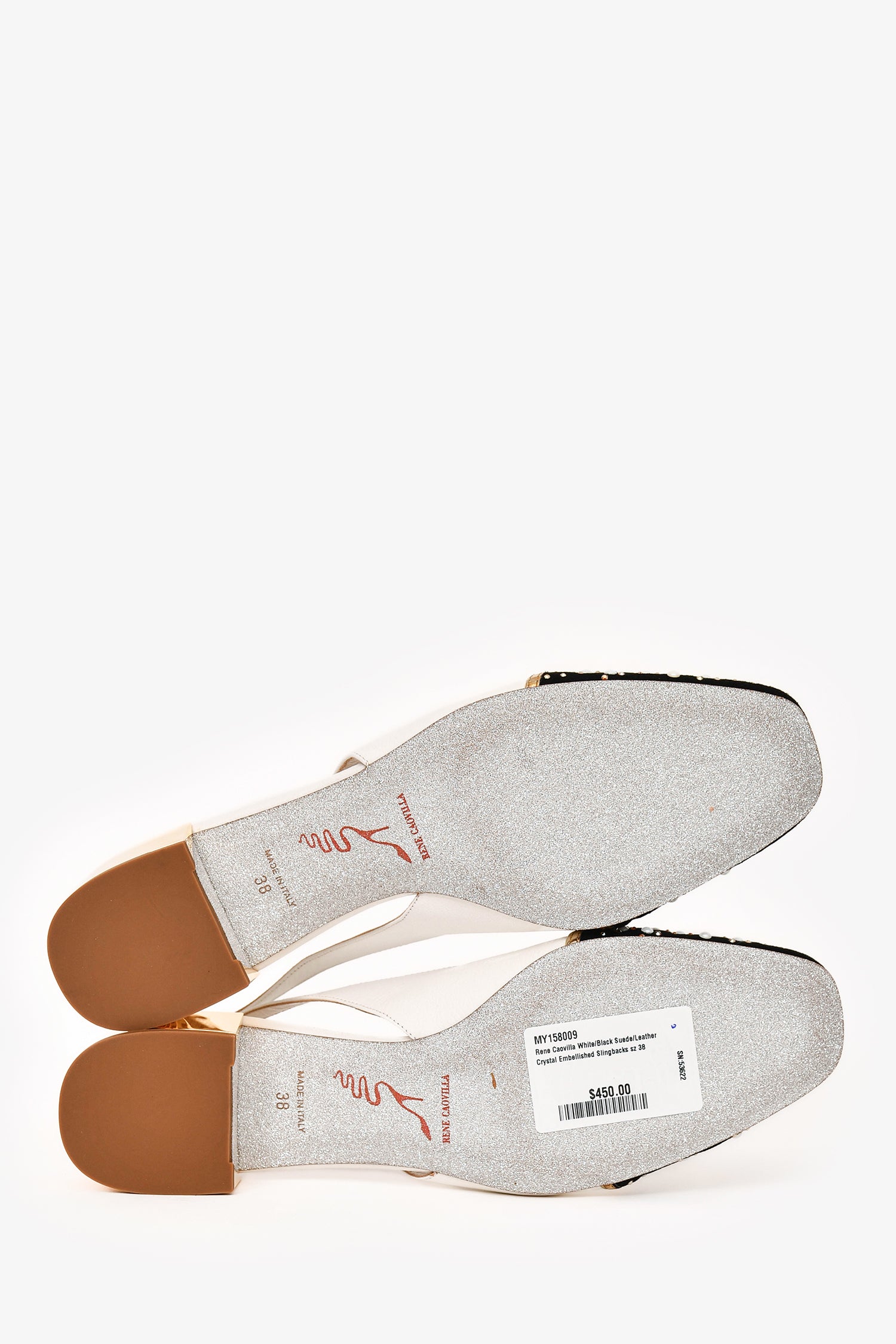 Refresh availabilityRene Caovilla White/Black Suede/Leather Crystal Embellished Slingbacks. square toe. Crystal embellishments on the front. Adjustable slingback strap. Glitter silver outer sole.