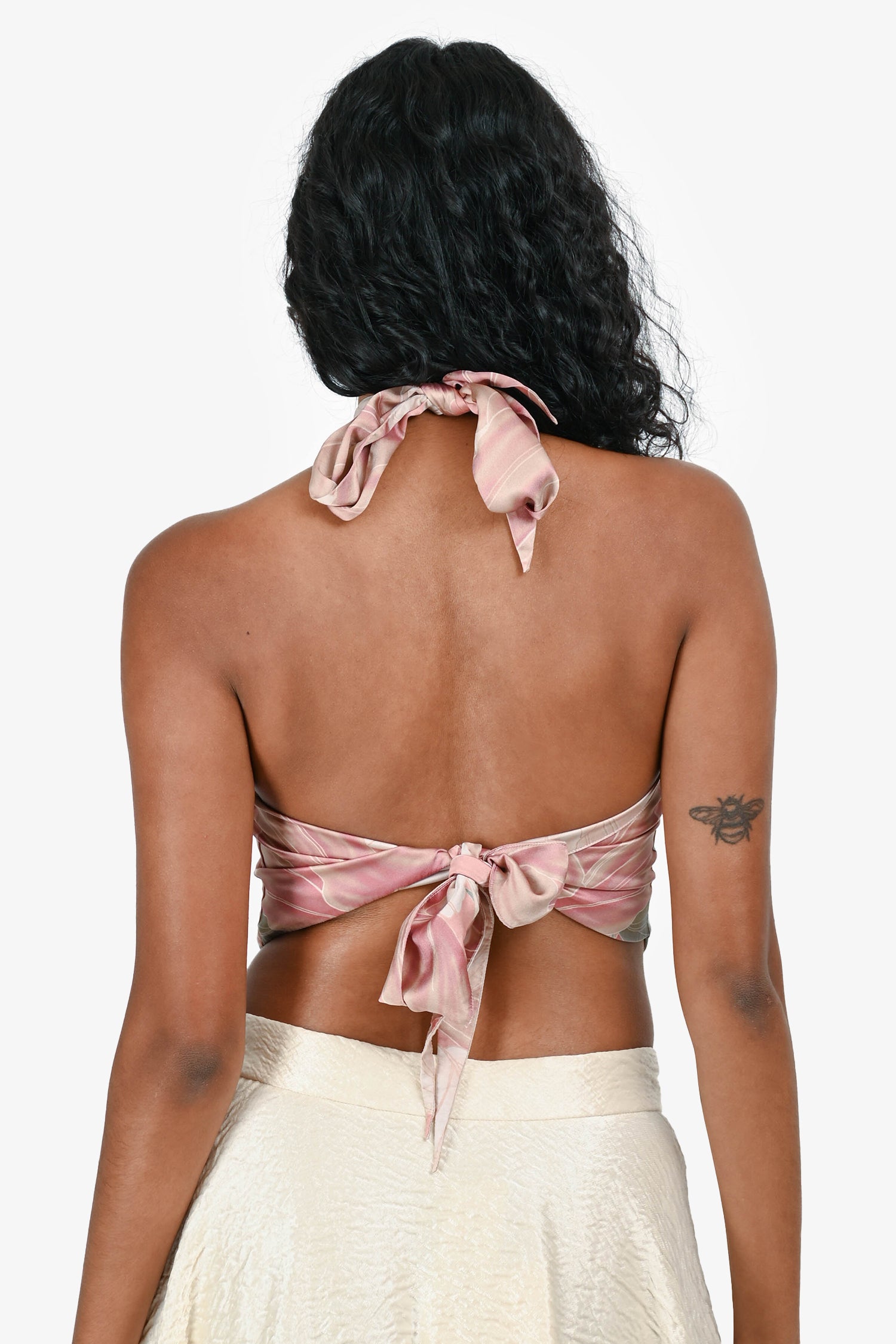 Refresh availabilityRetrofete Pink/Grey Satin Halterneck Top. Halterneck tie closure. Open back. Back tie closure.Tonal stitching.