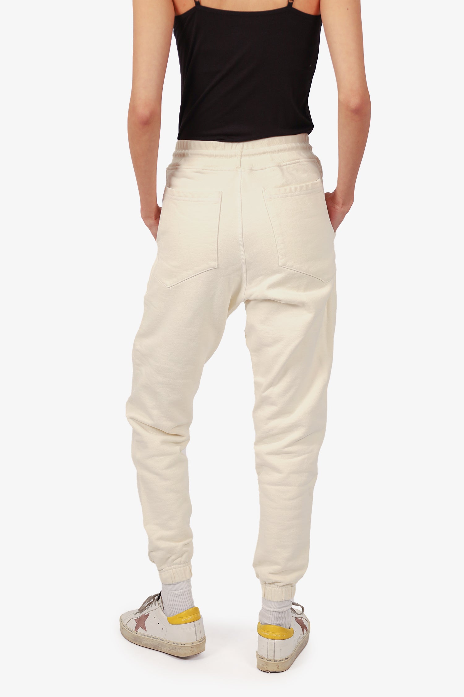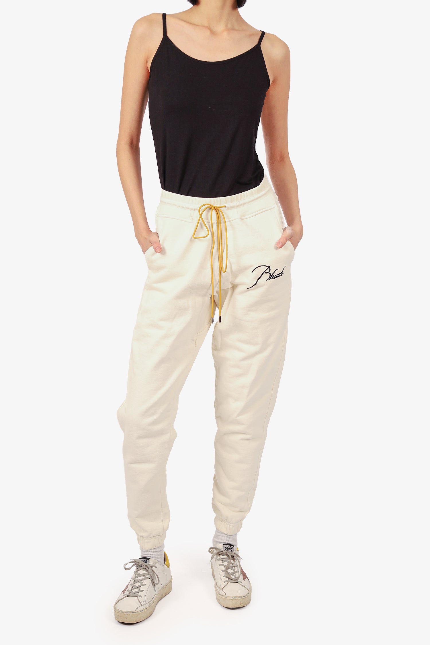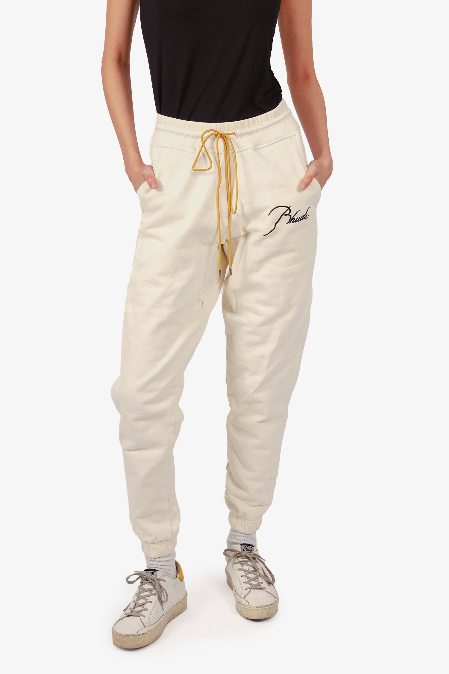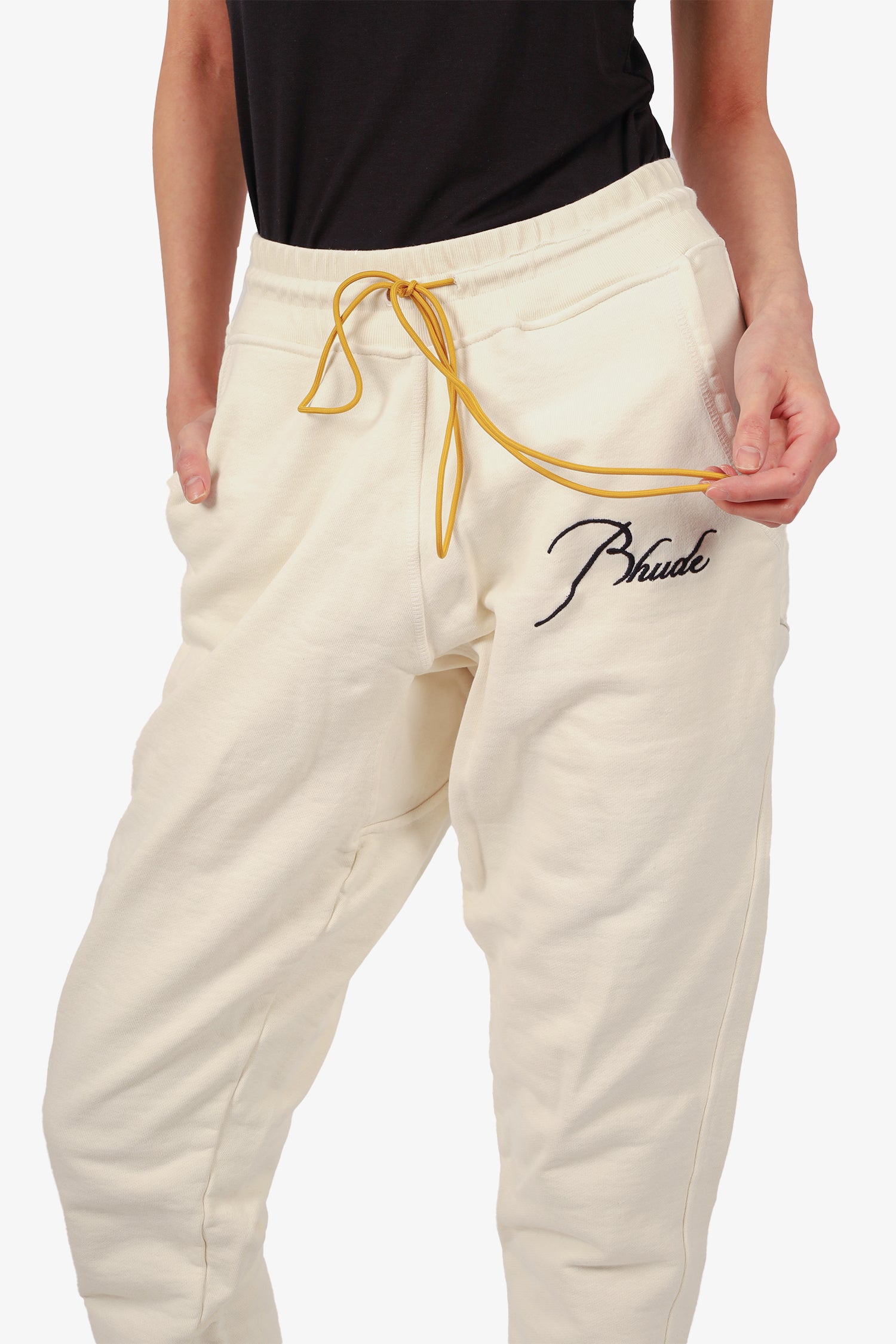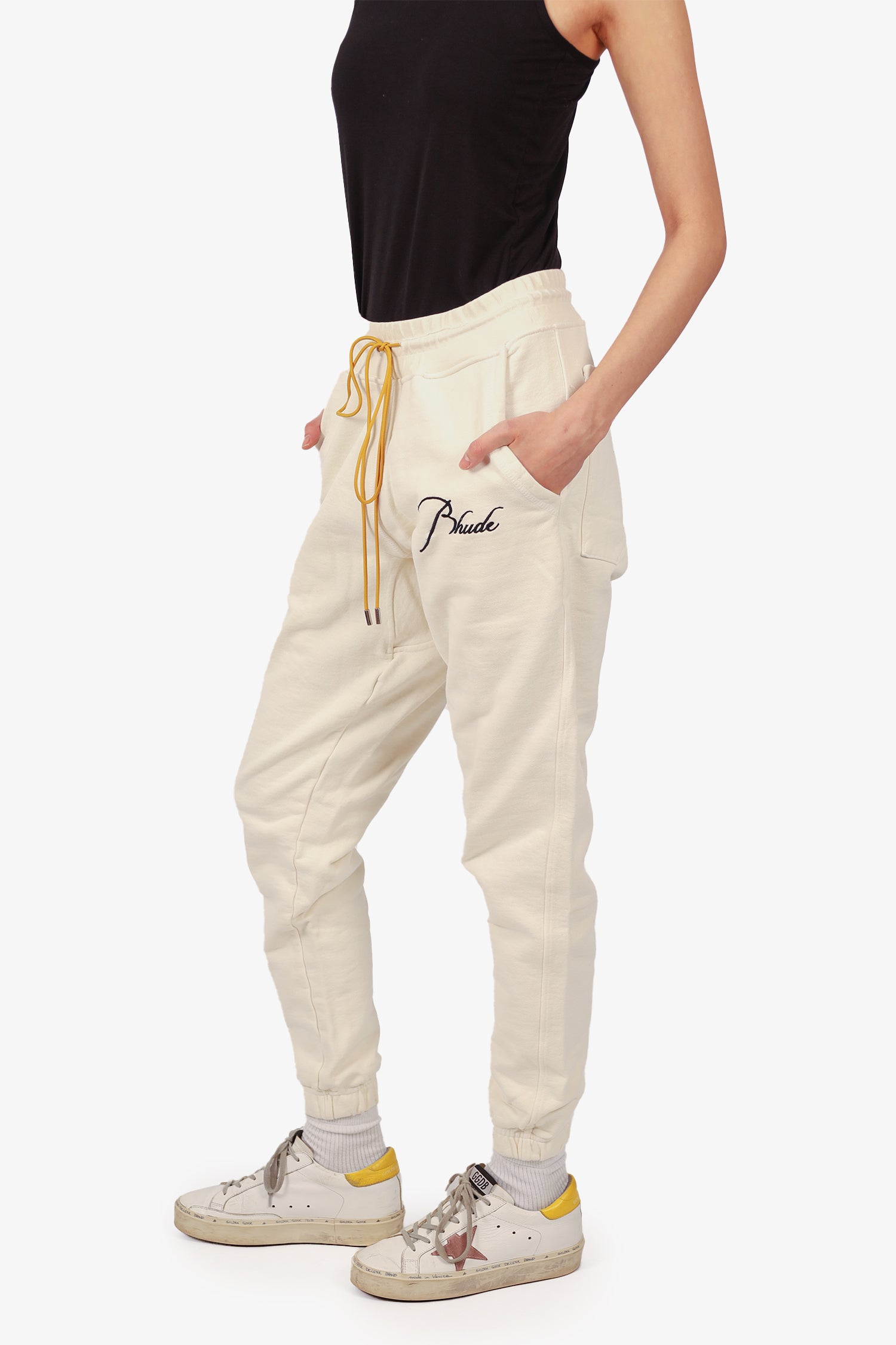 Refresh availabilityRhude White Logo Sweatpants. Pull-on. Elasticated waistband with drawstrings. Elasticated ankle cuffs. 4 exterior pockets; 2 front side slip and 2 rear slip. Silver-tone hardware. Tonal stitching.