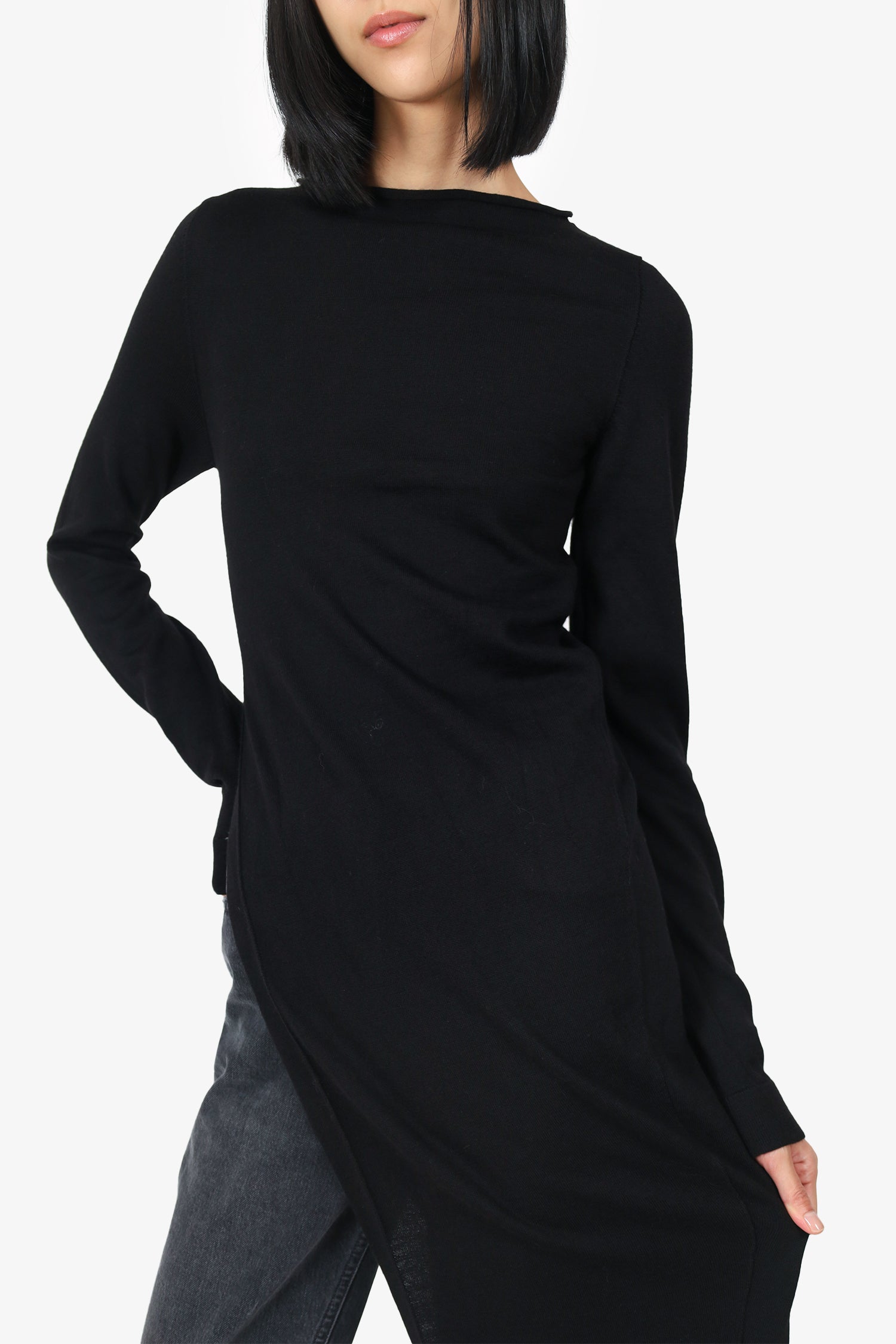 Refresh availabilityRick Owens Black Wool High Slit Long Top. Pull-on. Round neckline. Bottom exaggerated slit. Tonal stitching.