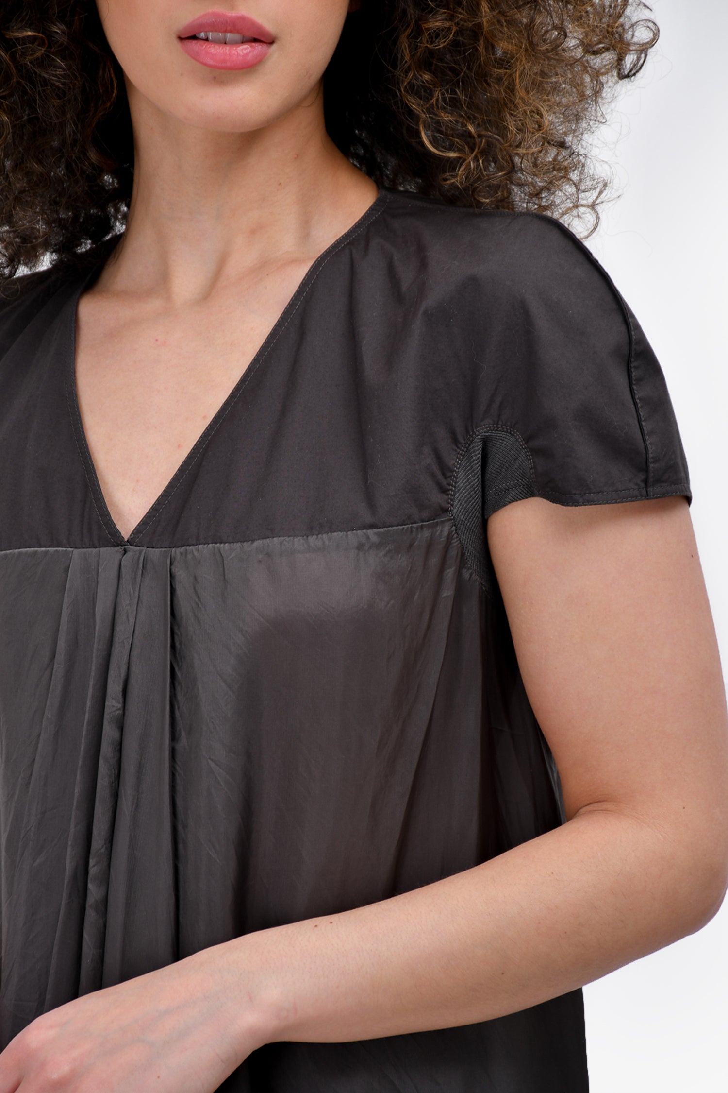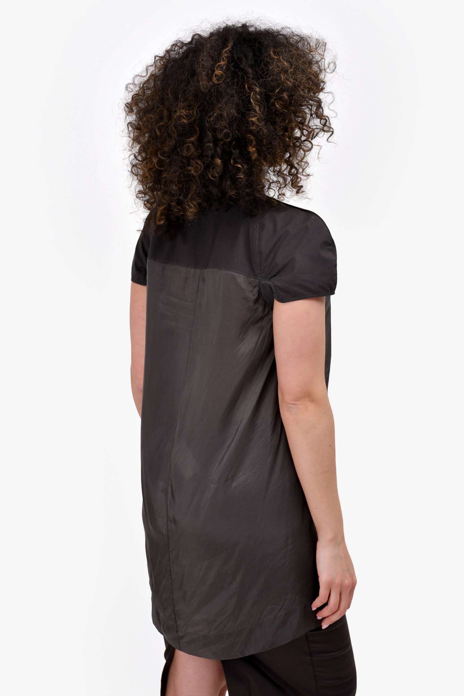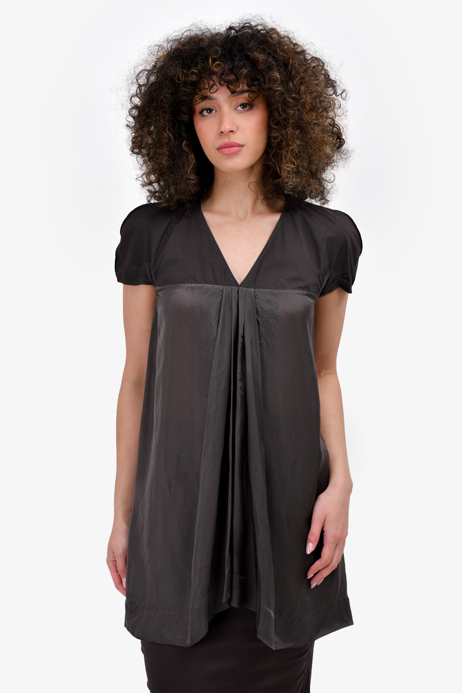 Refresh availabilityRick Owens Grey Short Sleeve Tunic. V-neckline. Puffy short sleeve. long length. Tonal stitching.