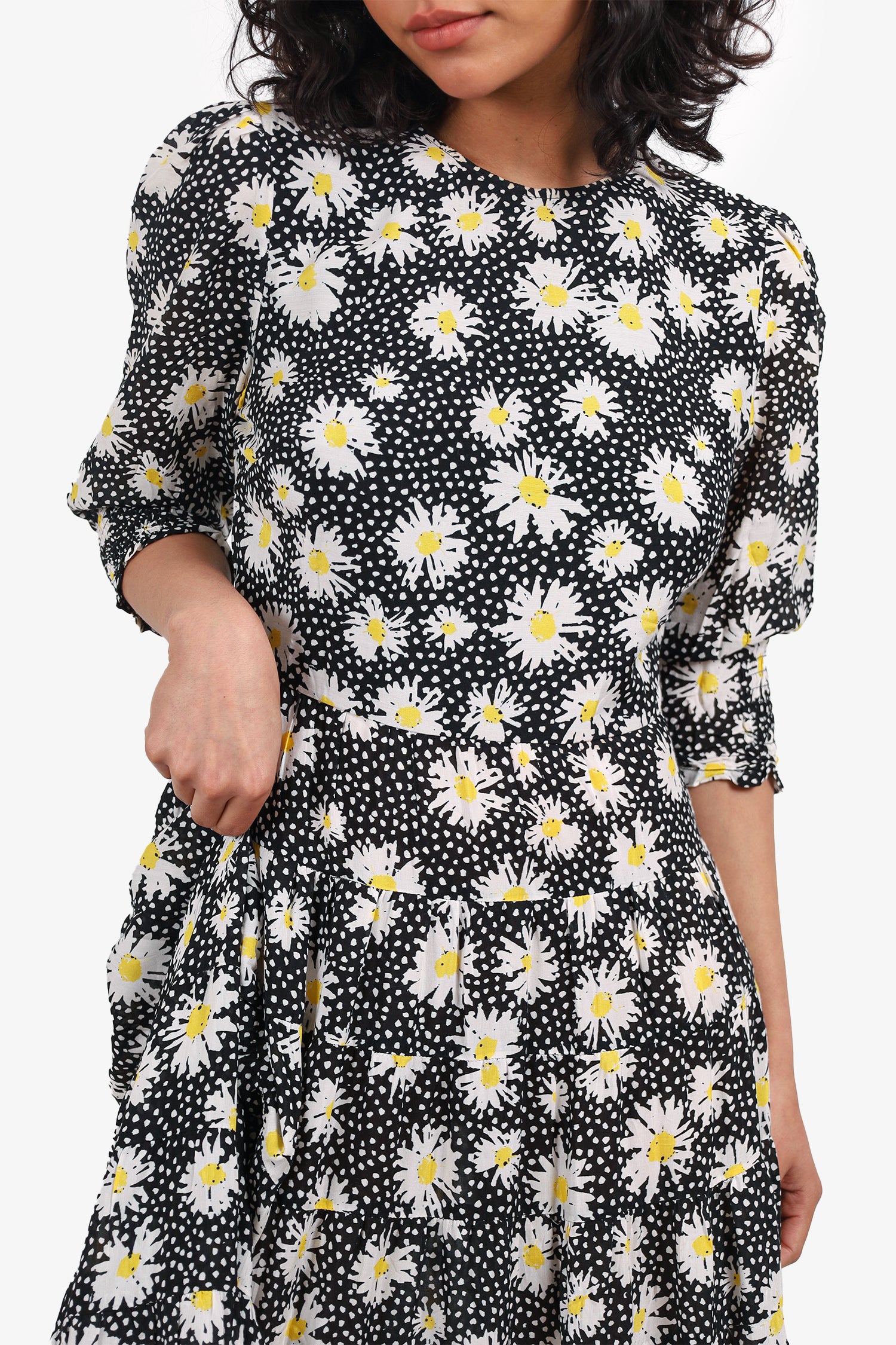Refresh availabilityRixo Black/Yellow Daisy Polka-Dot Print Maxi Dress. Pull-on. Round-neckline. Rear key-hole with button-up closure. Elasticated and ruched sleeve cuffs. Tonal stitching.