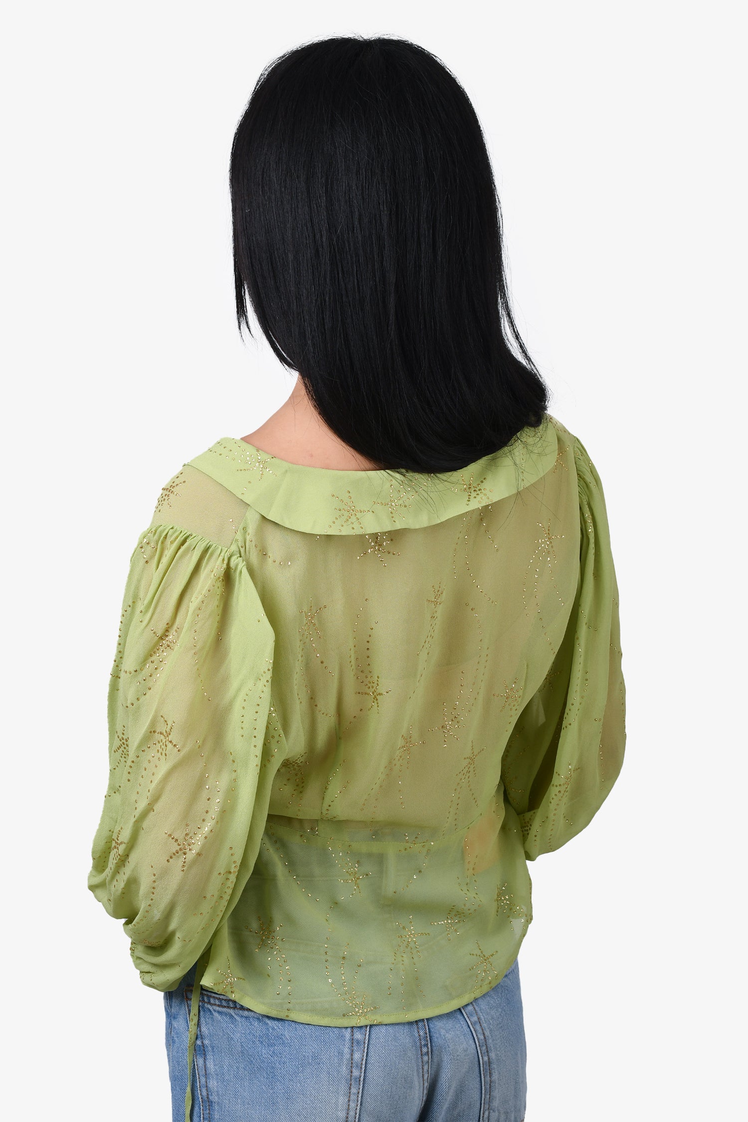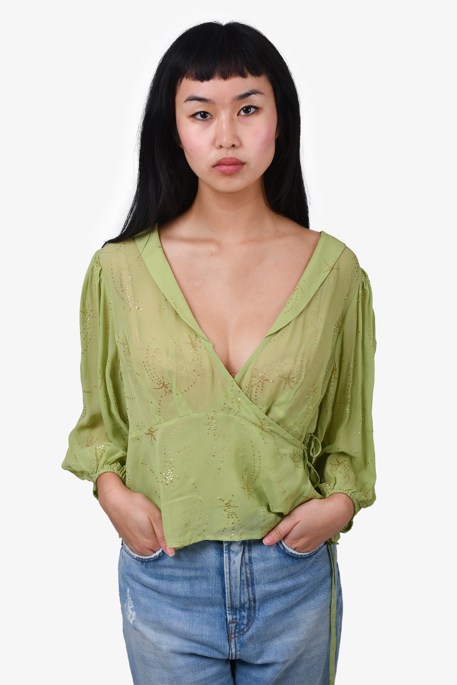 Refresh availabilityRixo Green/Gold Printed Sheer Wrap Top. Elasticized cuffs. Tonal stitching.