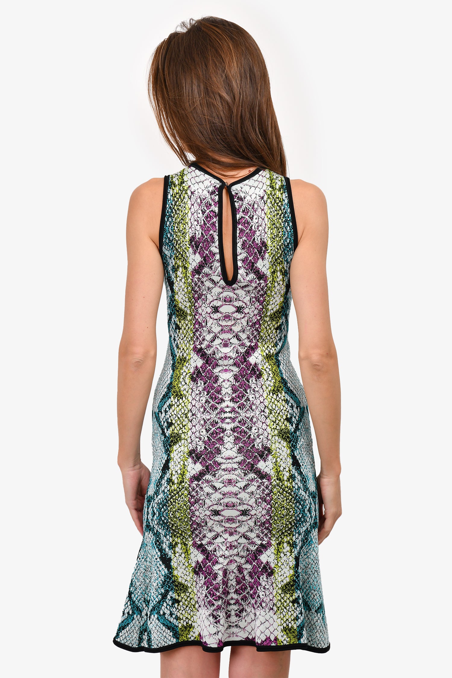 Refresh availabilityRoberto Cavalli 2000s Purple/Blue Snake Print Knit Sleeveless Midi Dress. Round neck. Unlined. Single rear button closure. Tonal stitching.