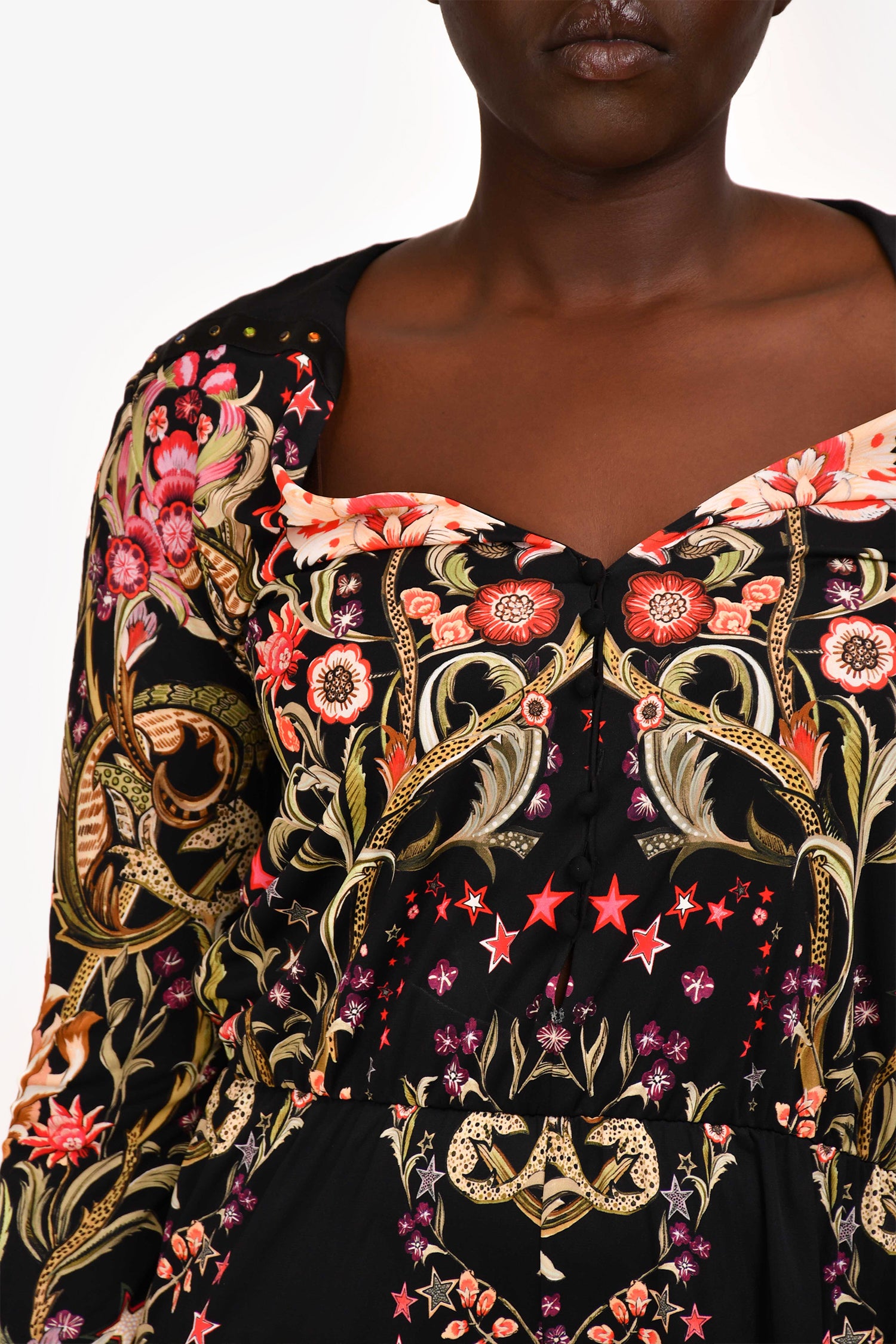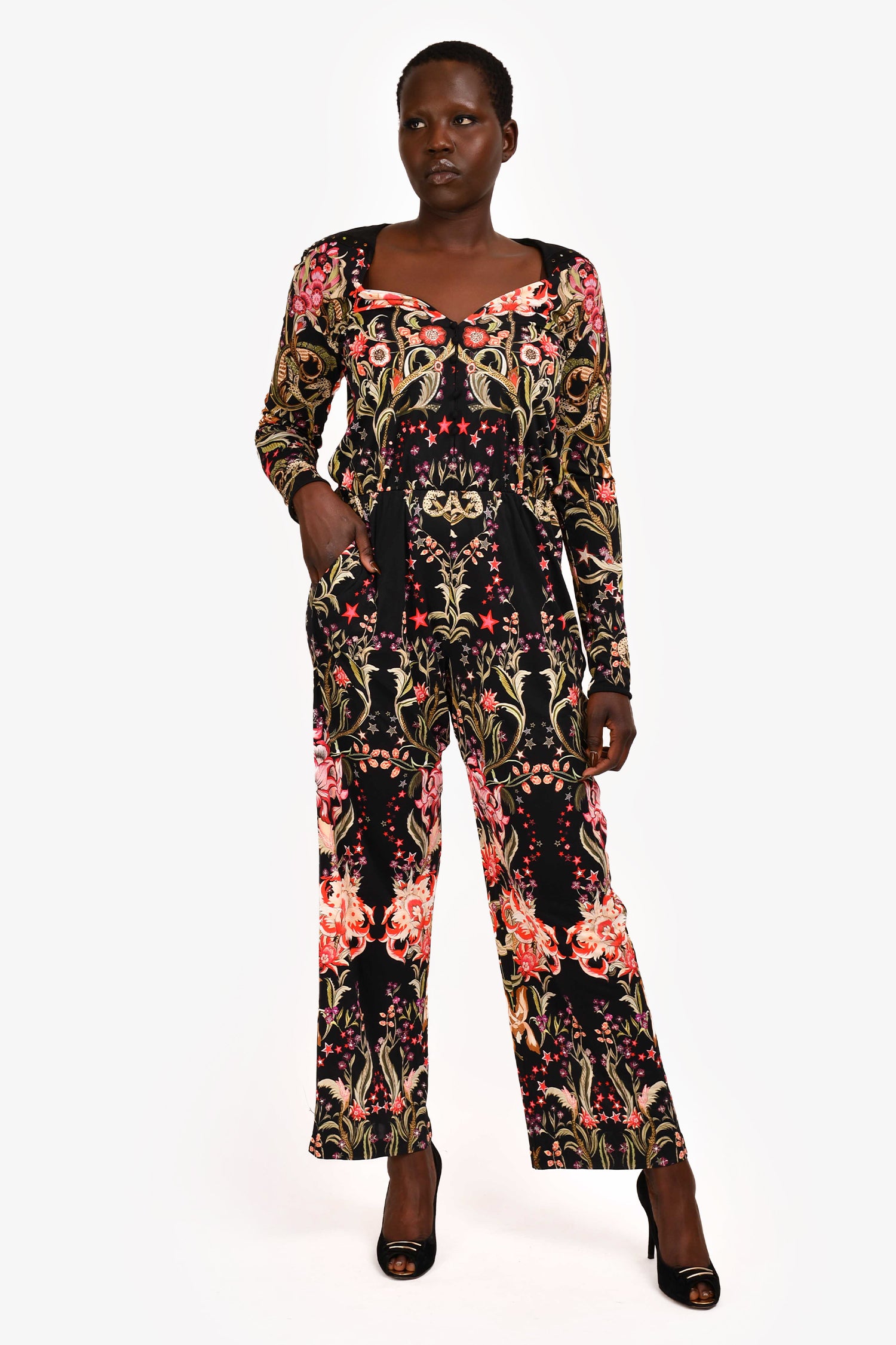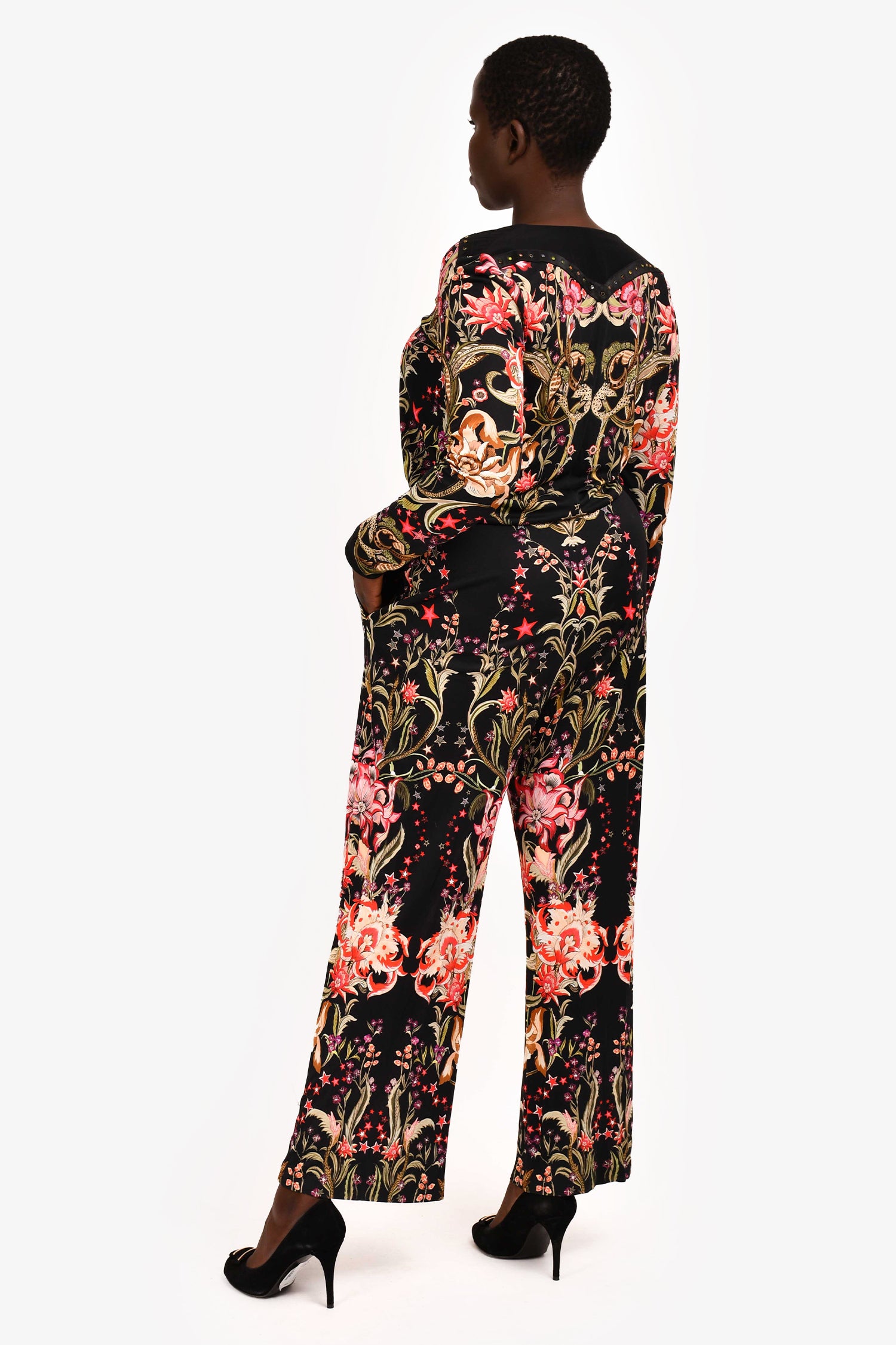 Refresh availabilityRoberto Cavalli Black Multicolour Floral Pattern Long Sleeves Wide Leg Jumpsuit. V-neckline with button-up closure. Wide-leg silhouette. Tonal stitching.