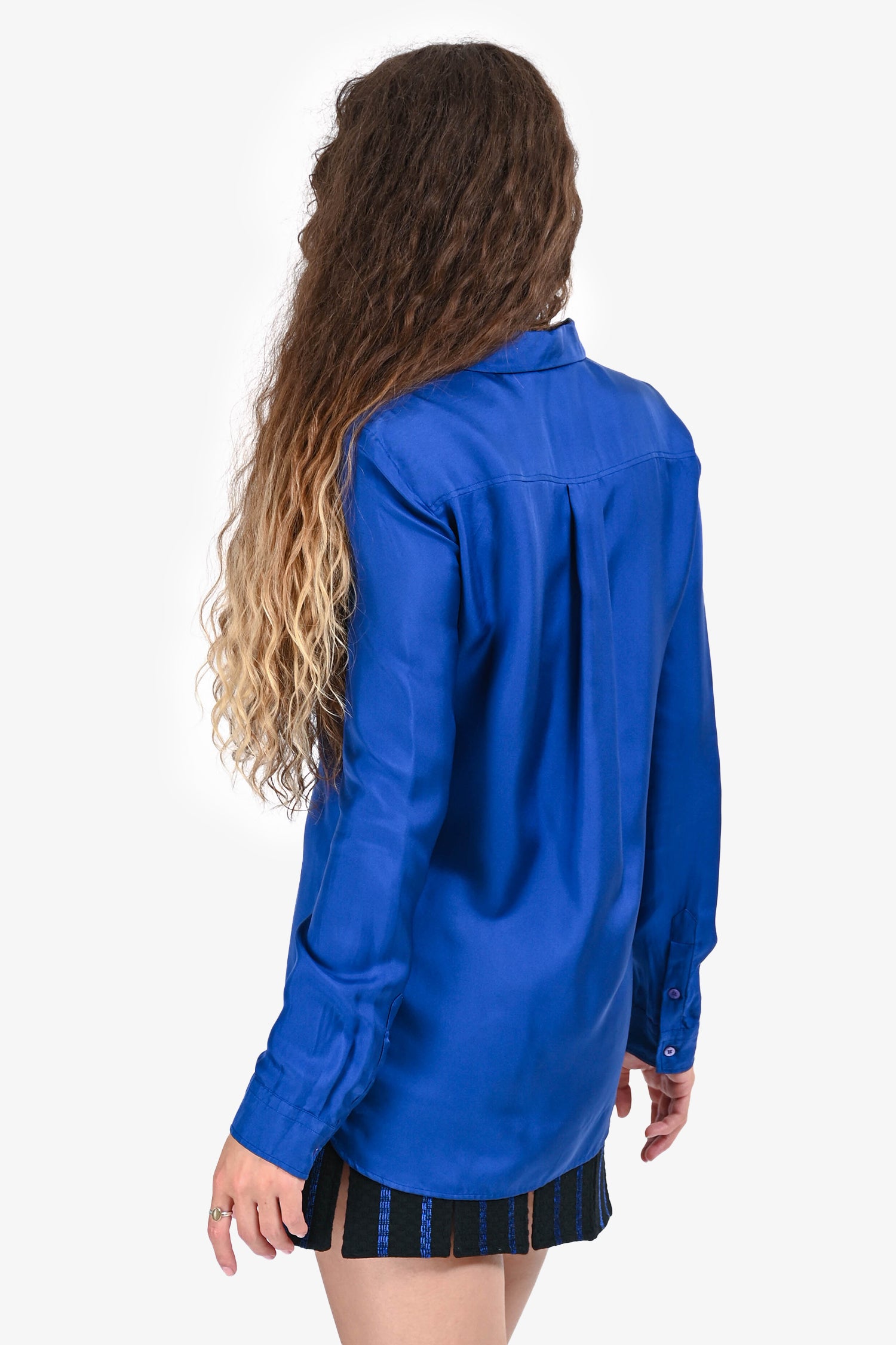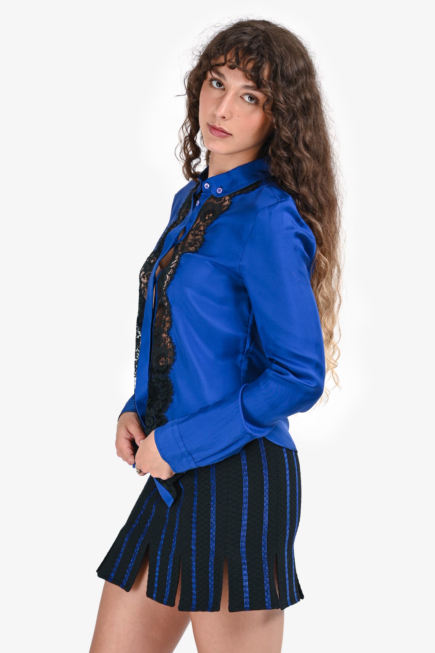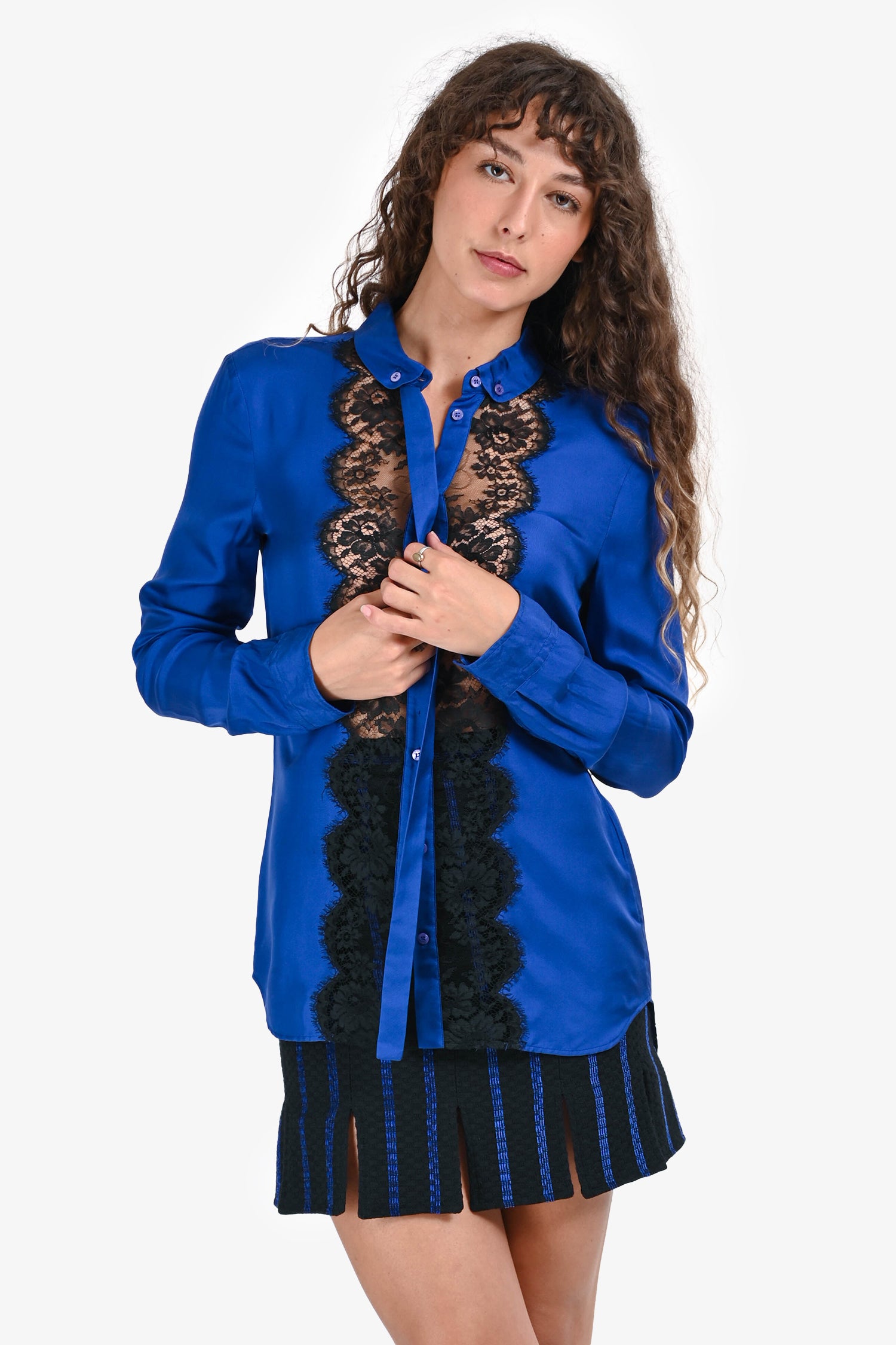 Refresh availabilityRoberto Cavalli Blue Silk Black Lace Detail Button Up Top. Classic point collar. Front button closure. Long sleeves with buttoned cuffs. Tonal stitching.