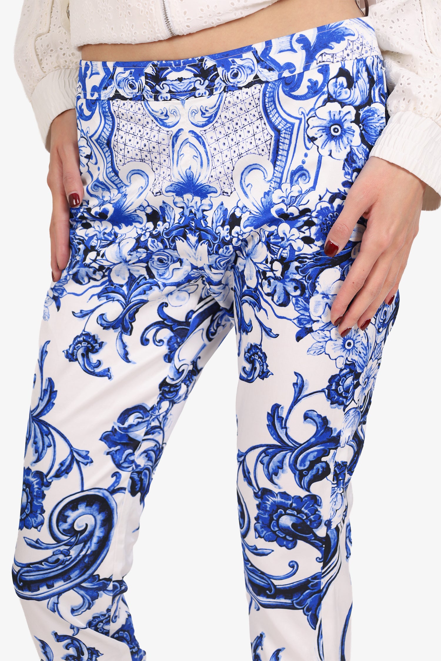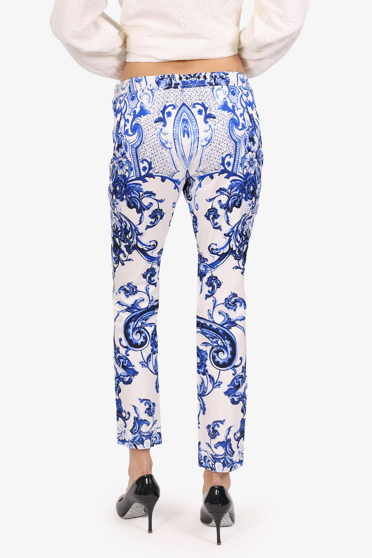 Refresh availabilityRoberto Cavalli Blue/White Cotton Floral Capri Pants. Slip-on. Side zip with snap button-up closure. Contrast and tonal stitching.