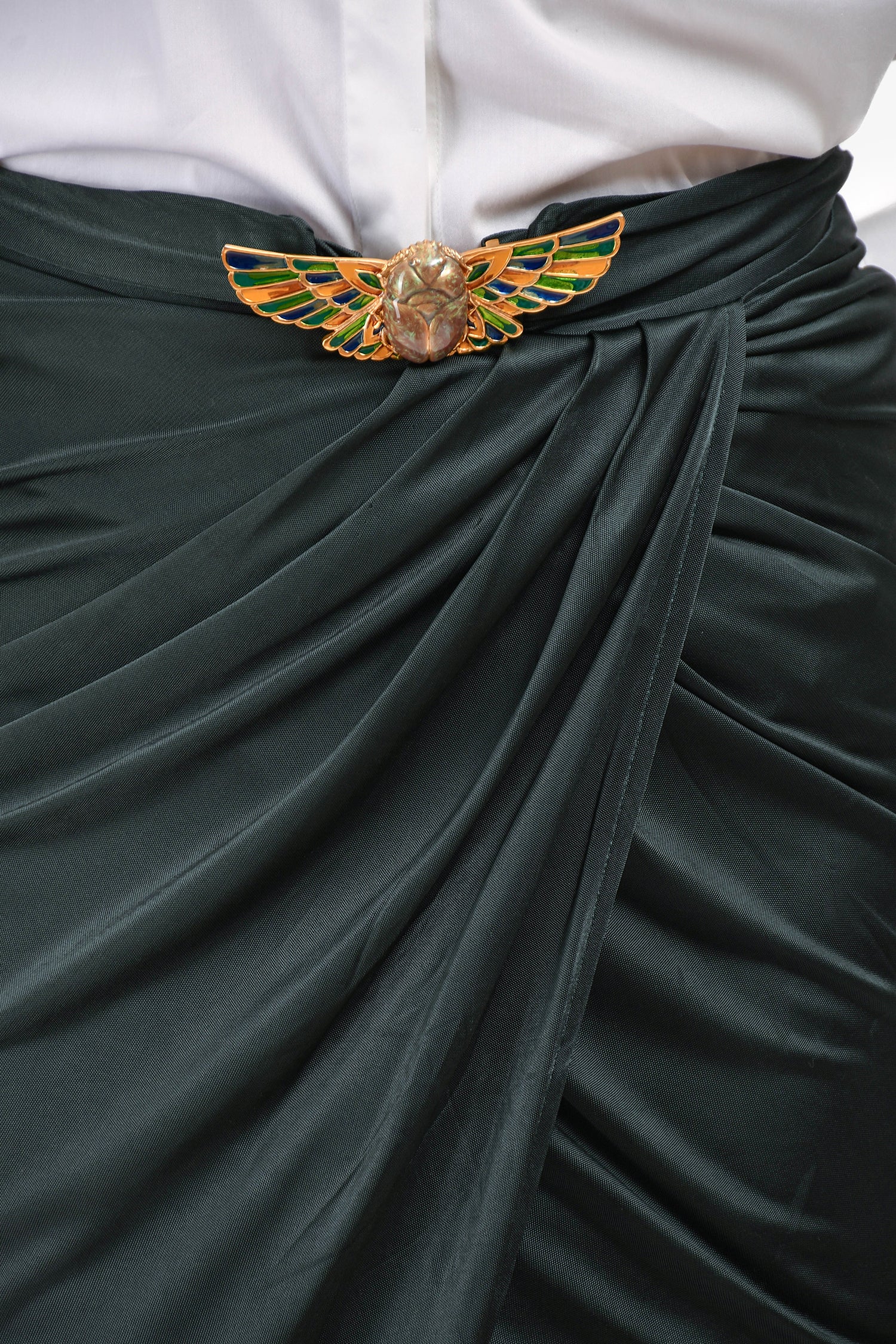 Refresh availabilityRoberto Cavalli Class Green Egyptian Beetle Clasp Detail Mini Skirt. Gold-tone beetle clasp detail at front. Fitted silhouette. Back zip closure. Fully lined. Tonal stitching.