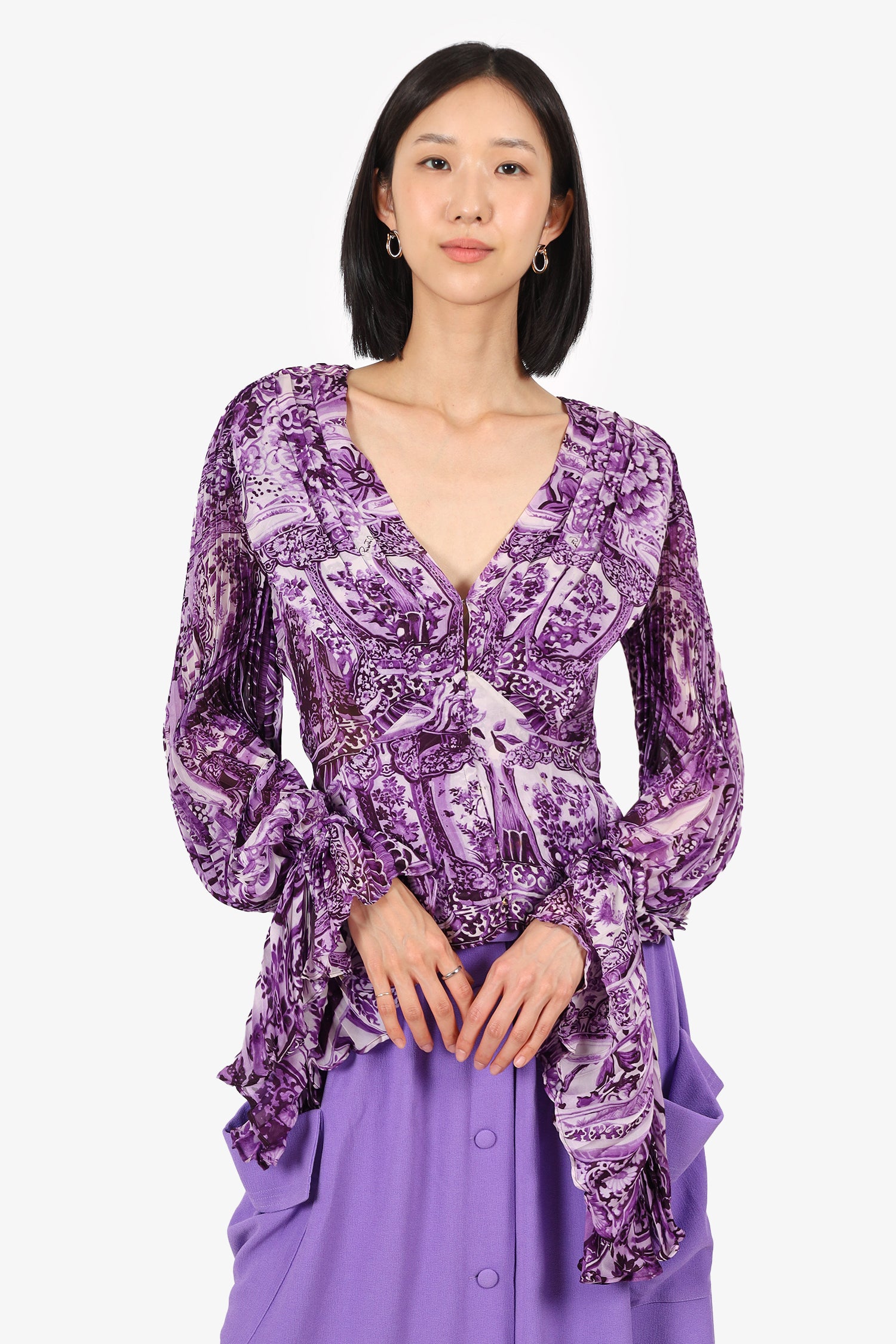 Refresh availabilityRoberto Cavalli Purple/White Floral Printed Long Sleeve V-Neck Blouse. Pull-on. V-neckline. Front hook closure. Elasticated sleeve cuffs. Pleating throughout. Tonal stitching.