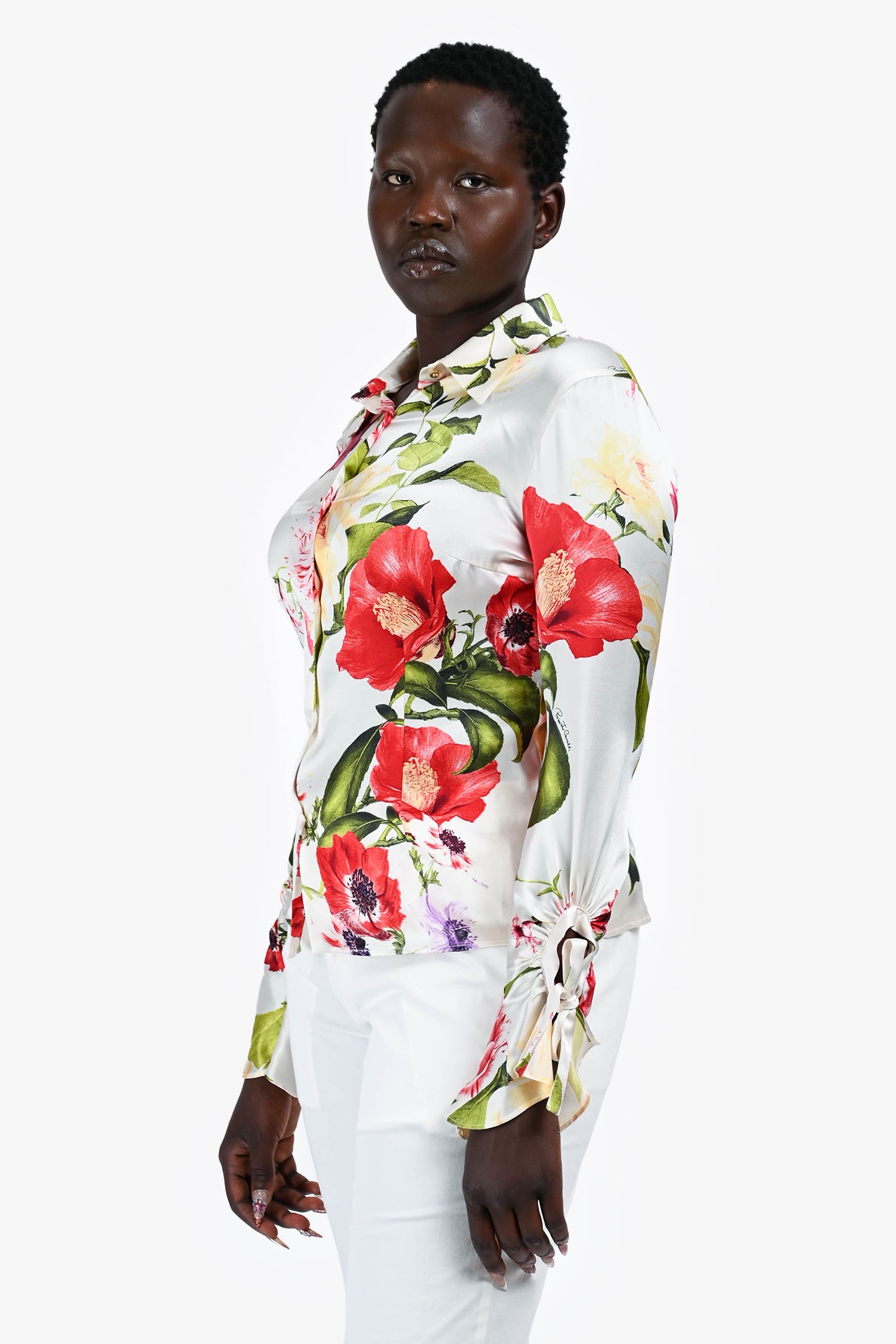 Refresh availabilityRoberto Cavalli White/Red Silk Floral Button Up Top. Pointed collar. Button front closure. Long sleeves with tie-detail cuffs. Tonal stitching.