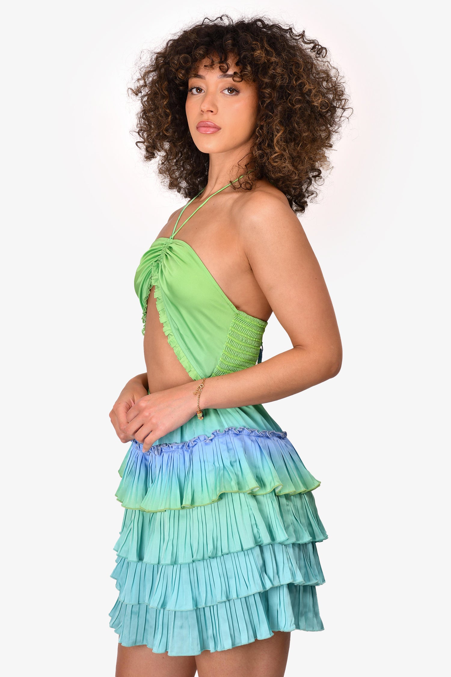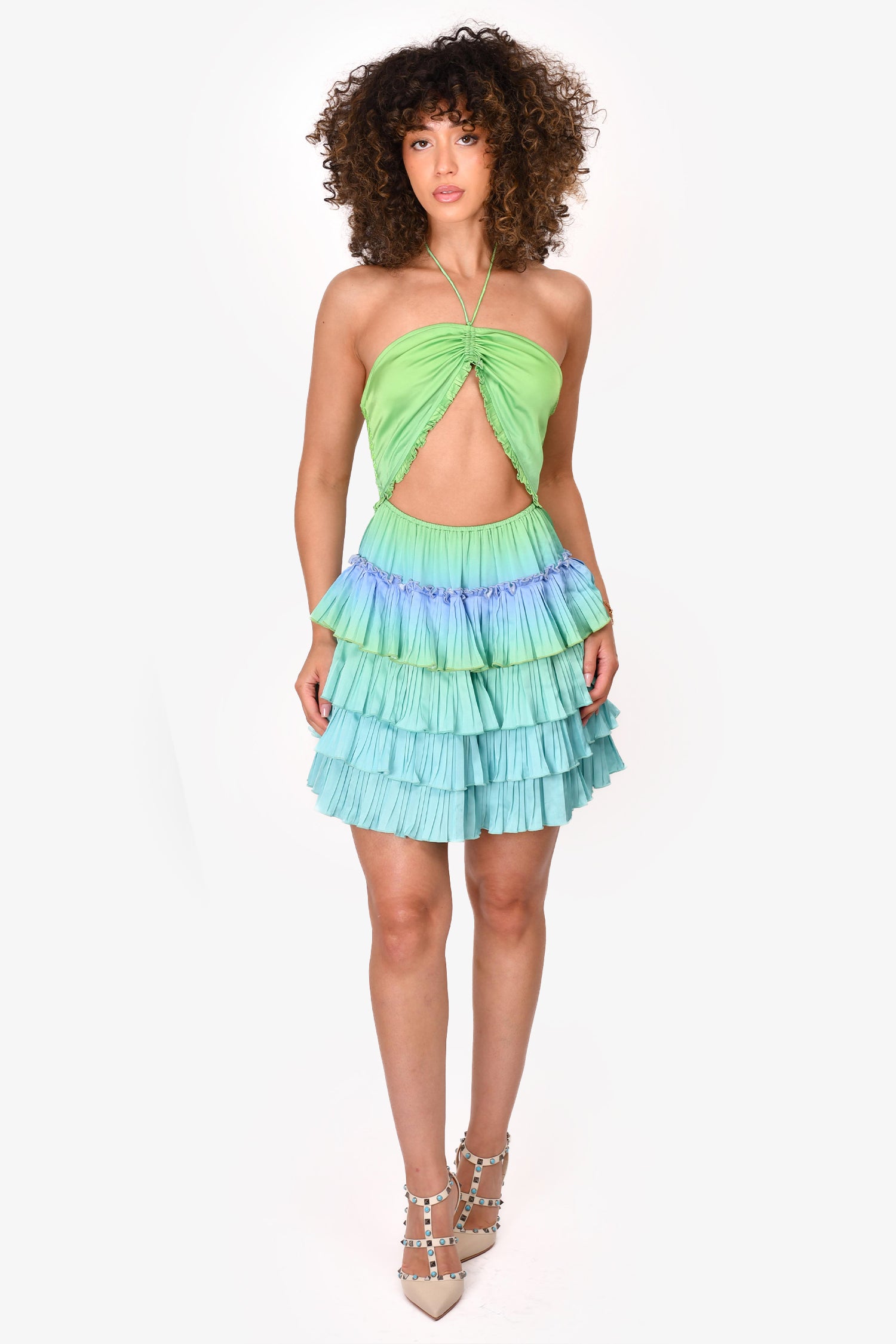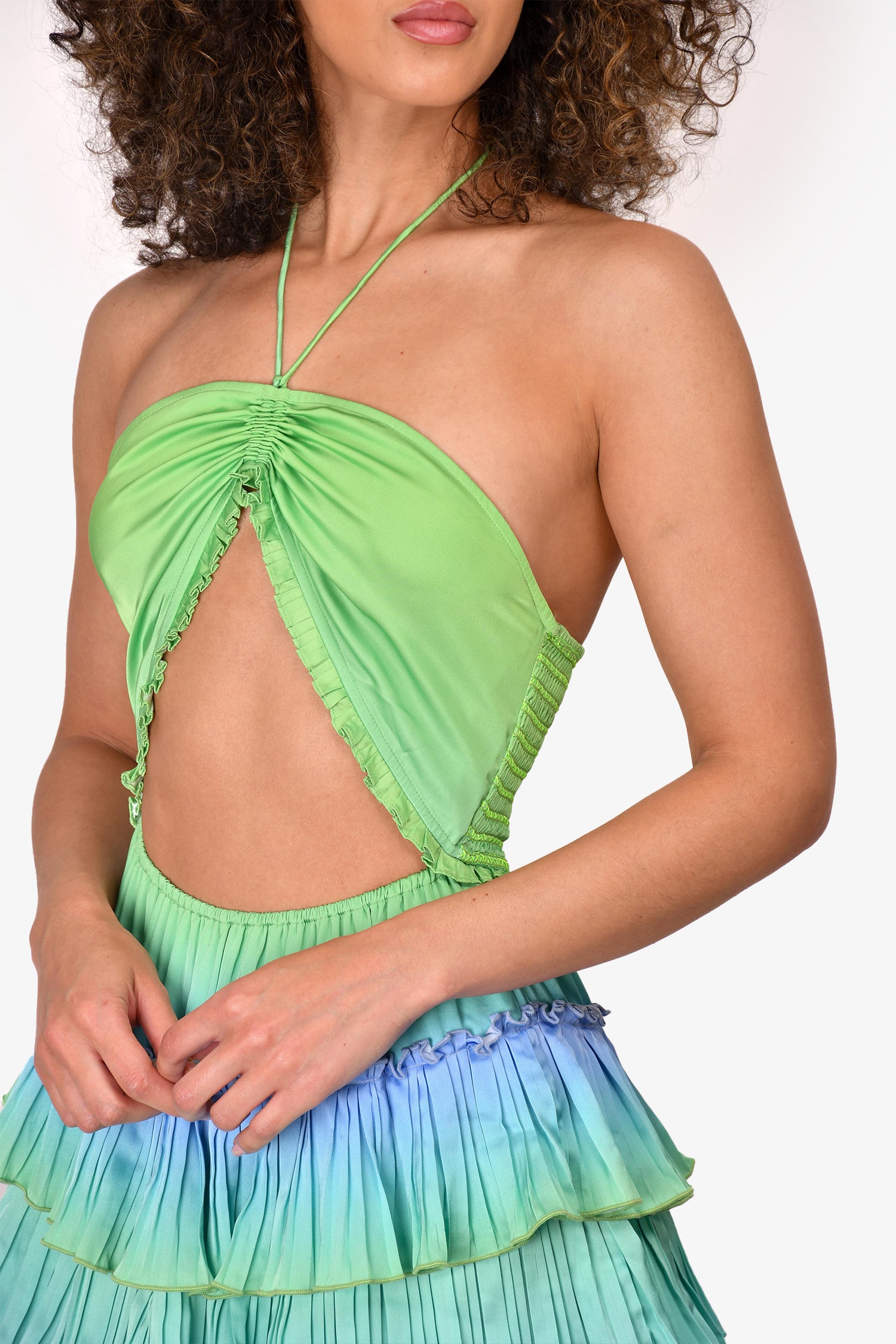 Refresh availabilityRococo Sand Green/Blue Cut-Out Pleated Sleeveless Mini 'Kiki' Dress. Halter neckline. Pull-on. Tiered pleated detail. Unlined. Tonal stitching. *Modelled in Size Small