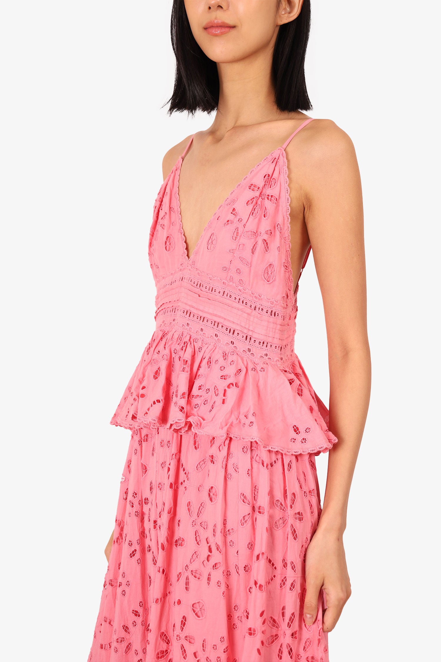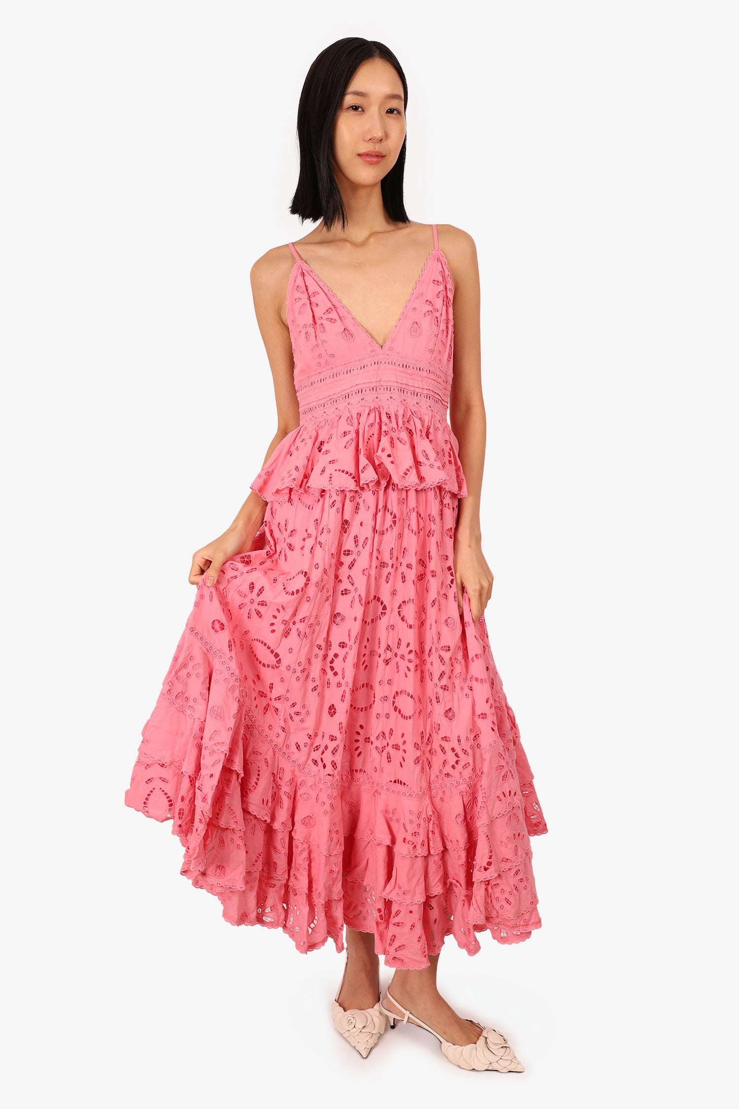 Refresh availabilityRococo Sands Pink Tiered Eyelet Sleeveless Maxi Dress. Slip-on. Rear zip with hook closure. V-neckline. Adjustable shoulder straps with slide buckle closure. Perforated exterior. Attached interior-lining. Gold-tone hardware.