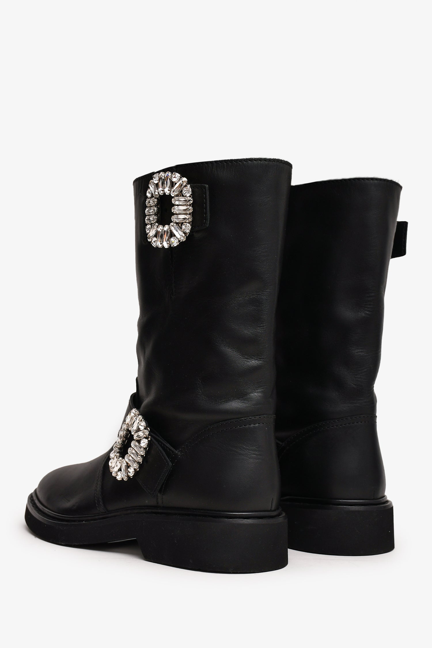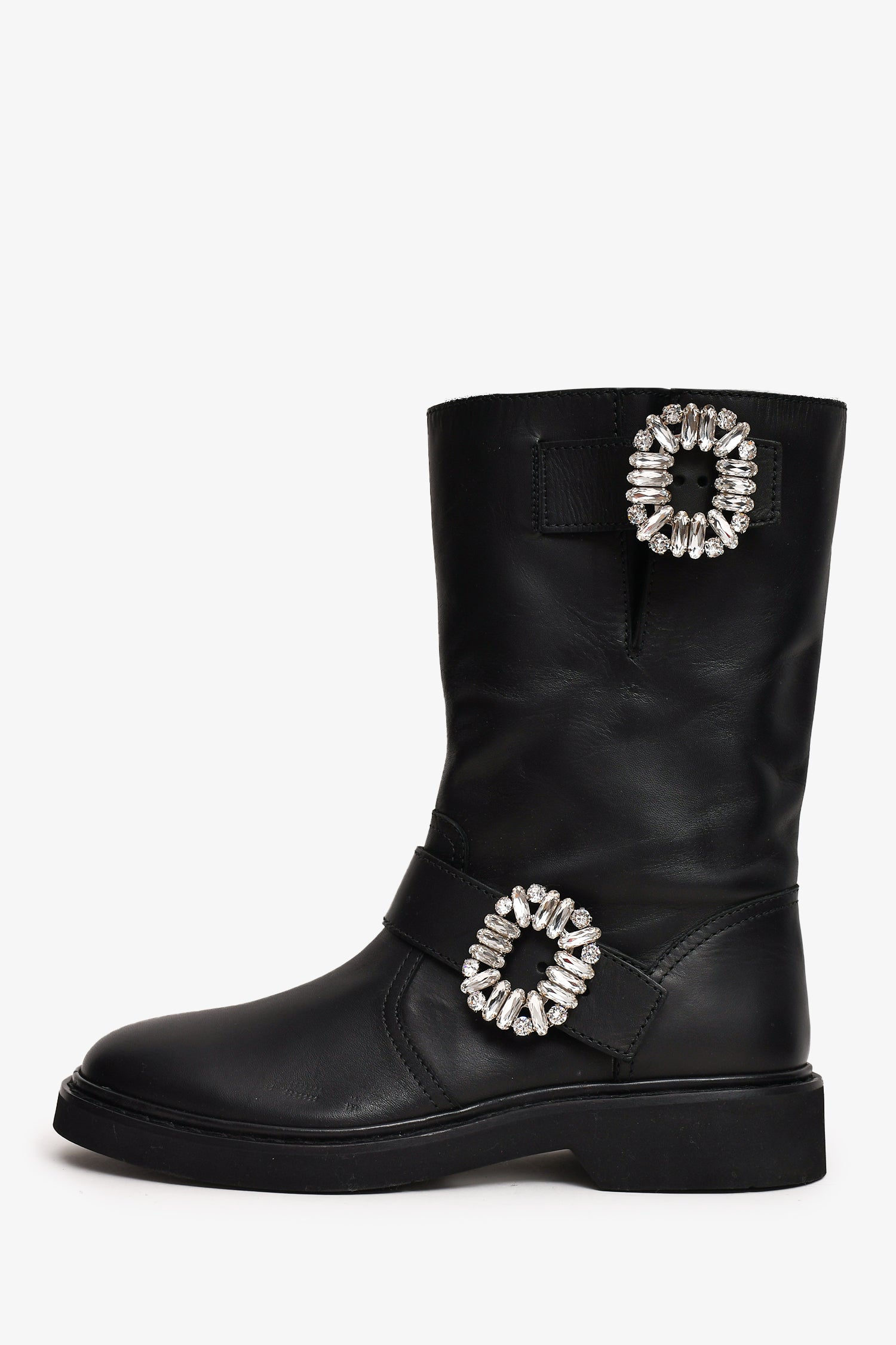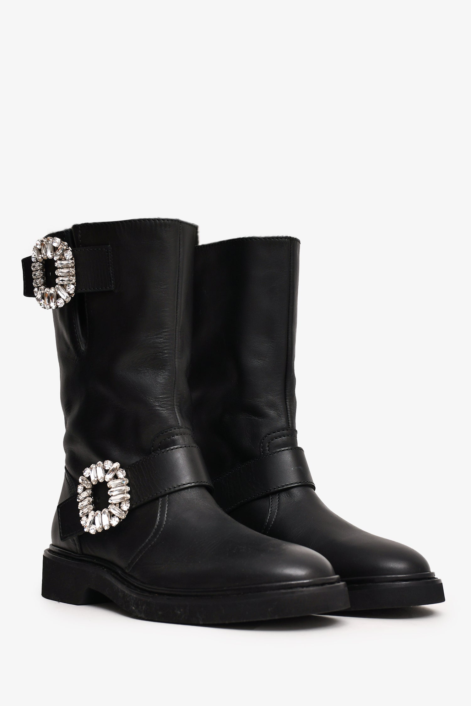 Refresh availabilityRoger Vivier Black Leather Crystal Embellished Buckle Biker Boots. Smooth leather. Rounded toe. Tonal stitching.