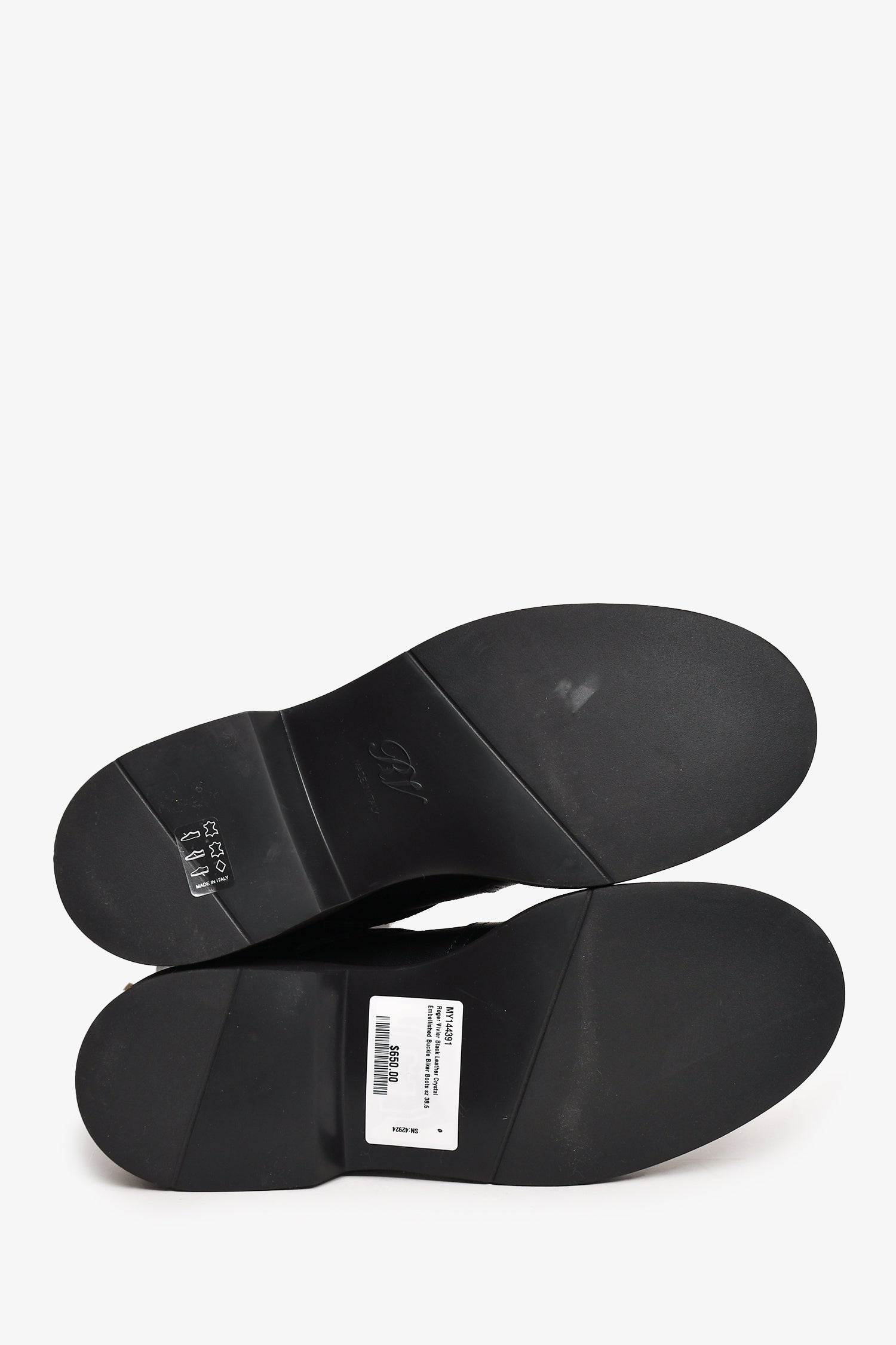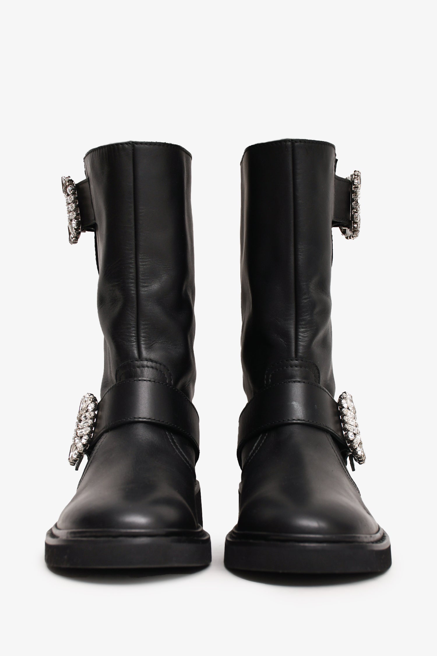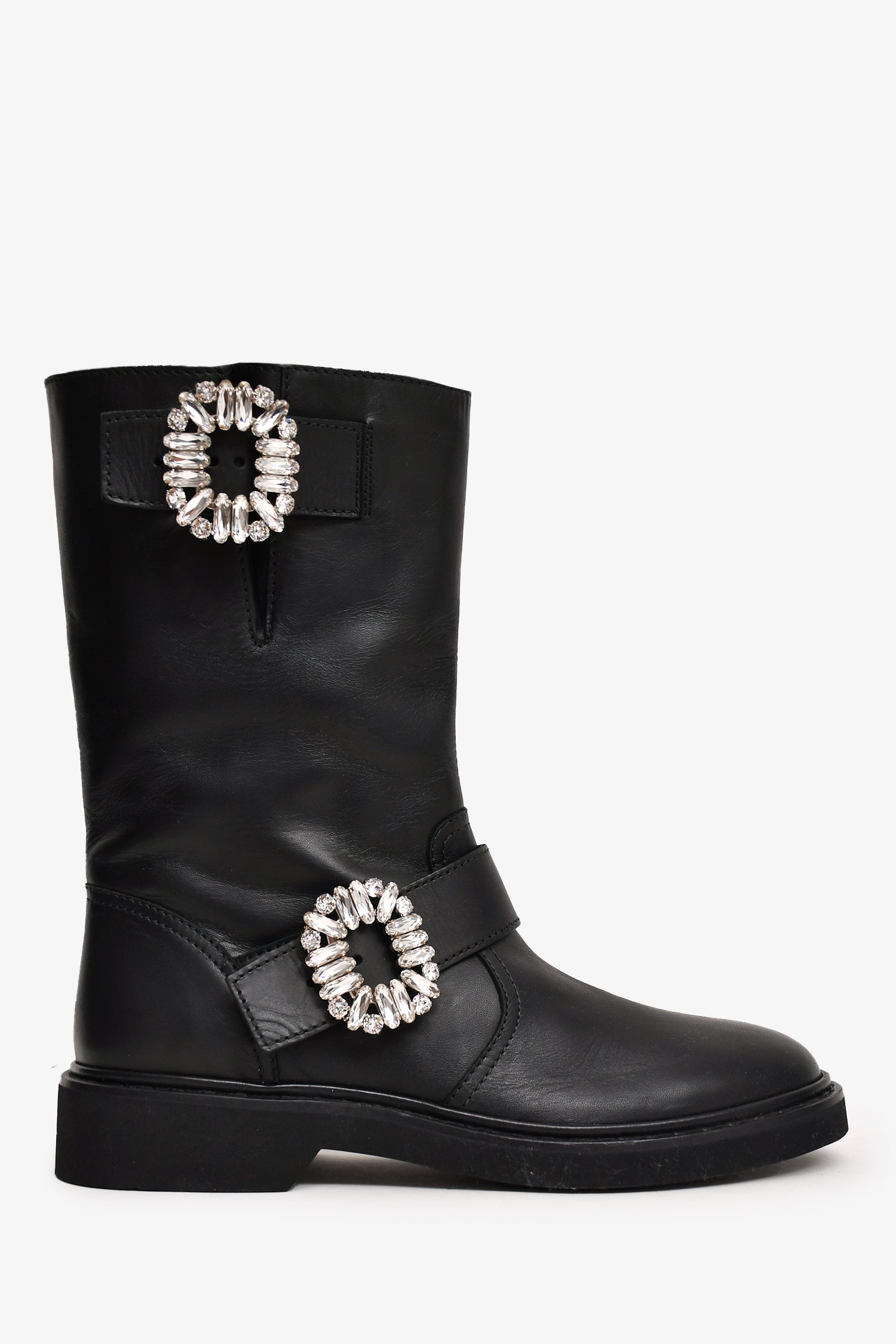 Refresh availabilityRoger Vivier Black Leather Crystal Embellished Buckle Biker Boots. Smooth leather. Rounded toe. Tonal stitching.