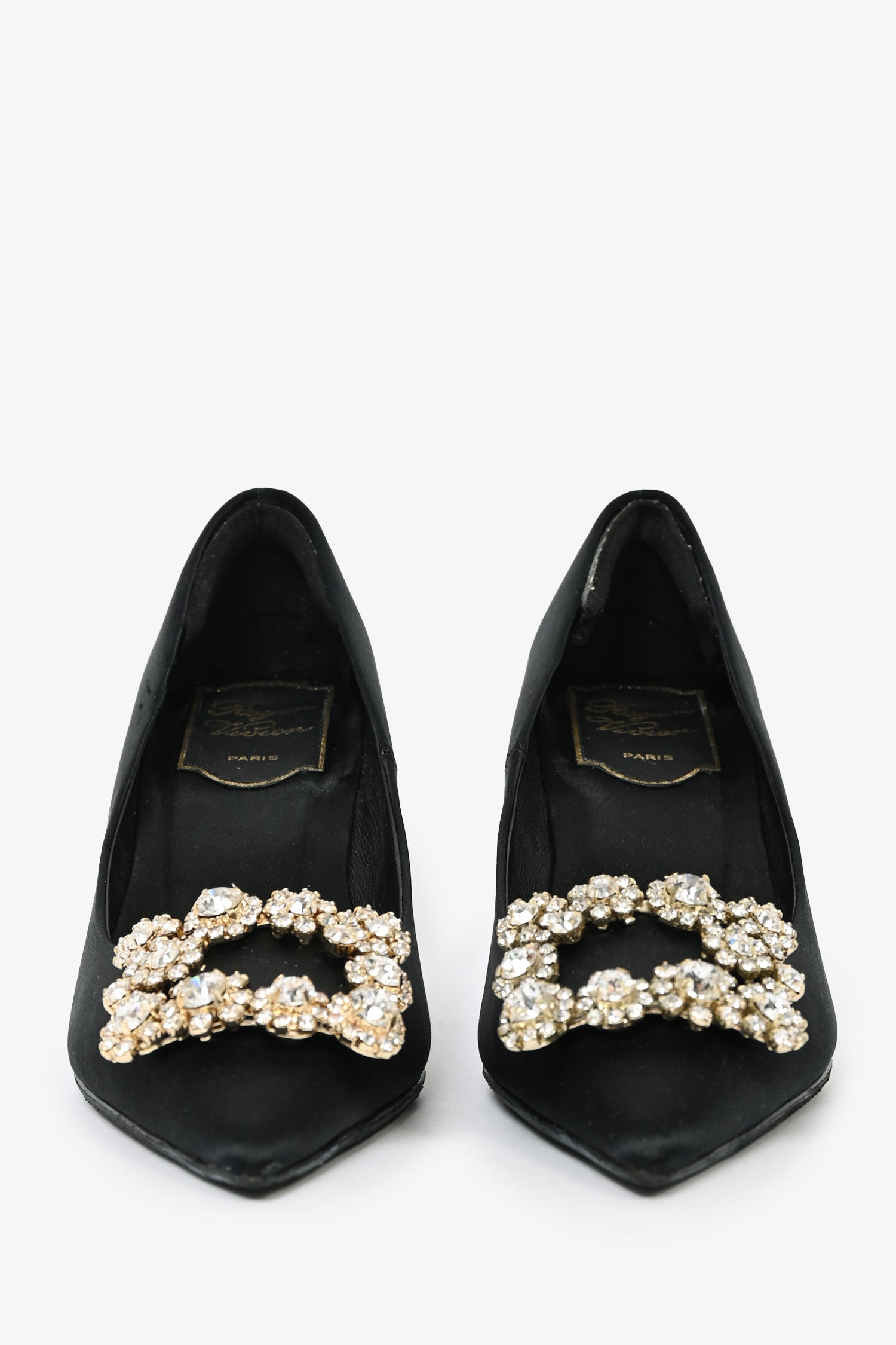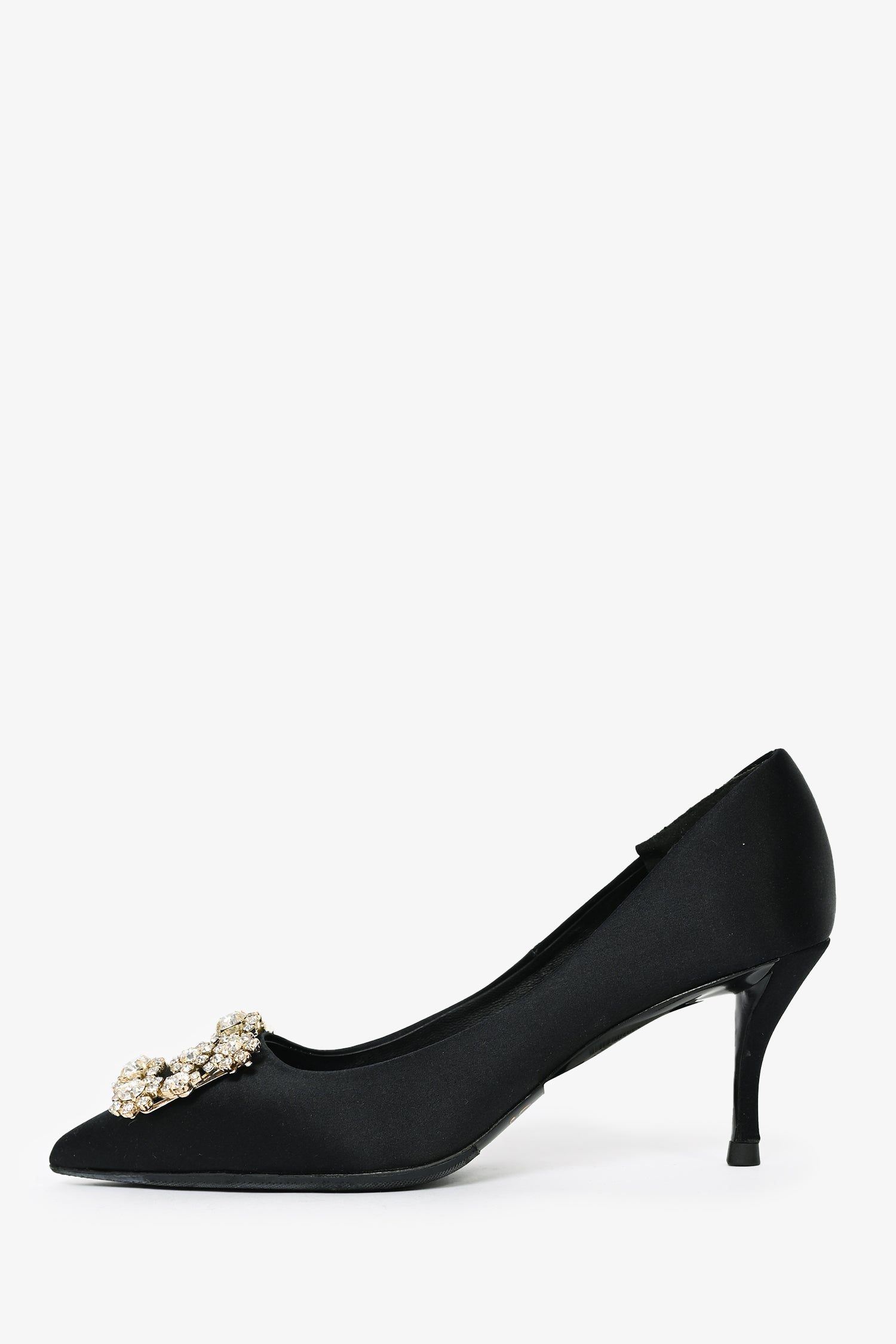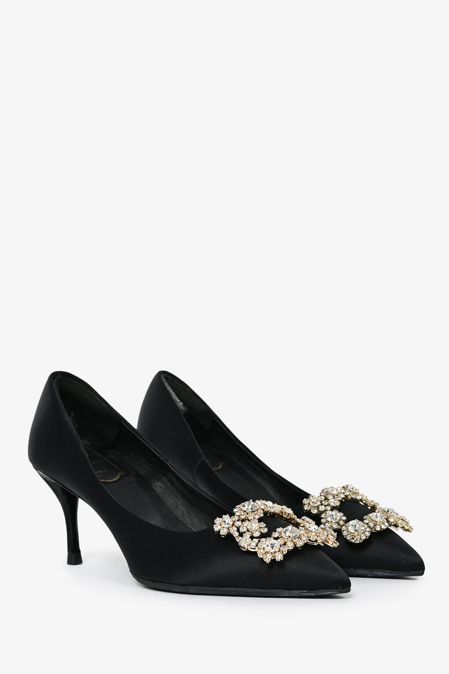 Refresh availabilityRoger Vivier Black Satin Crystal Buckle Heels. Slip-on. Pointed toe. Tonal stitching. Topy soles.