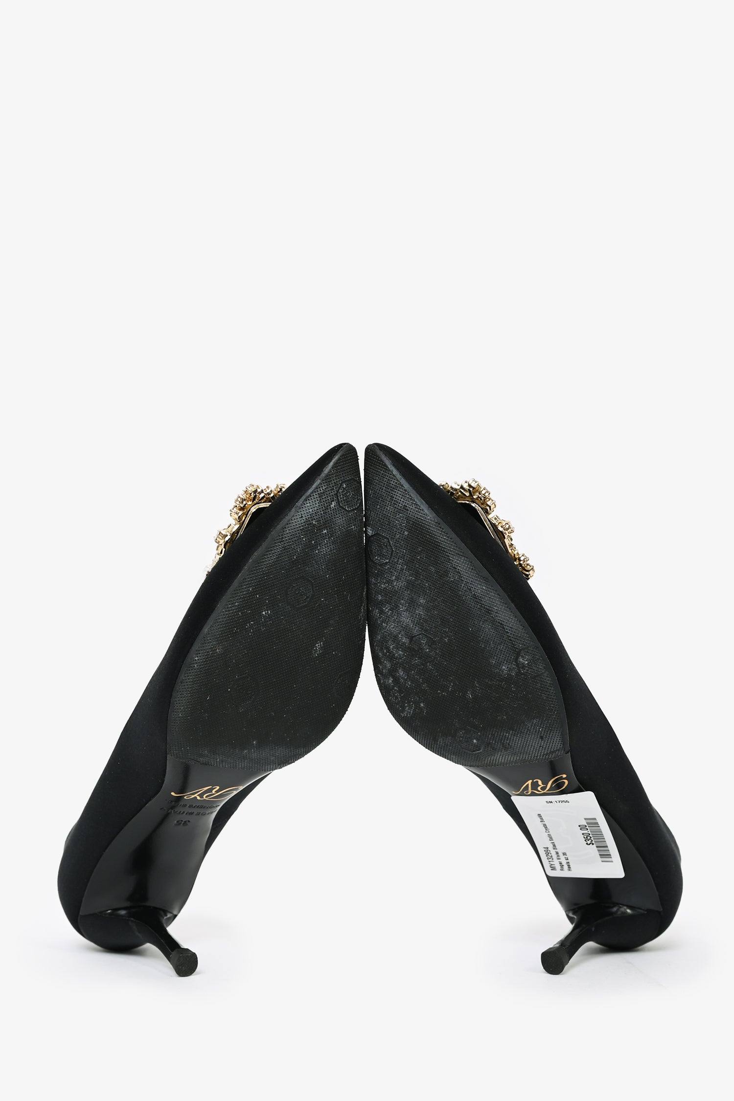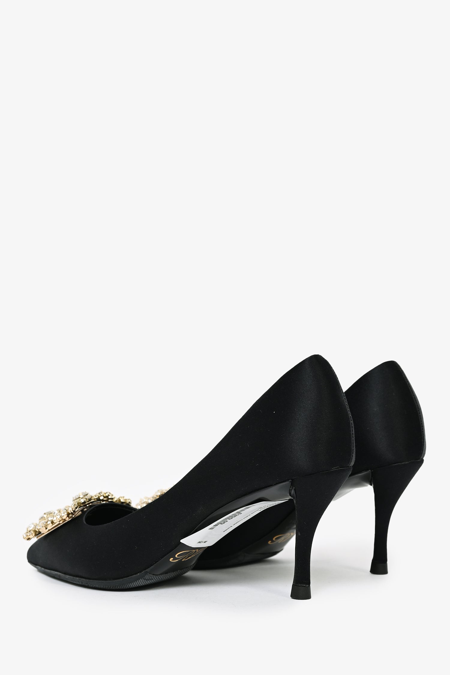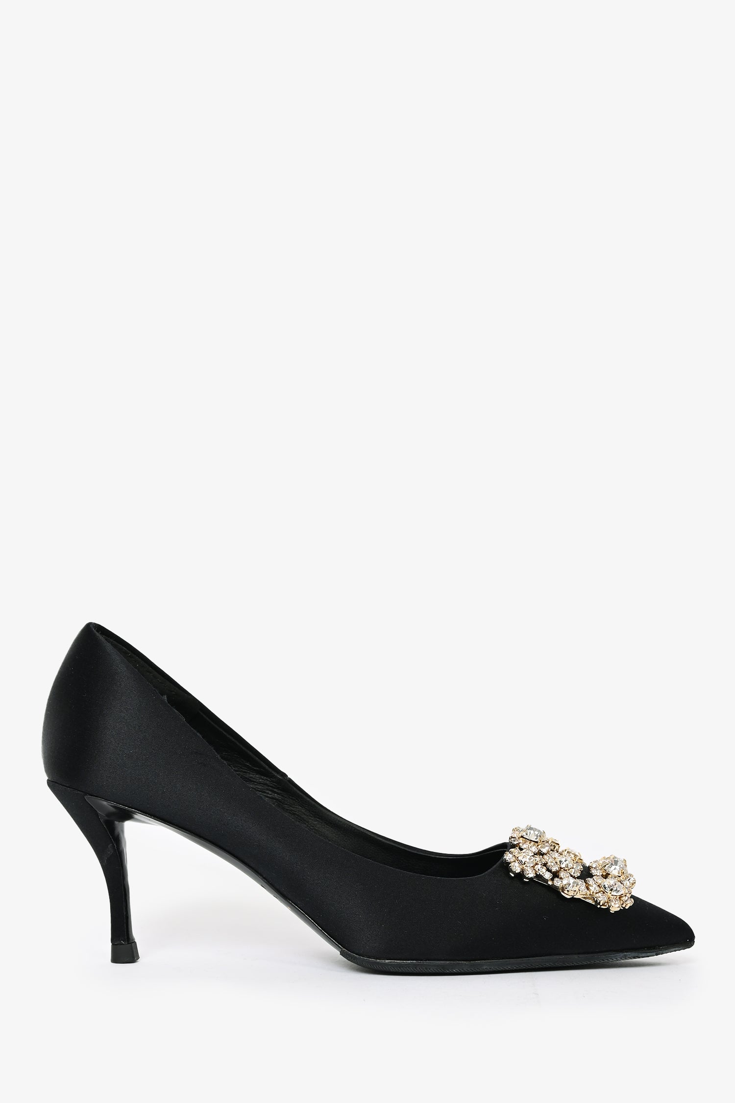 Refresh availabilityRoger Vivier Black Satin Crystal Buckle Heels. Slip-on. Pointed toe. Tonal stitching. Topy soles.