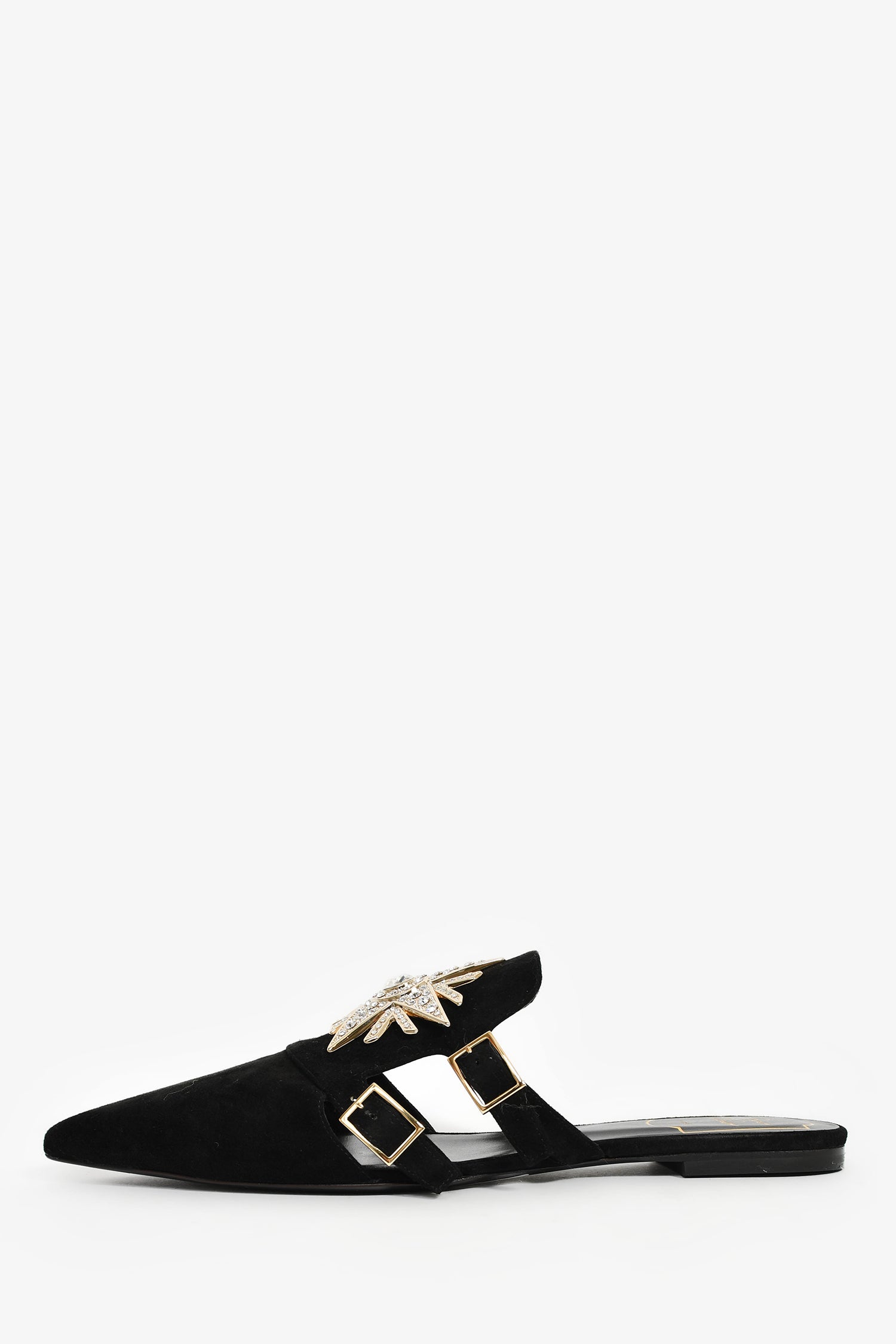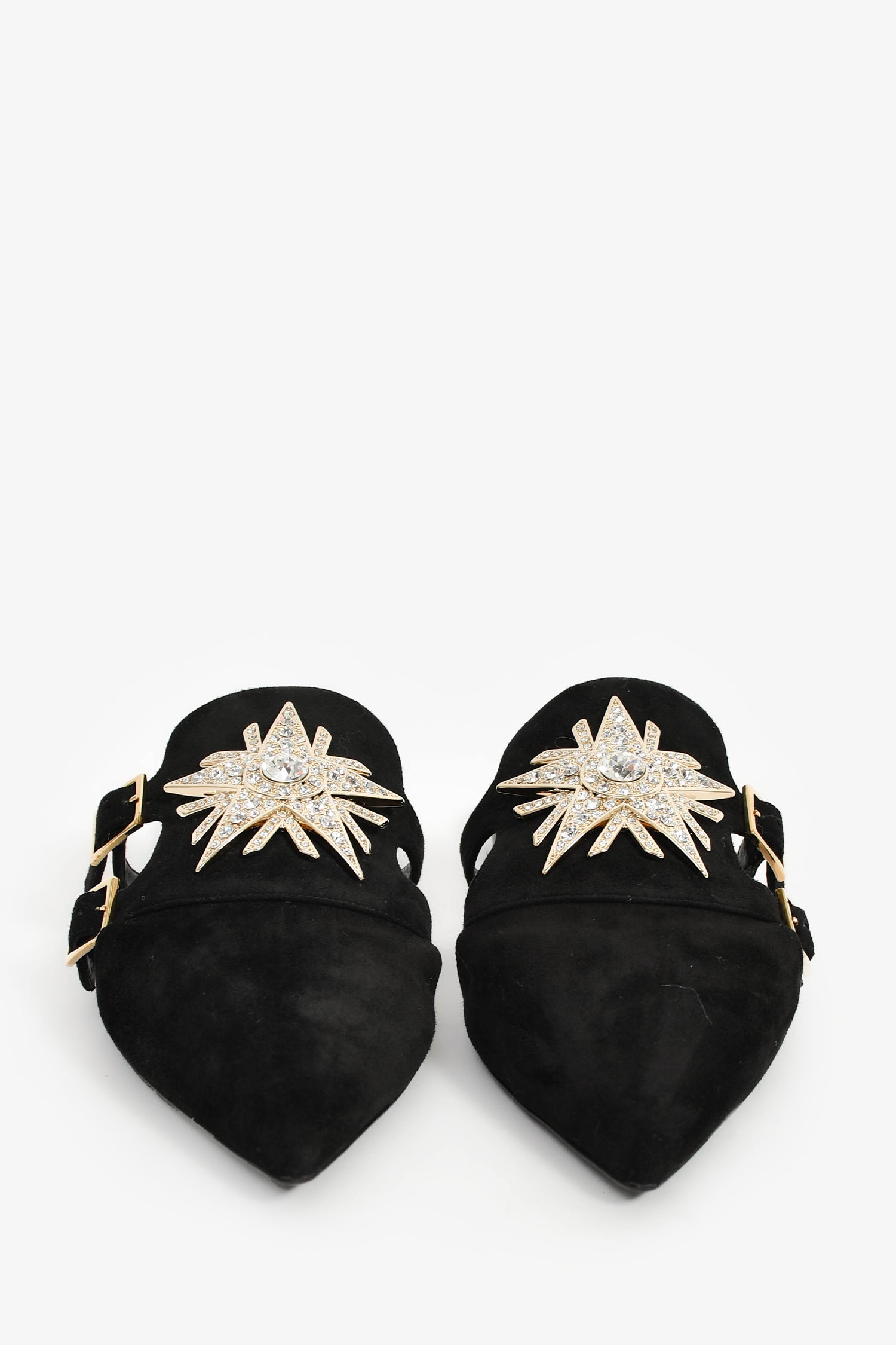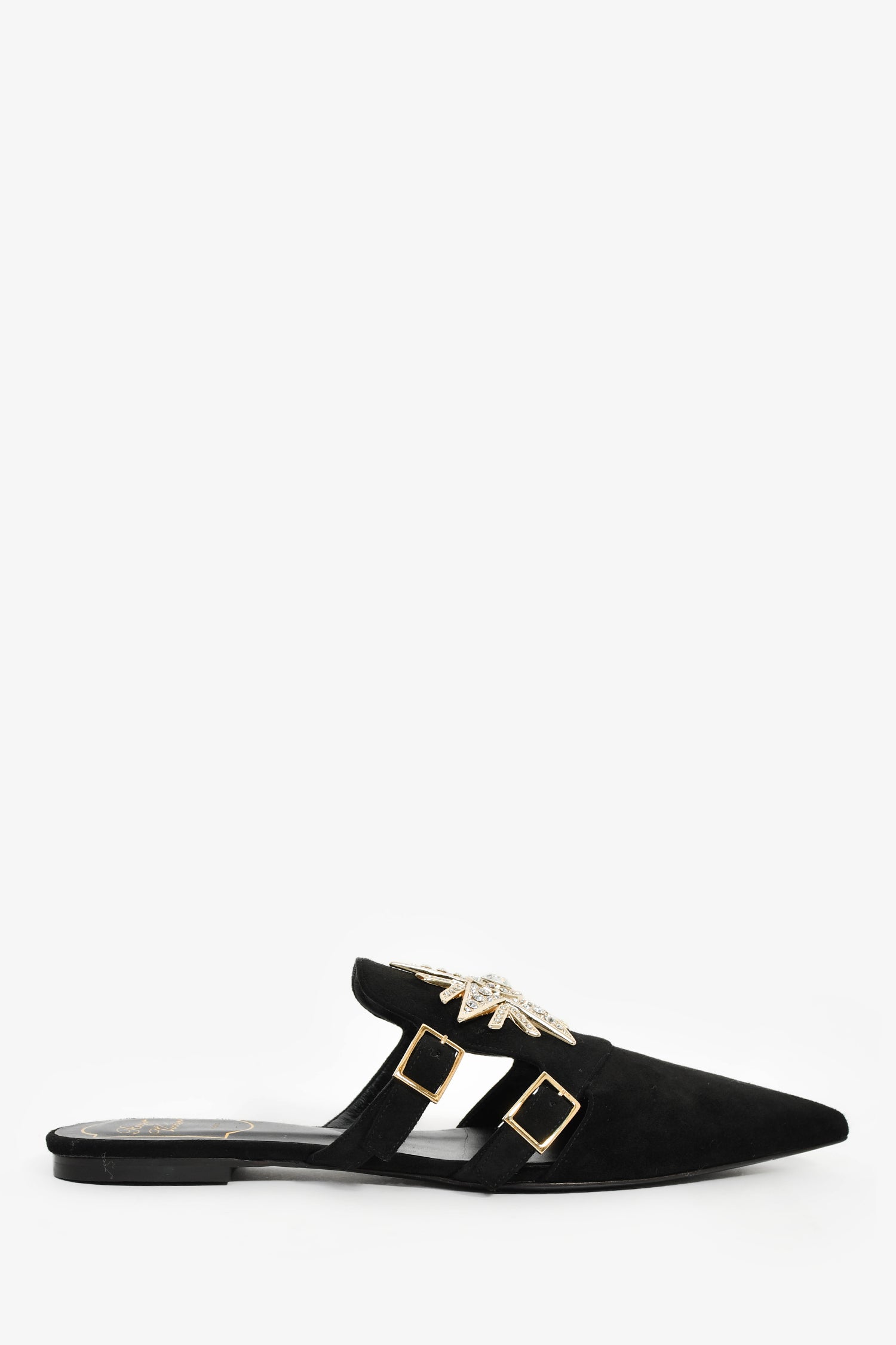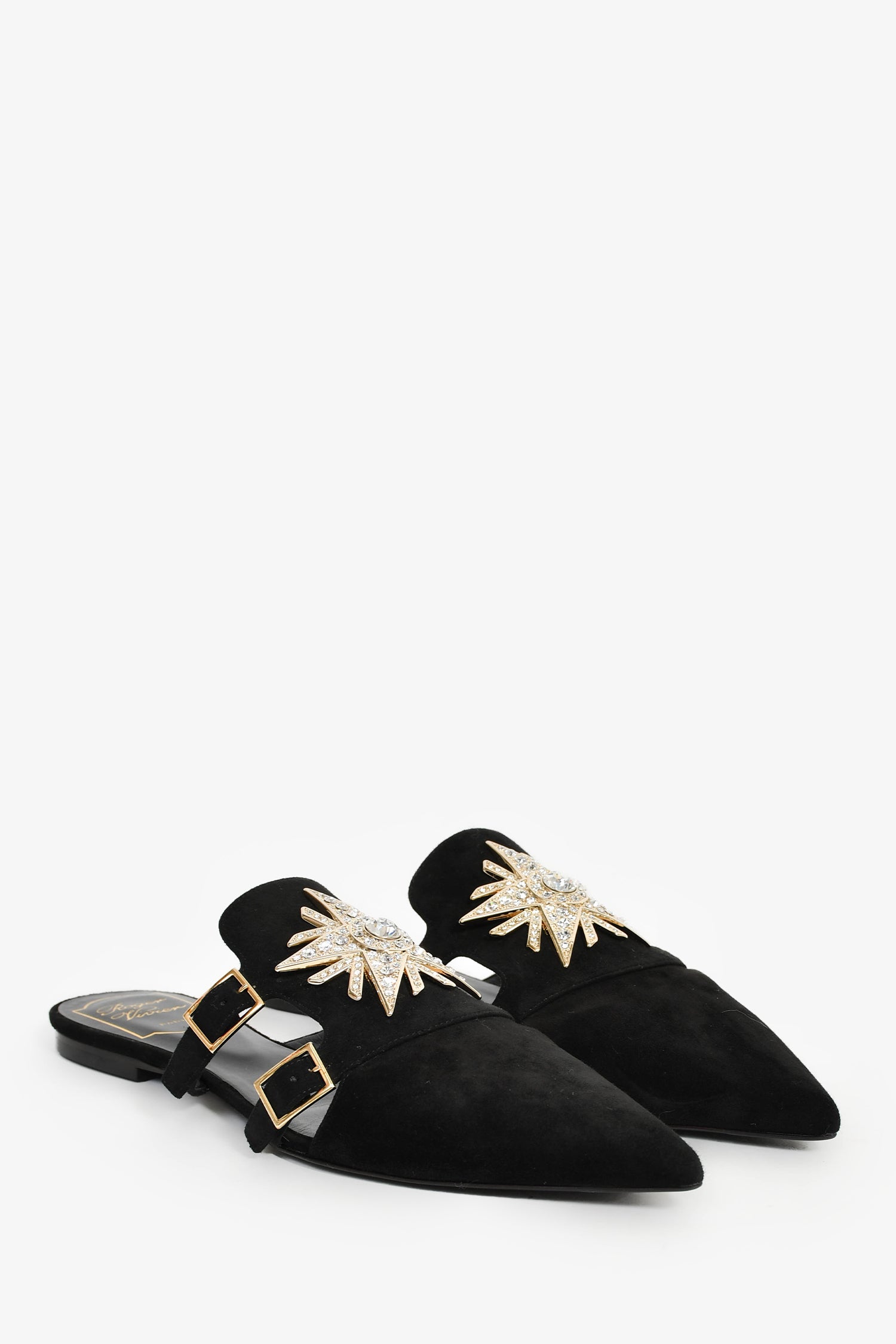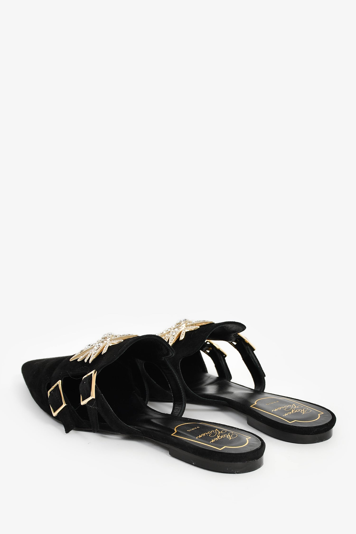 Refresh availabilityRoger Vivier Black Suede Leather Crystal Embellished Mules. Slip-on. Pointed toe. Leather insole. Gold-tone hardware. Tonal stitching.