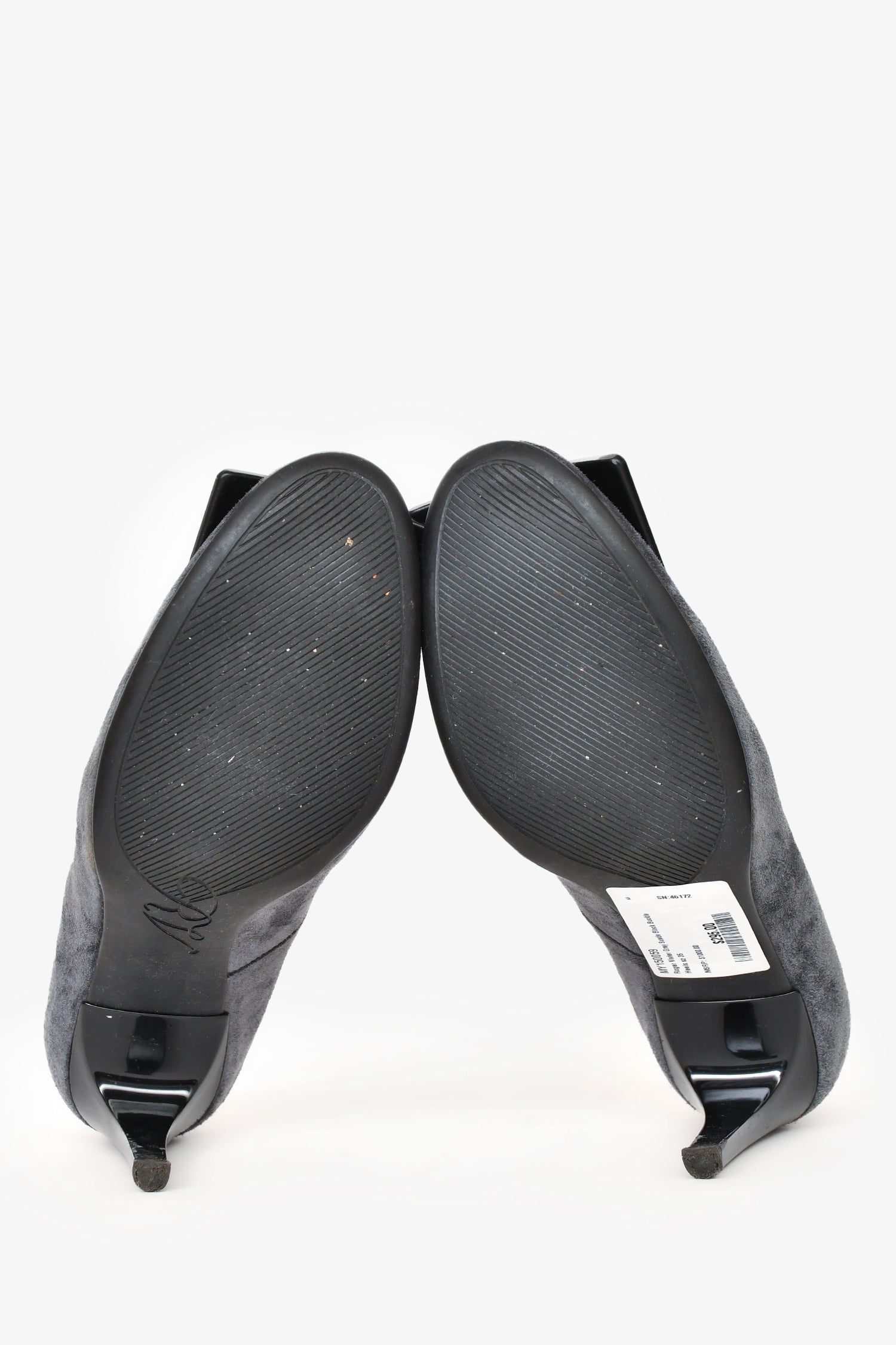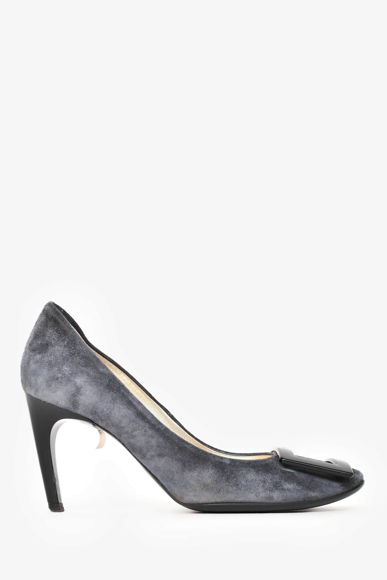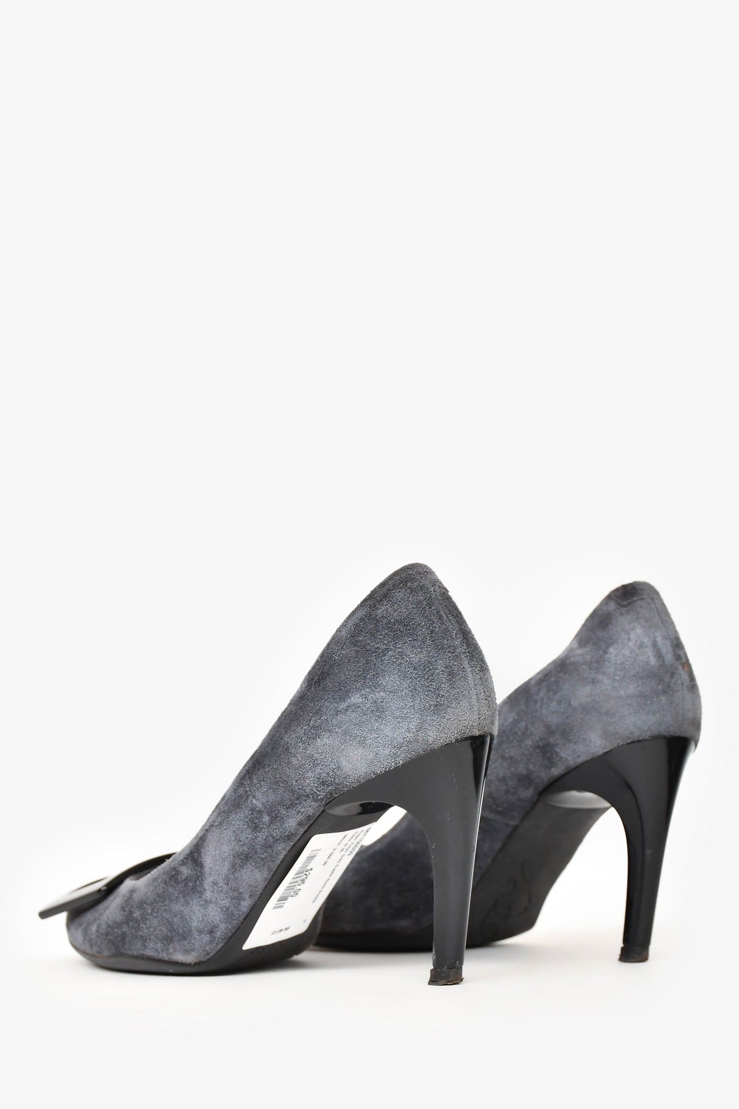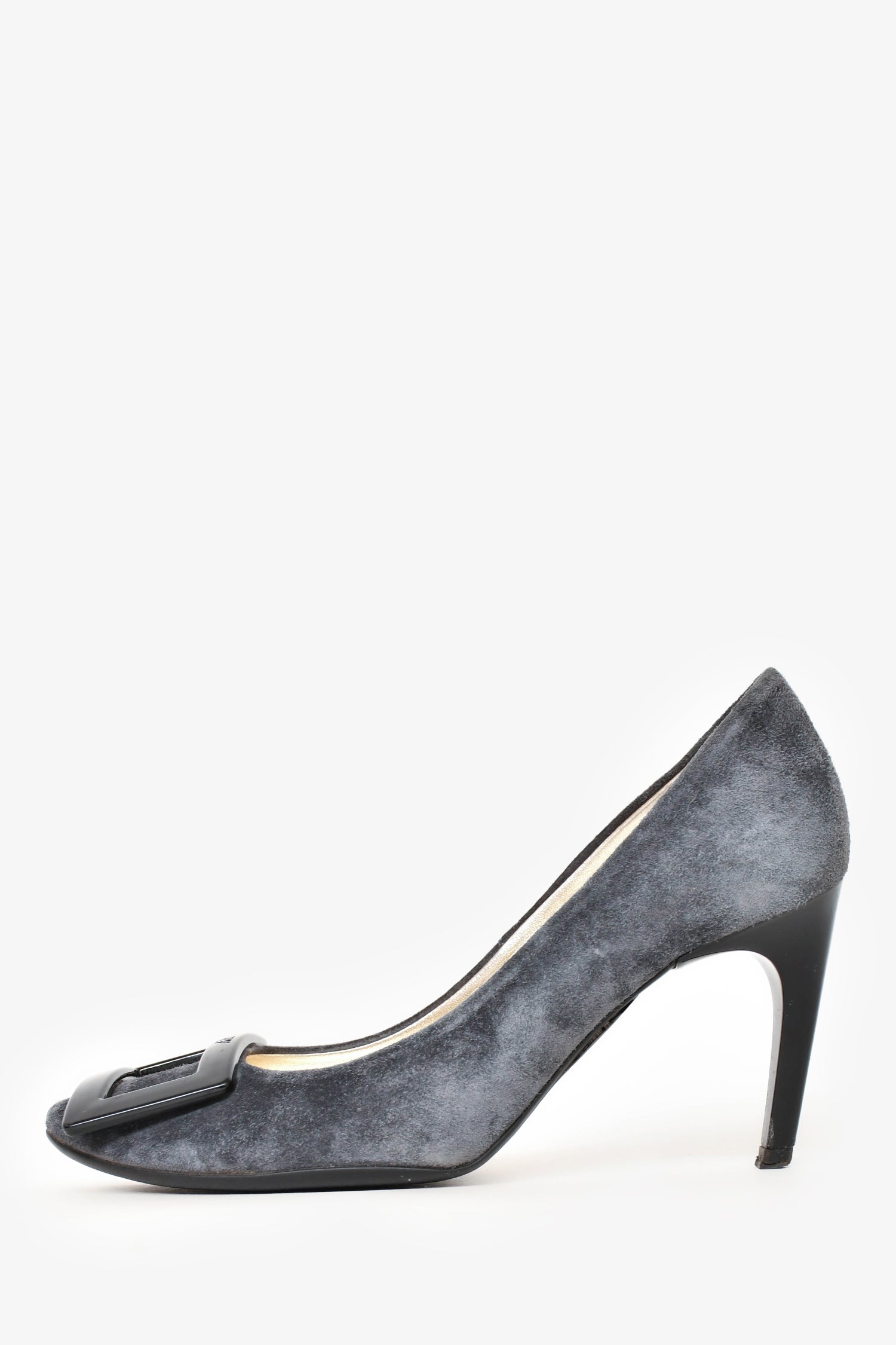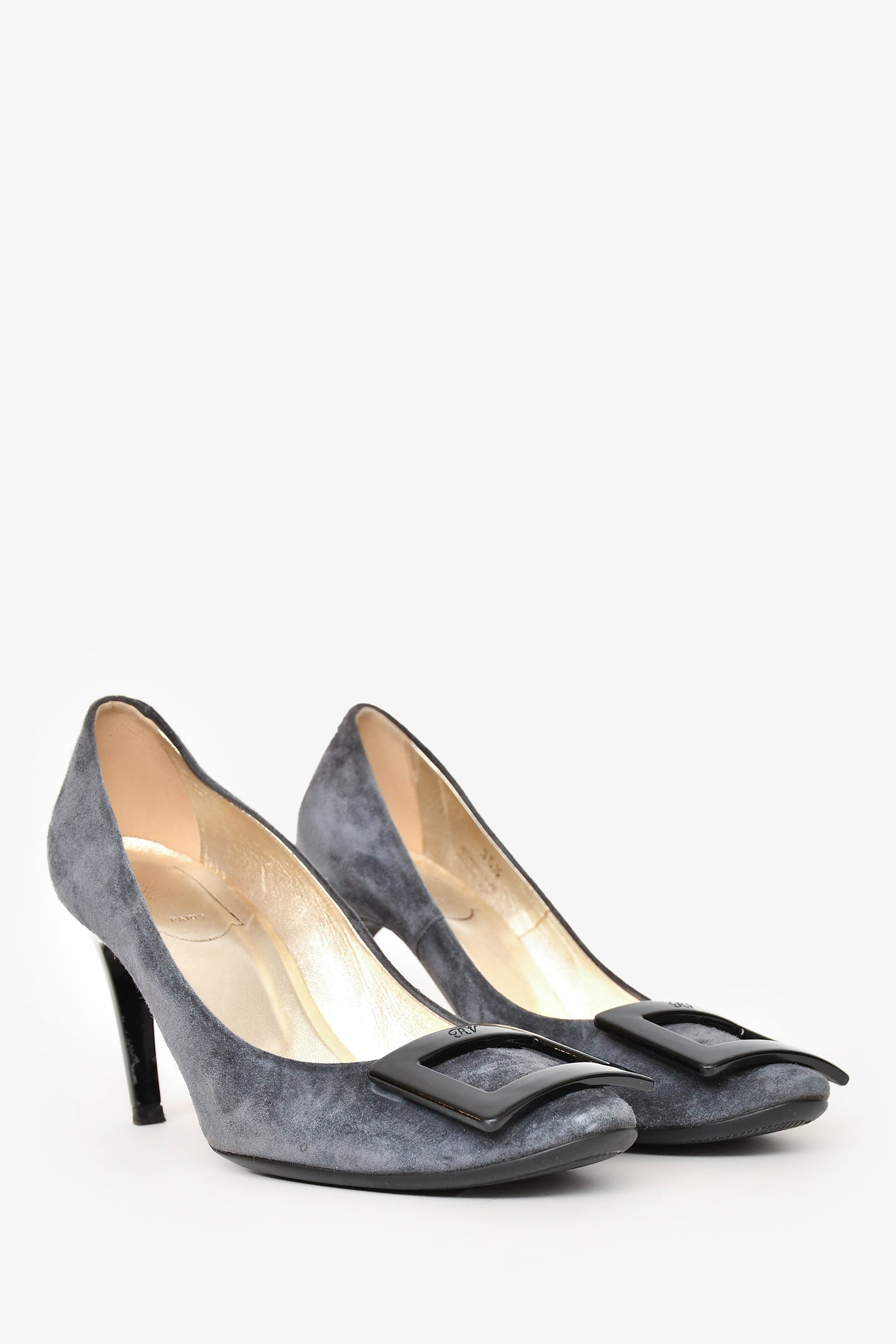 Refresh availabilityRoger Vivier Grey Suede Black Buckle Heels. Round-toe design. Tonal stitching.
