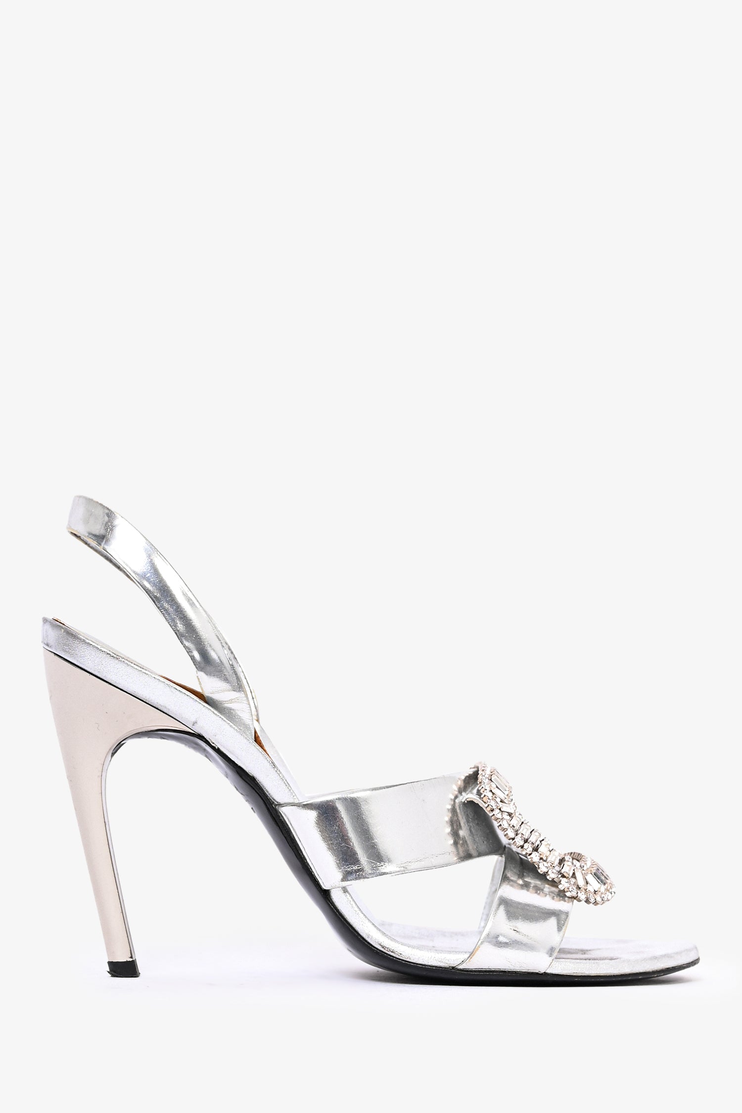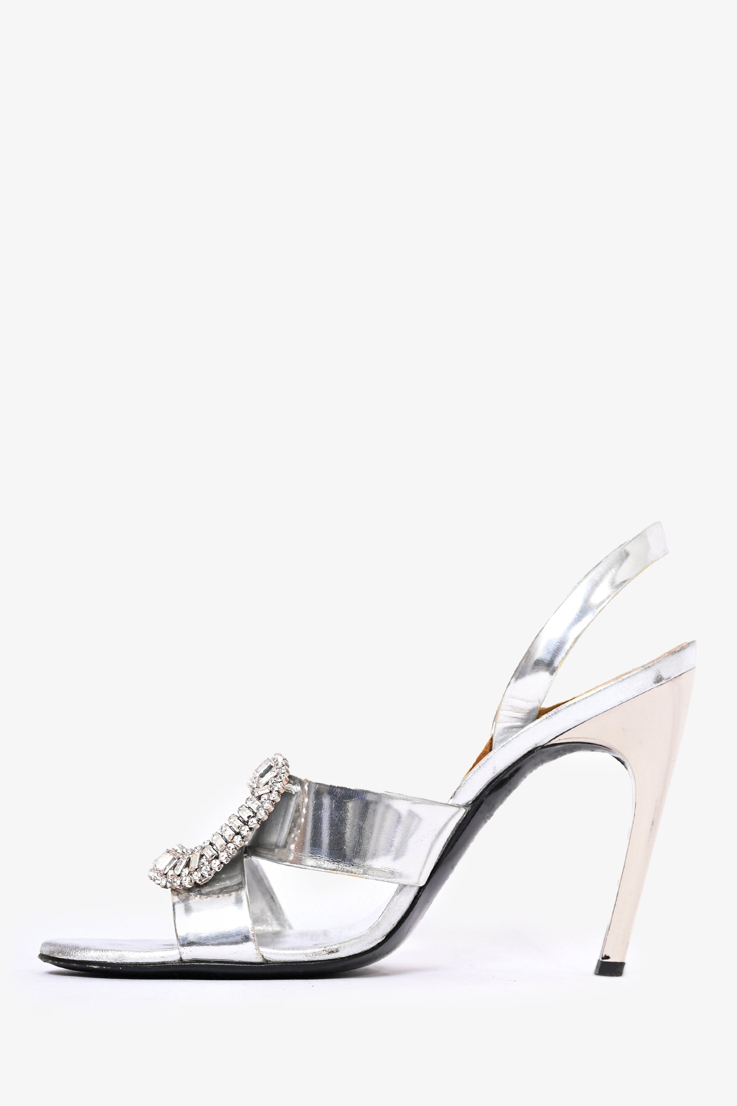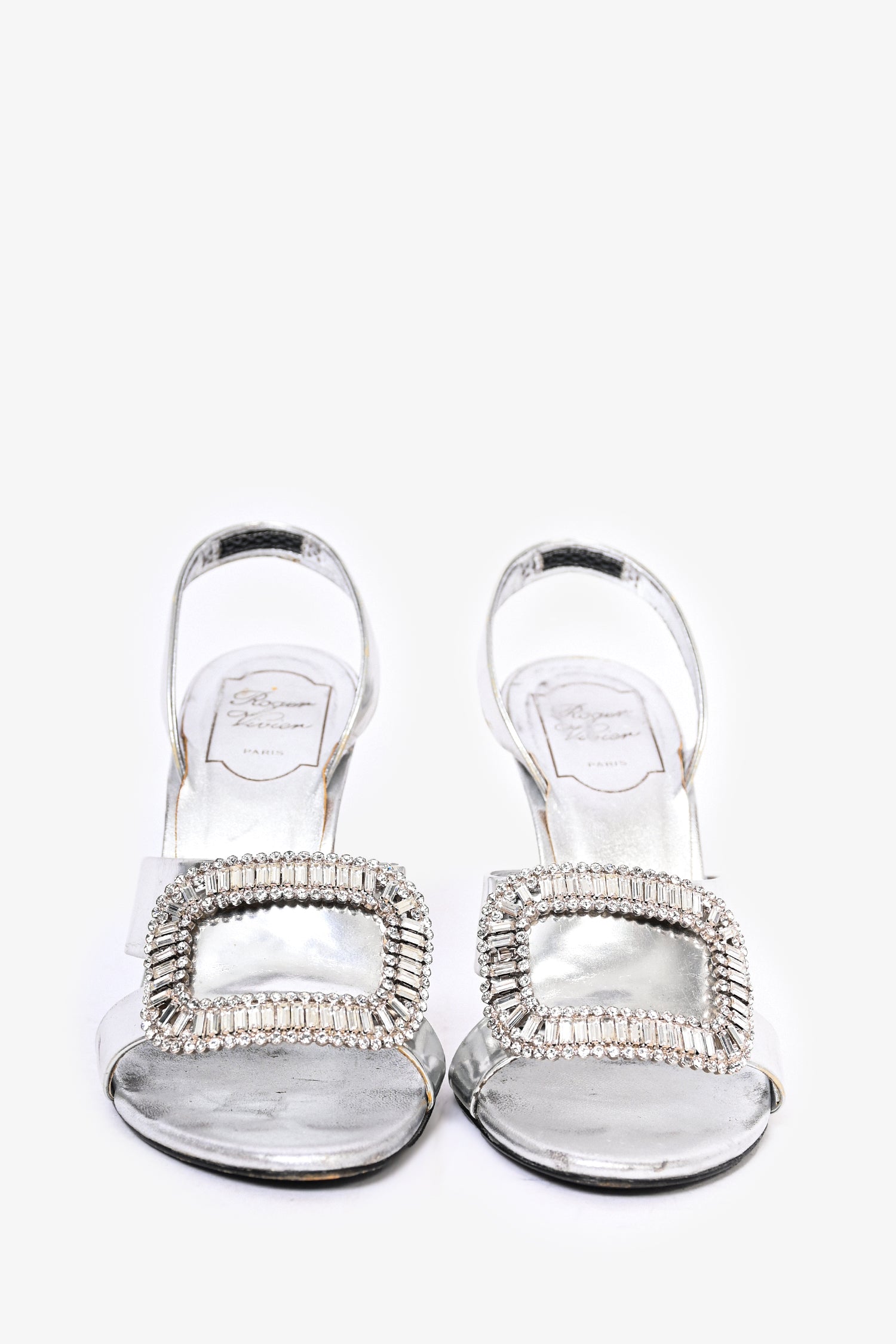 Refresh availabilityRoger Vivier Silver Leather Crystal Buckle Slingback Heels. Silver-foil outer. Single slingback strap. Crystallized buckle. Lacquered silver structural heel. Leather insole.