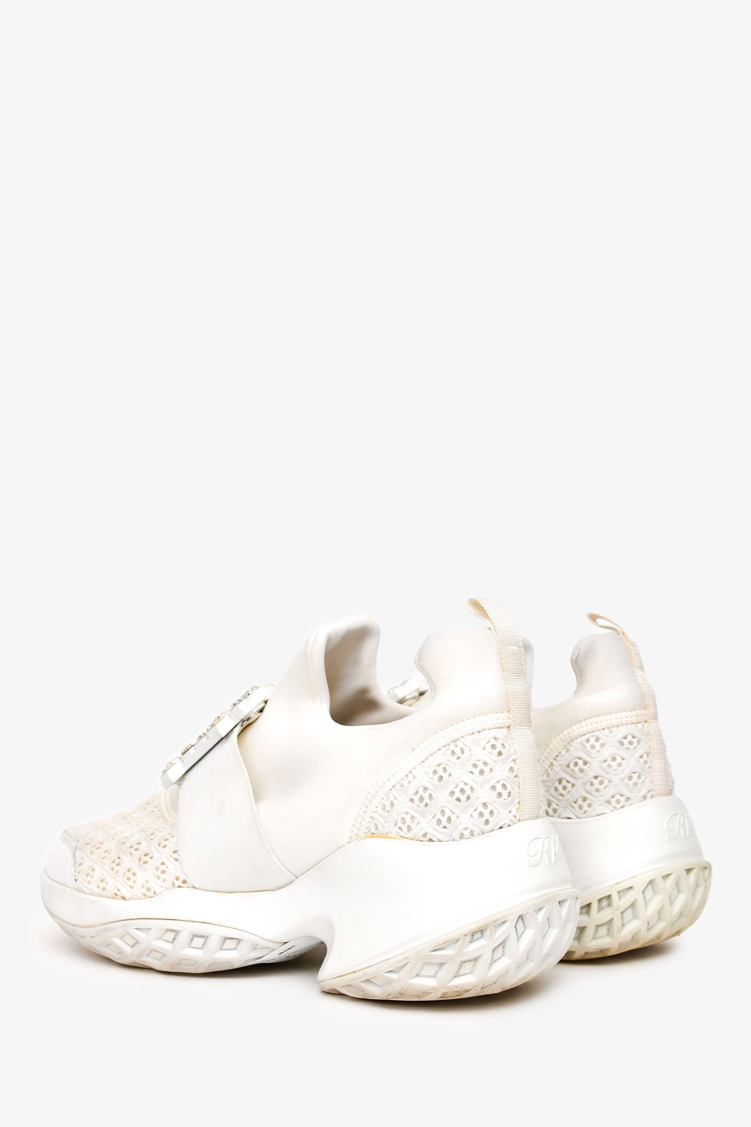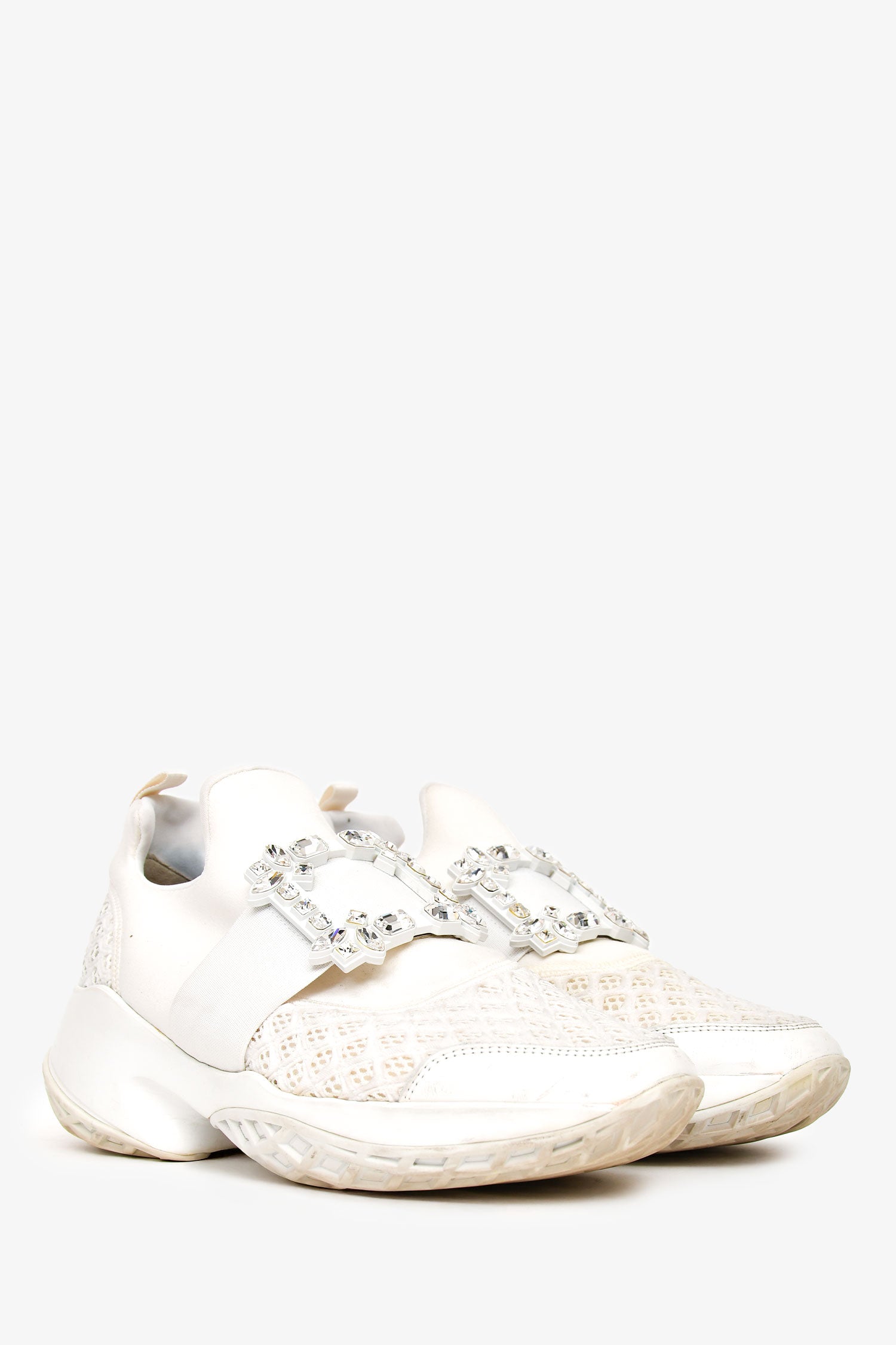 Refresh availabilityRoger Vivier White Leather Viv' Run Sneakers. Round toe. Elasticized strap with signature crystal-embellished buckle detail. Mixed leather and fabric upper. Tonal stitching.