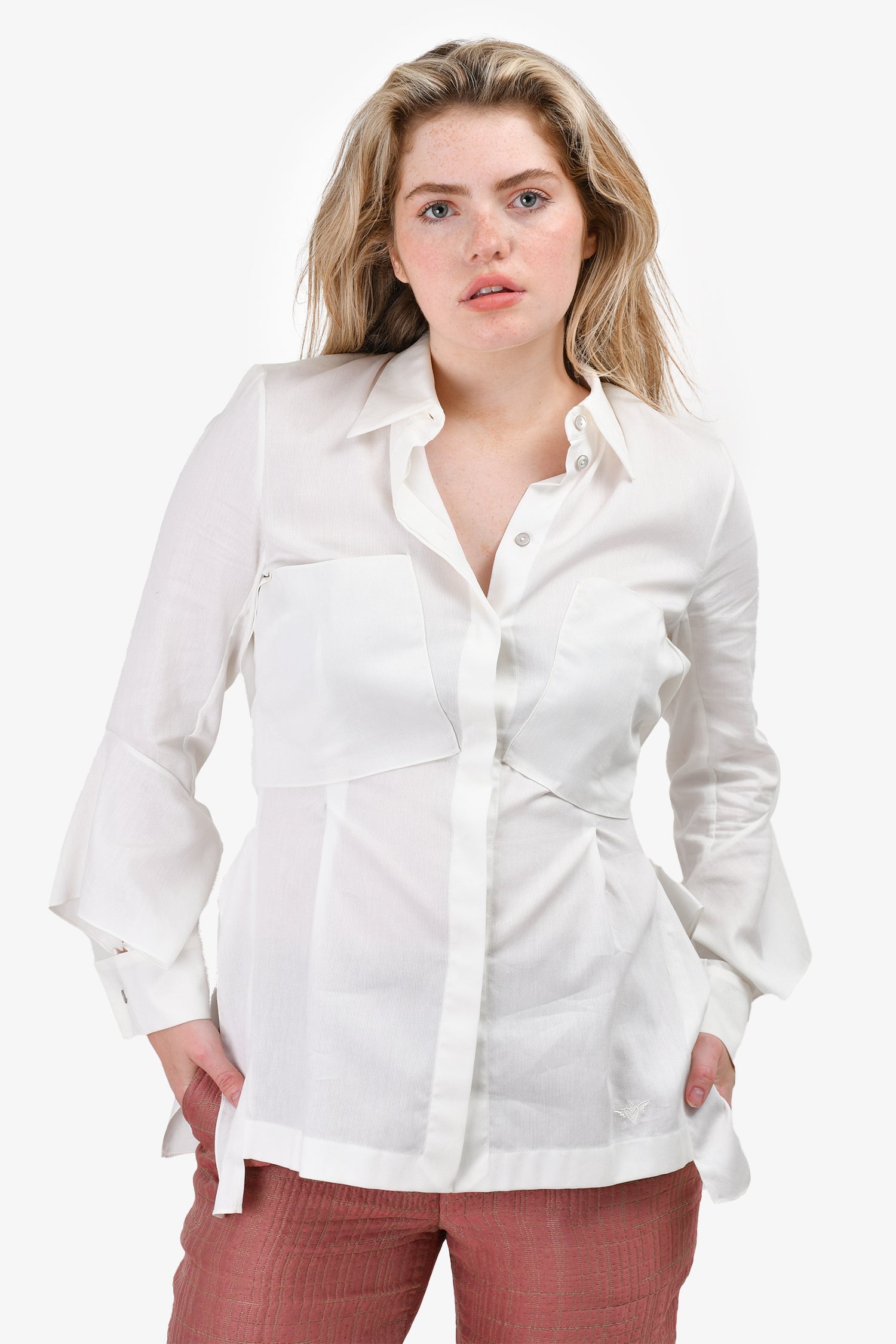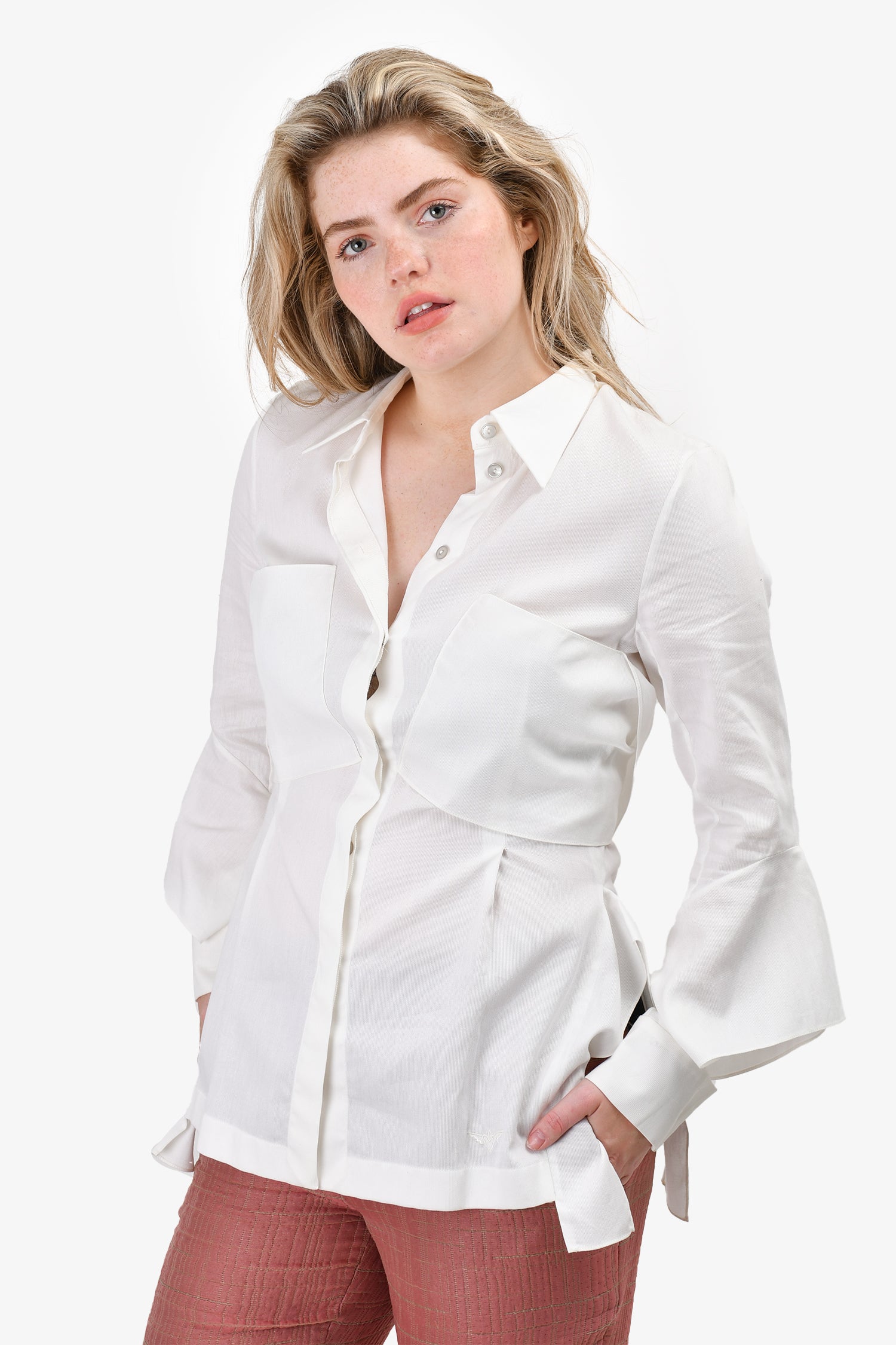 Refresh availabilityRoland Mouret White Ruffle Button-Down Top. Button closure on the cuffs. Front chest pockets.