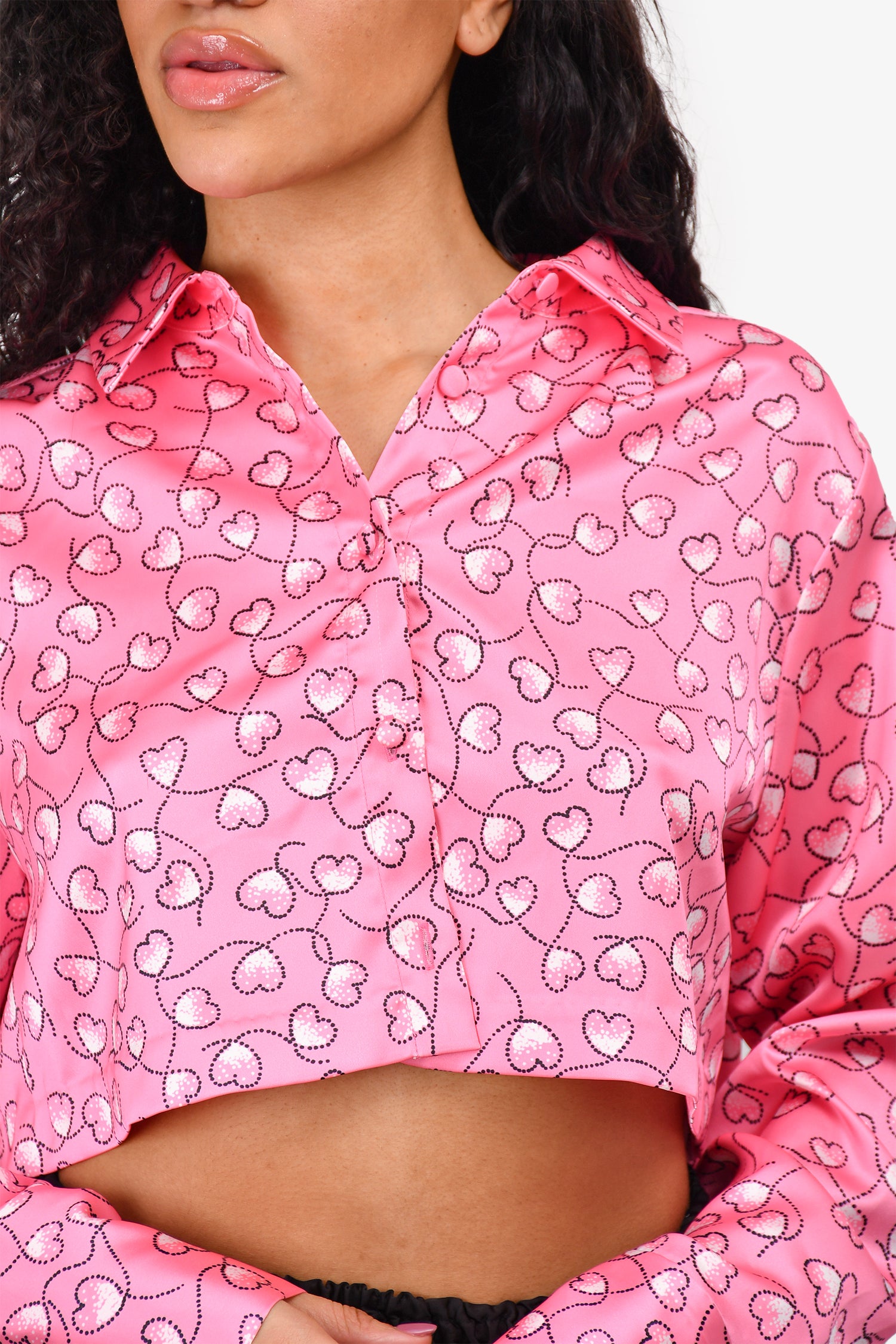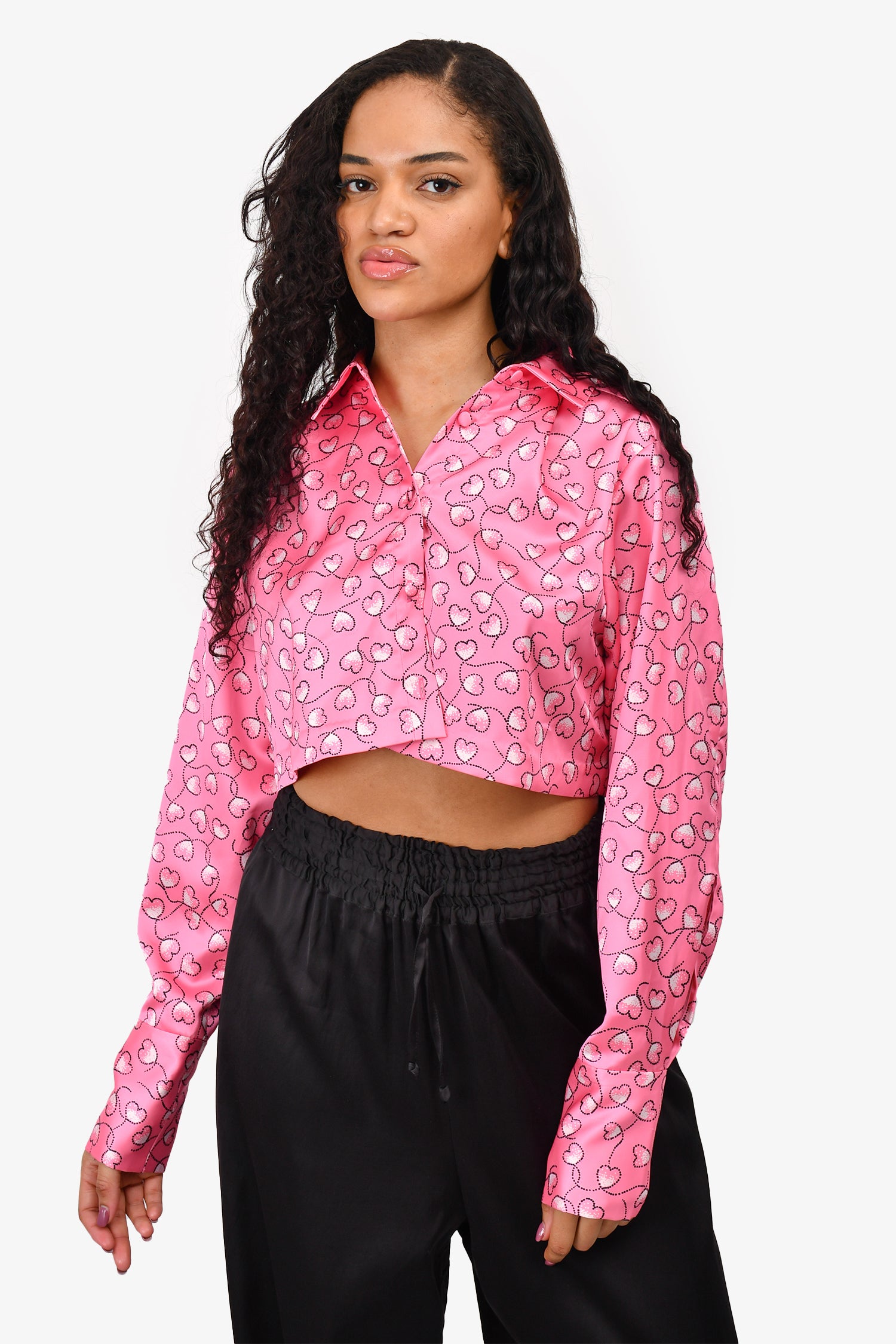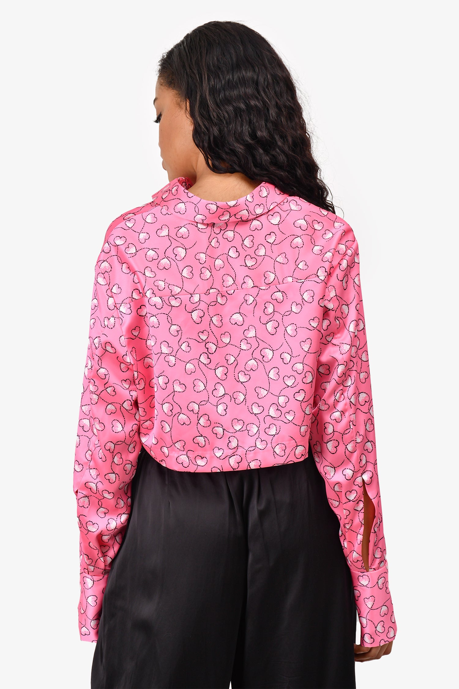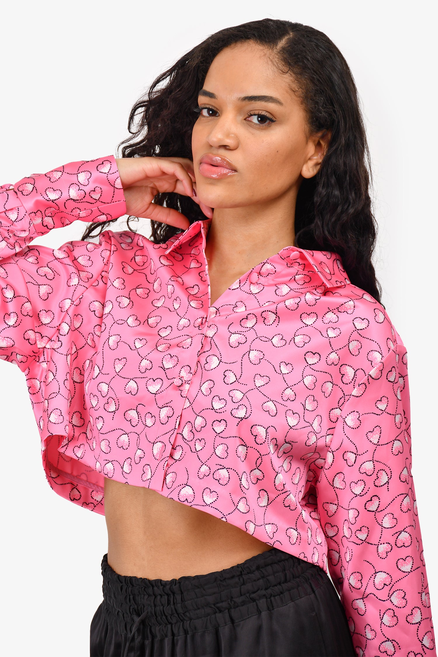 Rotate Birger Christensen Pink Heart Satin Cropped Button-Up Blouse Est. Size S/M